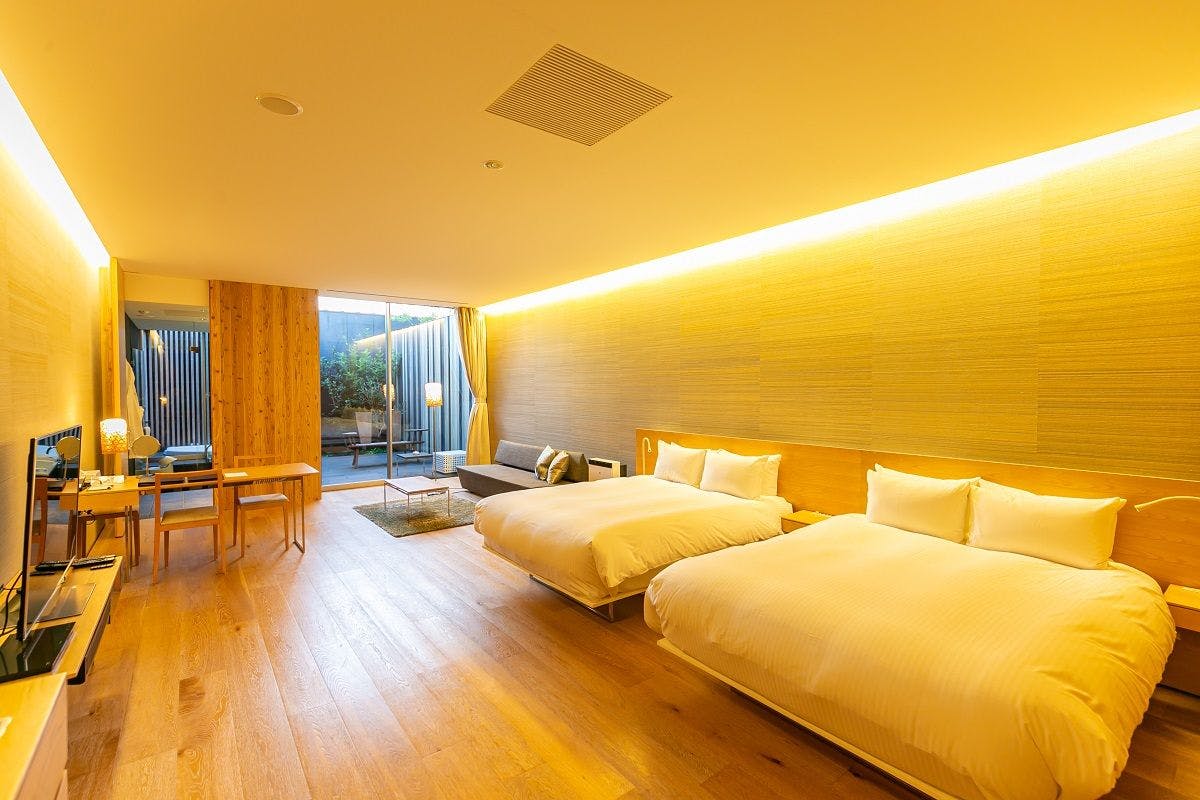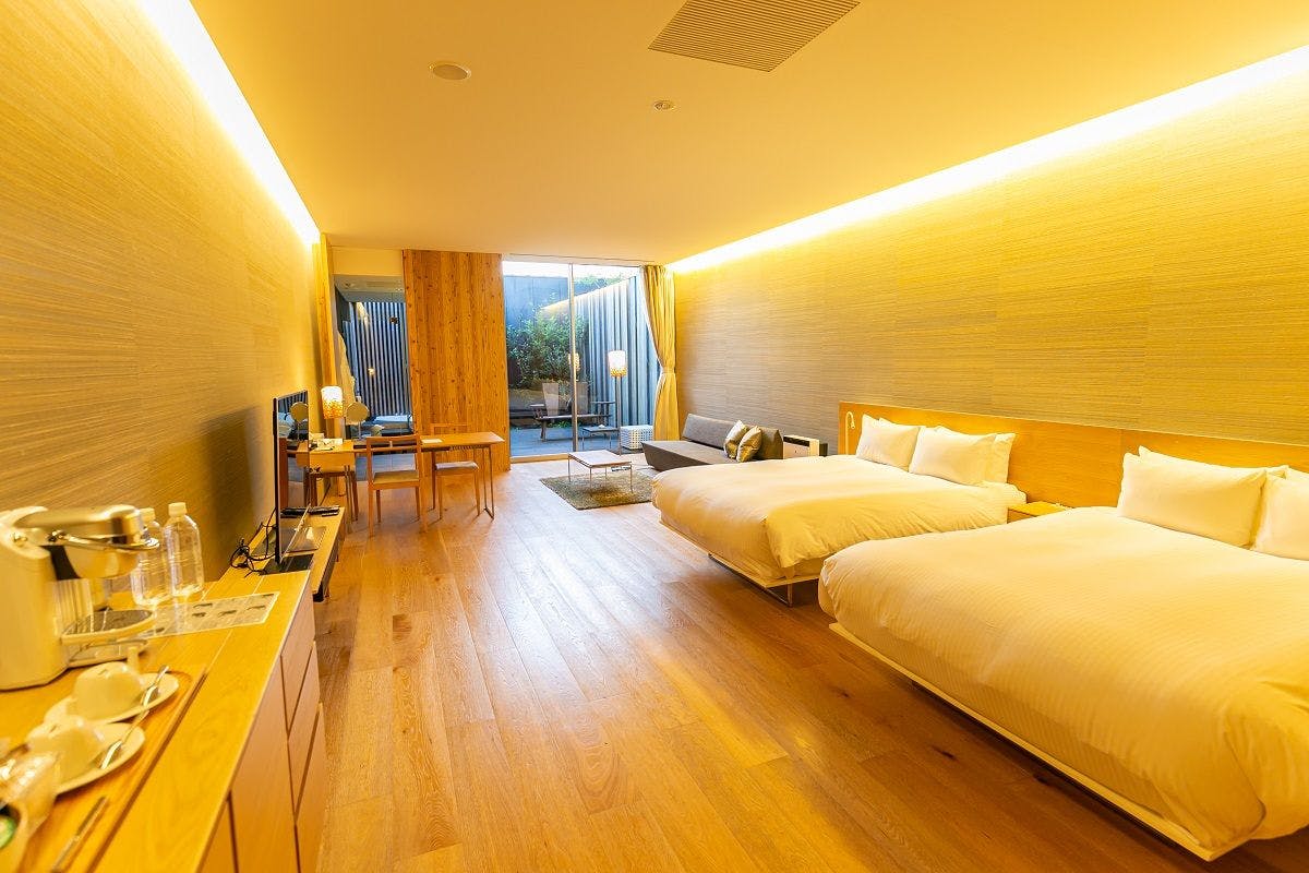 シモンズベッド ダブル2台(140cm×200cm)/客室スナック&ミニバー内無料(スパークリングワイン・ビール含)/コンプリメンタリーコーヒー/ティーパック/電気ケトル(湯沸かしポット)/全室室内禁煙(全室テラス喫煙可)/駐車場利用無料/宿泊者専用ラウンジにてウェルカムドリンク&フード(16:00~22:30)/加湿器/ブルーレイディスク対応DVDプレーヤー/高速インターネット回線利用無料(有線LAN)/Wi―Fi/42インチ液晶テレビ/ダブルベーシン/温水洗浄便座(ウォシュレット)/