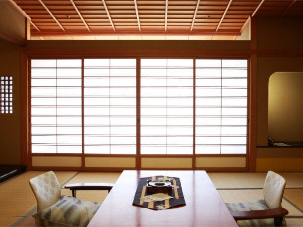 当館人気NO.1のゆったりモダンなデザインの和洋室。和室10畳+洋室(2ベッドルーム)+広縁とのんびり過ごせる客室です。和室と洋室の間には仕切りで分けることも可能です。お部屋からは日本庭園と柴山潟が一部ご覧頂けます。【イメージ】
