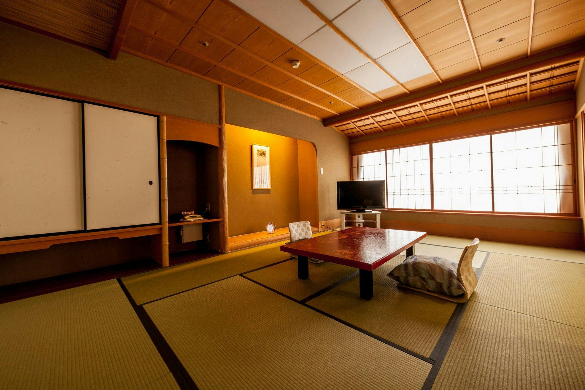 【ゆったりサイズの和洋室】風呂なしトイレあり室内は和室+ベッドルーム(ツイン)+踏込み+寛ぎスペース。和室と洋室を使い分けることも可能です。内装はおしゃれな和モダンタイプ!お部屋からの眺望は日本庭園と柴山潟が一部ご覧頂けます。大浴場に近い部屋なので風呂が無くても気にならない方へオススメ!<地デジ><ウォシュレット>完備