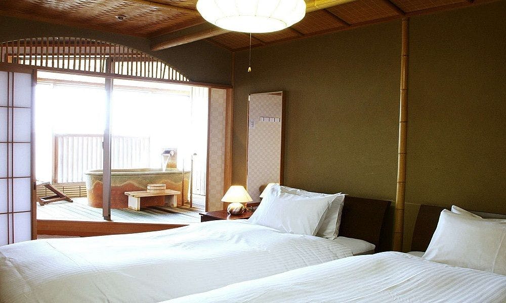ツインベッドルームに畳スペースのついたコンパクトで落ち着いた雰囲気のお部屋です。お部屋からは日本庭園と柴山潟が一部ご覧頂けます。※室内の露天風呂は温泉ではありません。【イメージ】