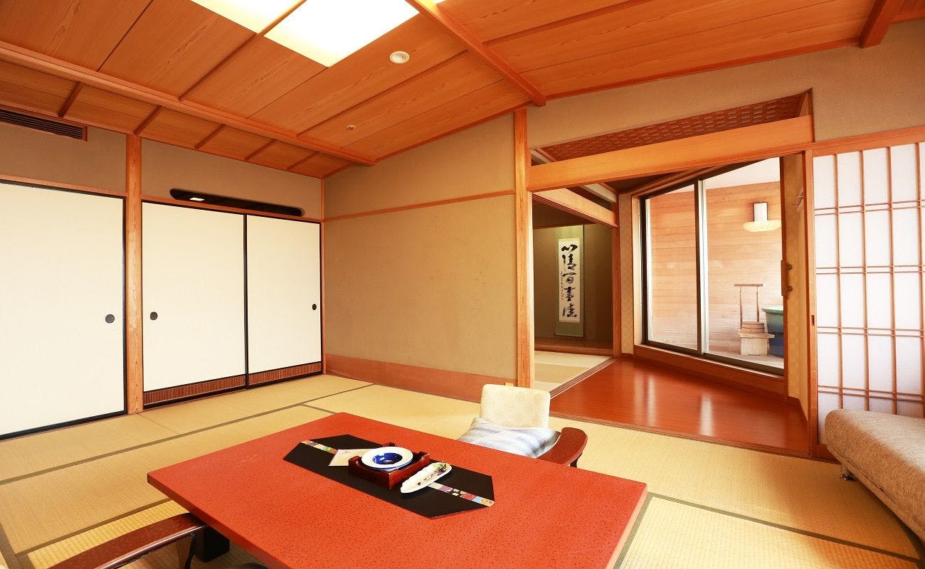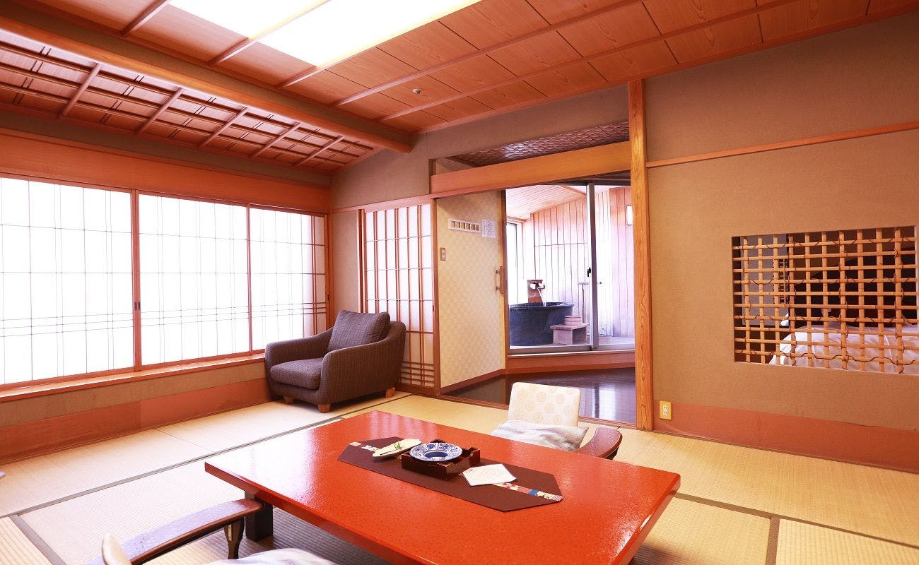 源泉100%の露天風呂付客室です。お部屋は【和室12畳】+【次の間6畳】+【踏込み】と広々。お部屋とお風呂からは柴山潟(湖)一望いただけます。いつでもお好きな時に温泉をお楽しみいただけます。※露天風呂に洗い場はございません。