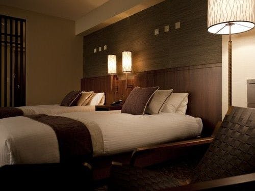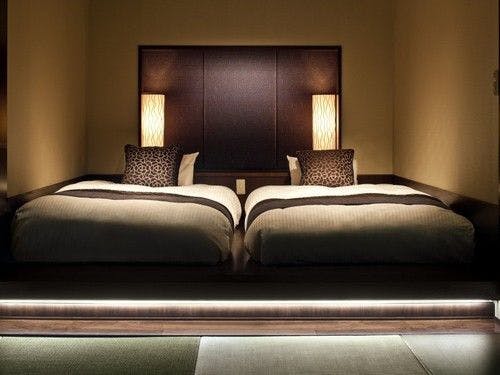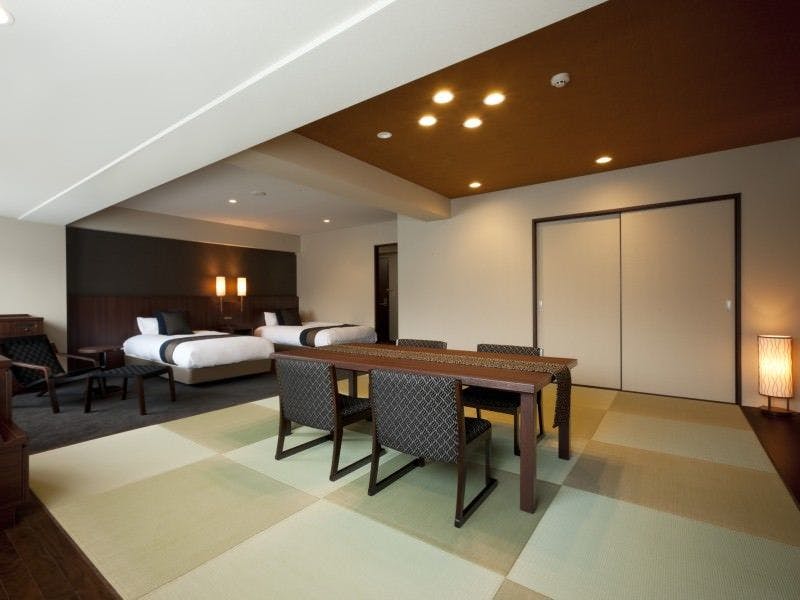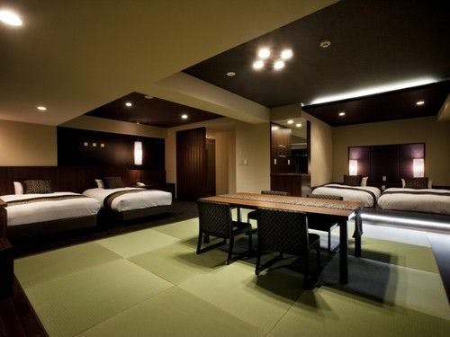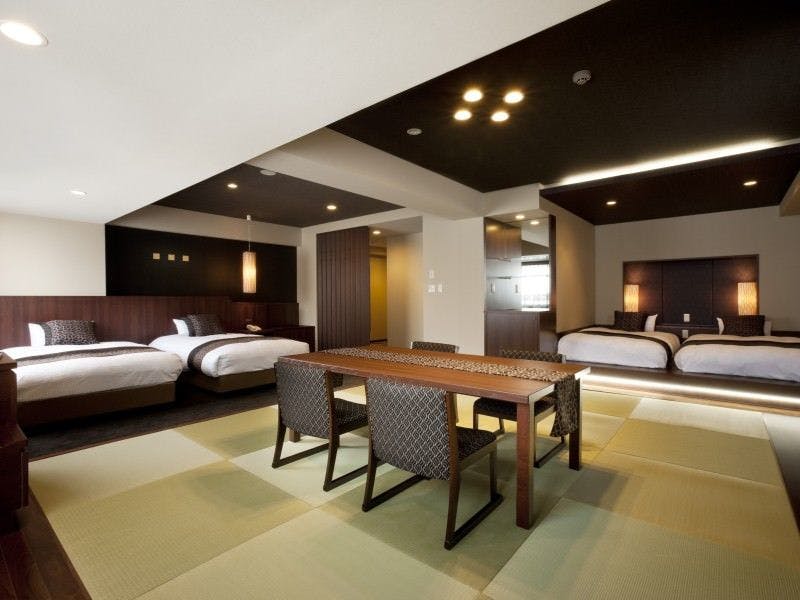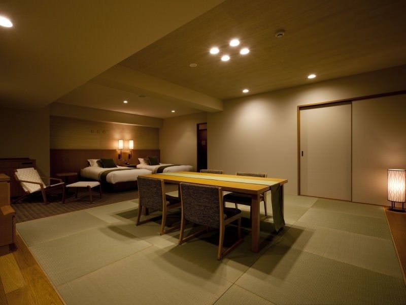 「和魂洋才」「モダンコンテンポラリー」をテーマとし、ナチュラルな素材とやさしい色使いの空間に演出いたしました。そして従来の和室2室を1室にすることで、ゆとりのある空間を確保。快適性にも配慮し、「最上の眠りを誘う」ことで定評のあるシモンズ社製のベッドや丸八真綿の寝具を導入。また、室内は琉球畳やローテーブル、ローチェアを用いて、老若男女問わず幅広い世代が快適に過ごせる空間を実現しました