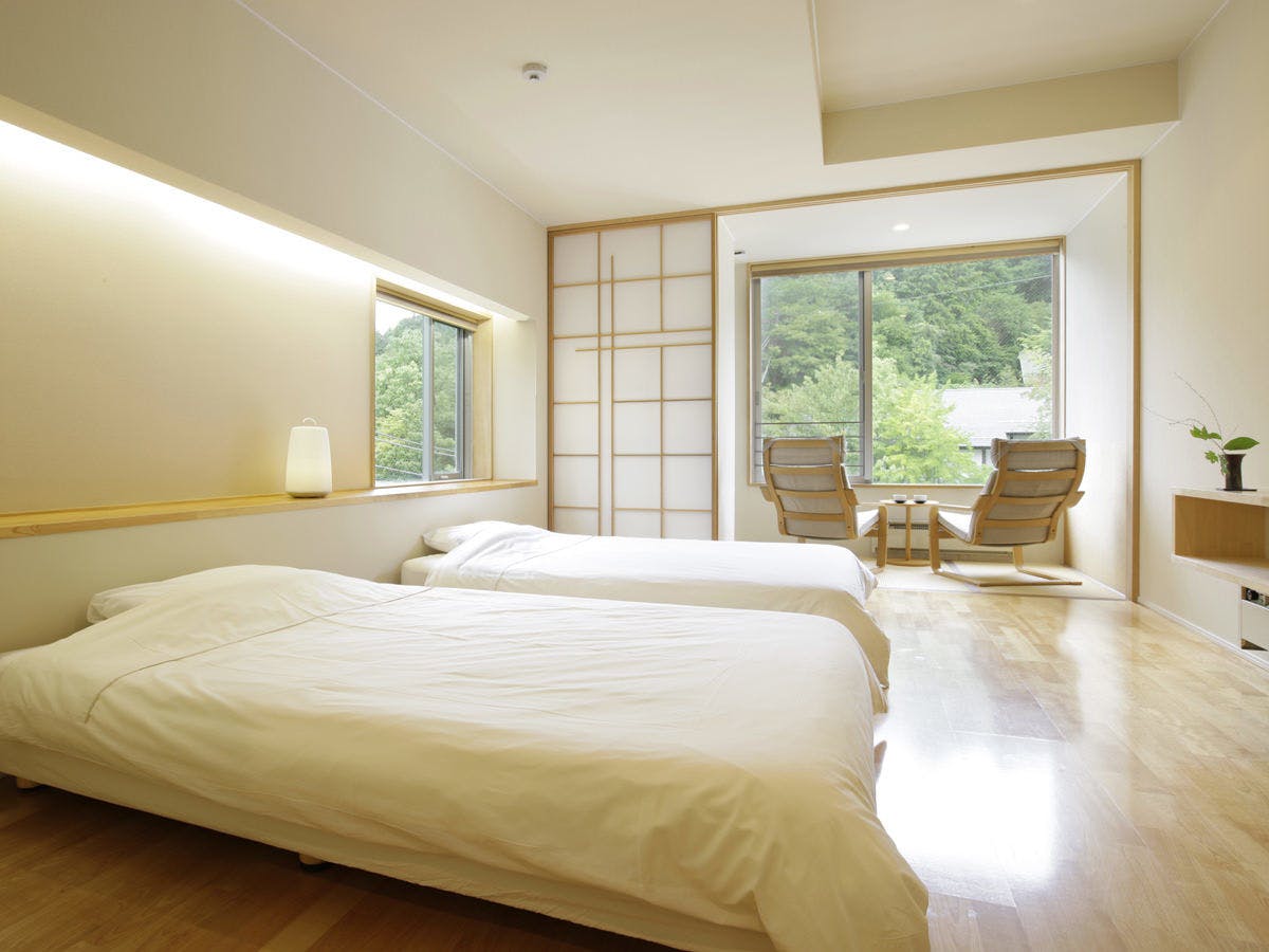 草津ホテル庭園に面した明るいお部屋です。セミダブルベッドを2台、畳の間に卓袱台とお座布団をご用意しています。3名様1室でご利用の際には畳の間にお布団を1組敷かせていただきます。※1部屋あたりの定員は3名様までとさせて頂きます。※添い寝のお子様も含め、小学生以下のお子様のご宿泊はいただけません。
