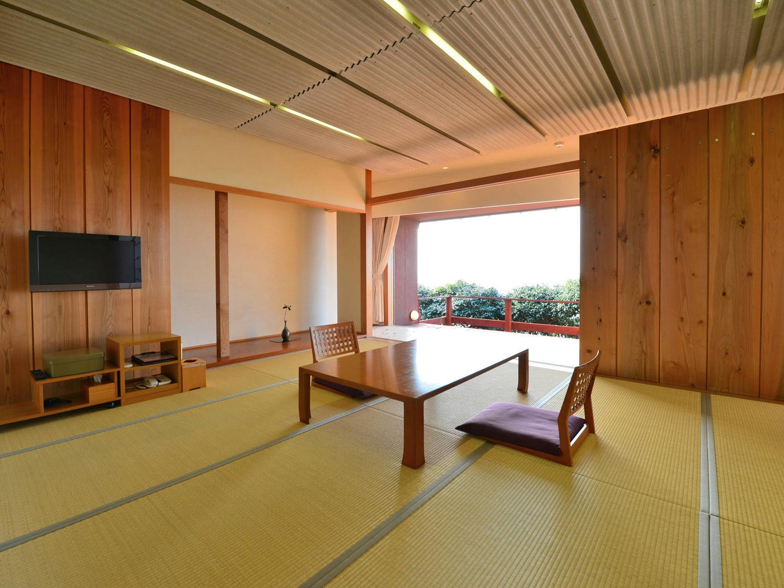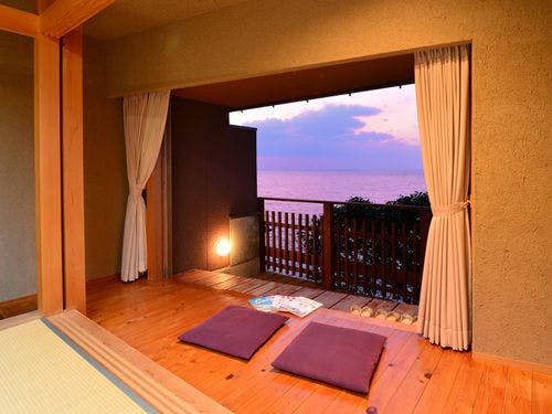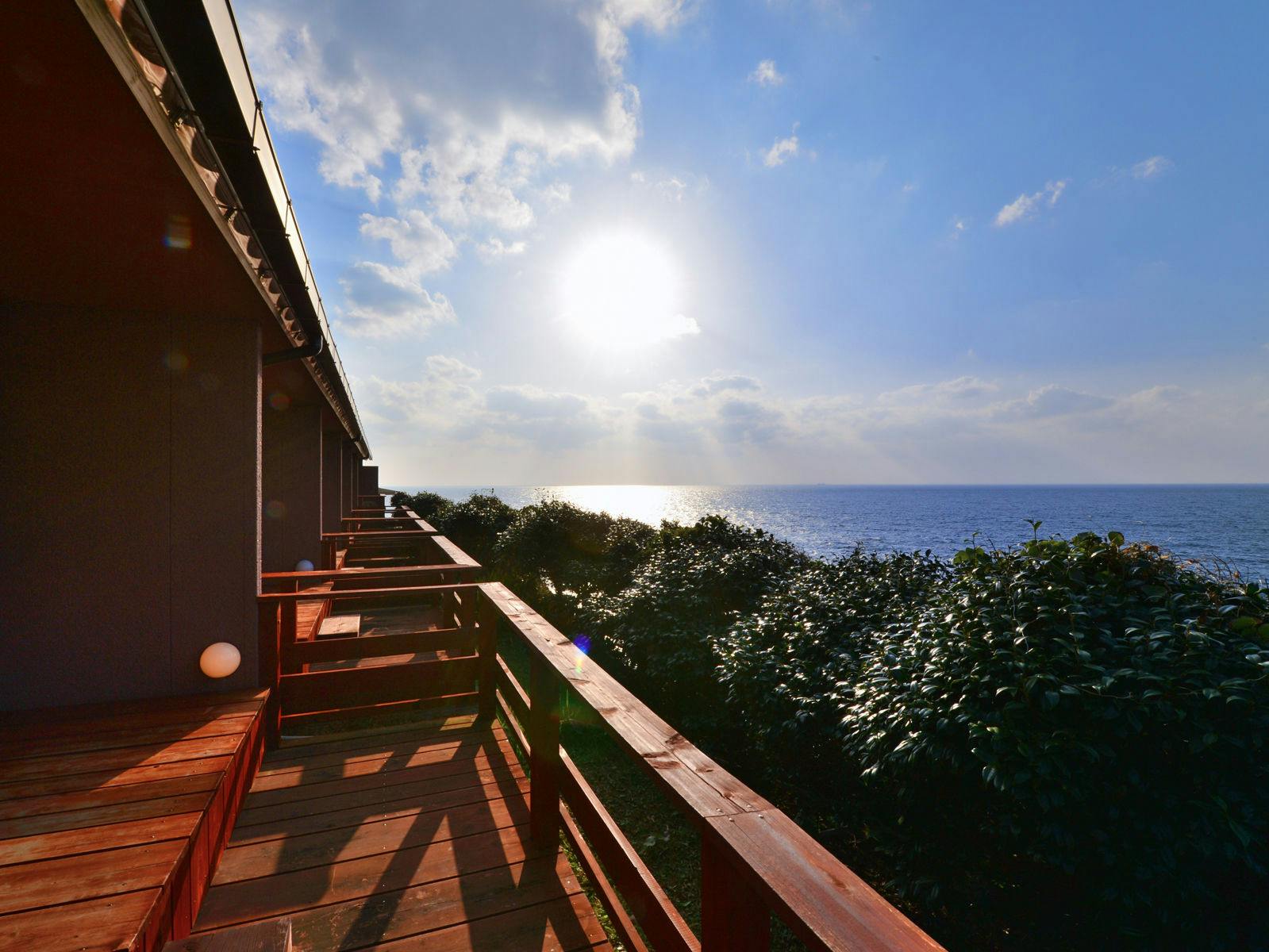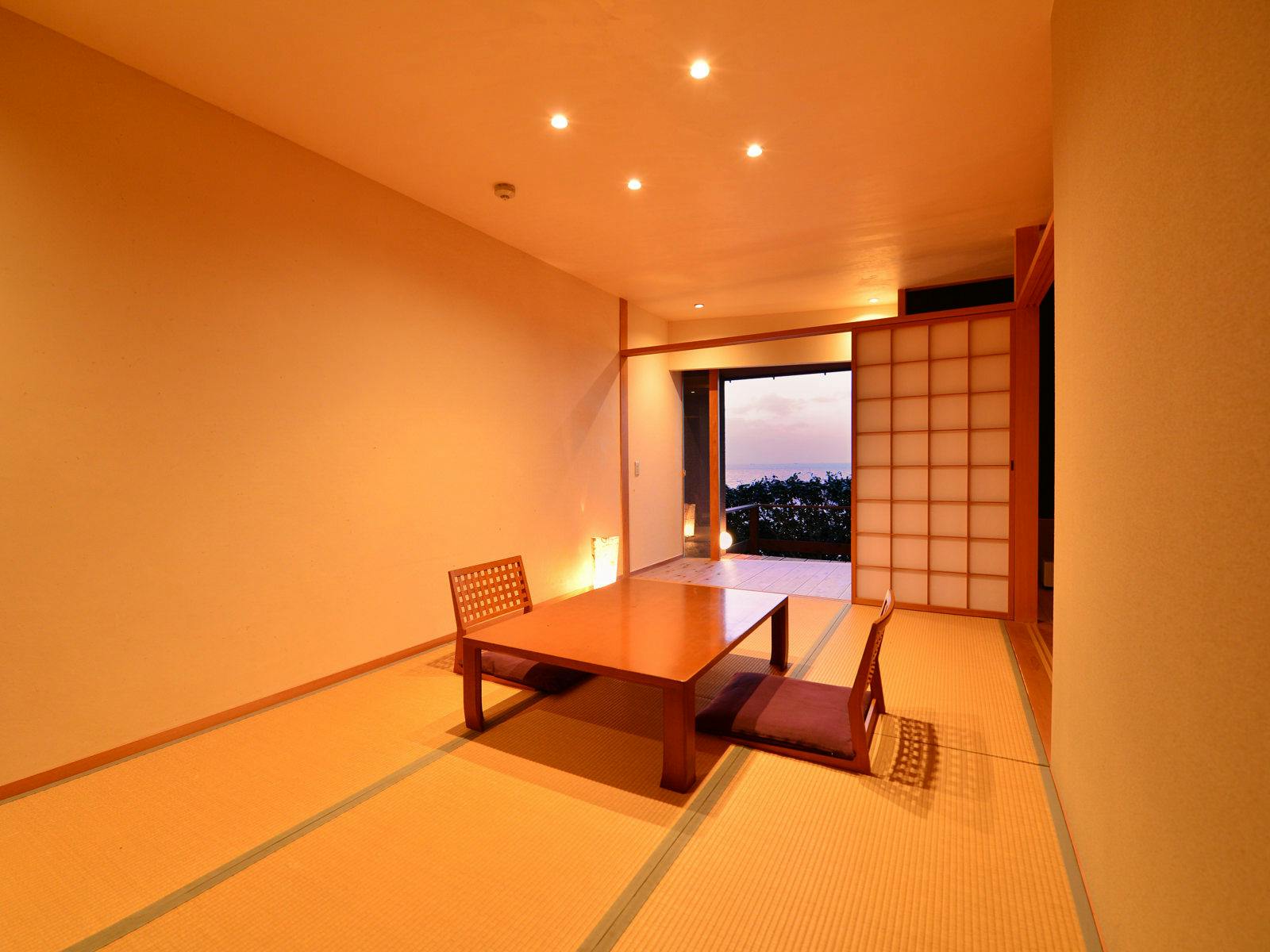 海の見えるお部屋。デッキの先に見える海は遮る物が何もない180度水平線。水平線に沈む夕陽を眺めながらお部屋での夕食。波の音、海面に光る月明かり、降り注ぐ星空。そんな自然の恵みをいっぱいに感じられる癒しのお部屋。和室トイレ洗面付き。縁側、デッキ付き。※全室禁煙でございます。喫煙コーナーを設けております。