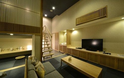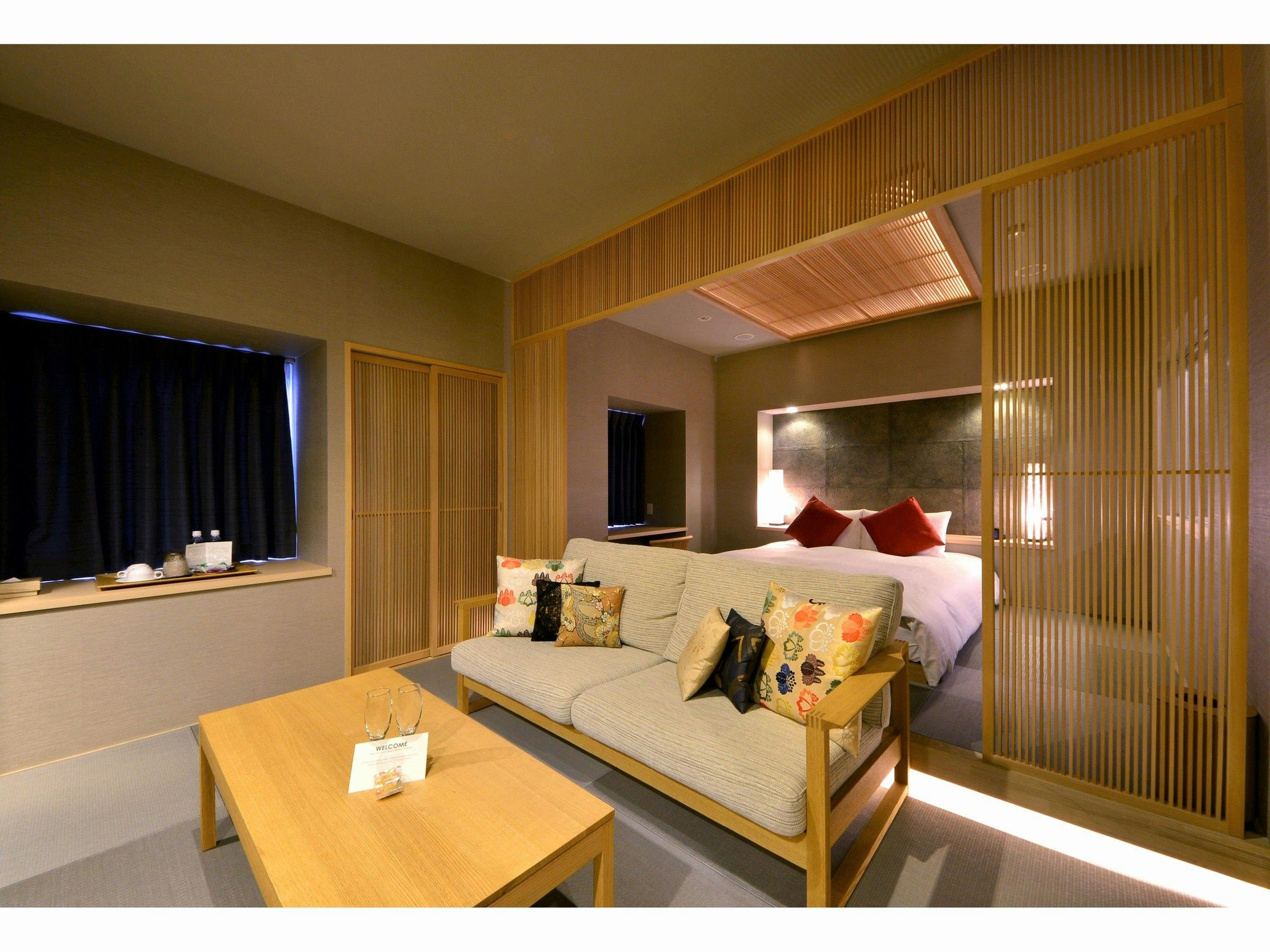 40m2の広さを誇るジャパニーズモダンルーム漣、千本格子の化粧天井を施し、和と洋をミックスさせ、快適性・機能性の中に和の寛ぎも盛り込んだ空間です。また全ての客室で窓の開閉が可能。エアコンも個別空調となっております。