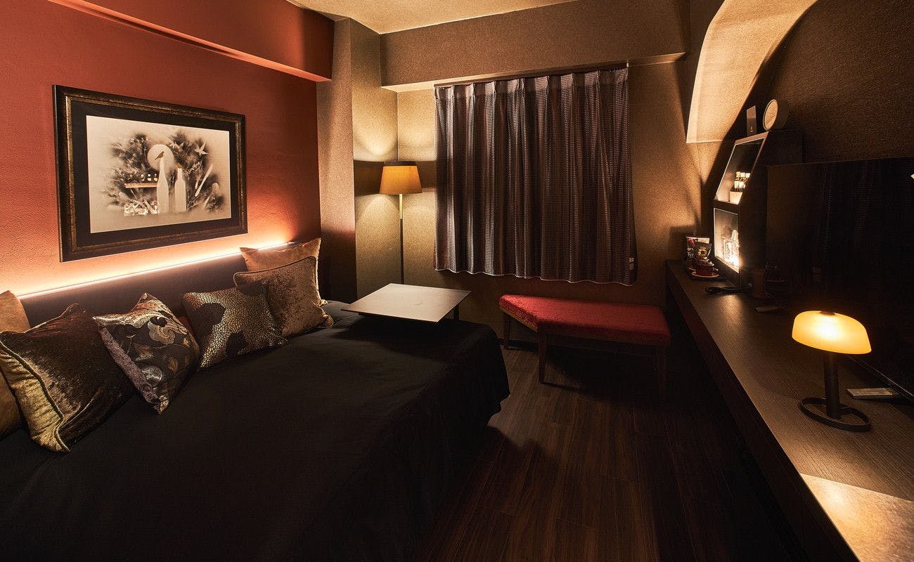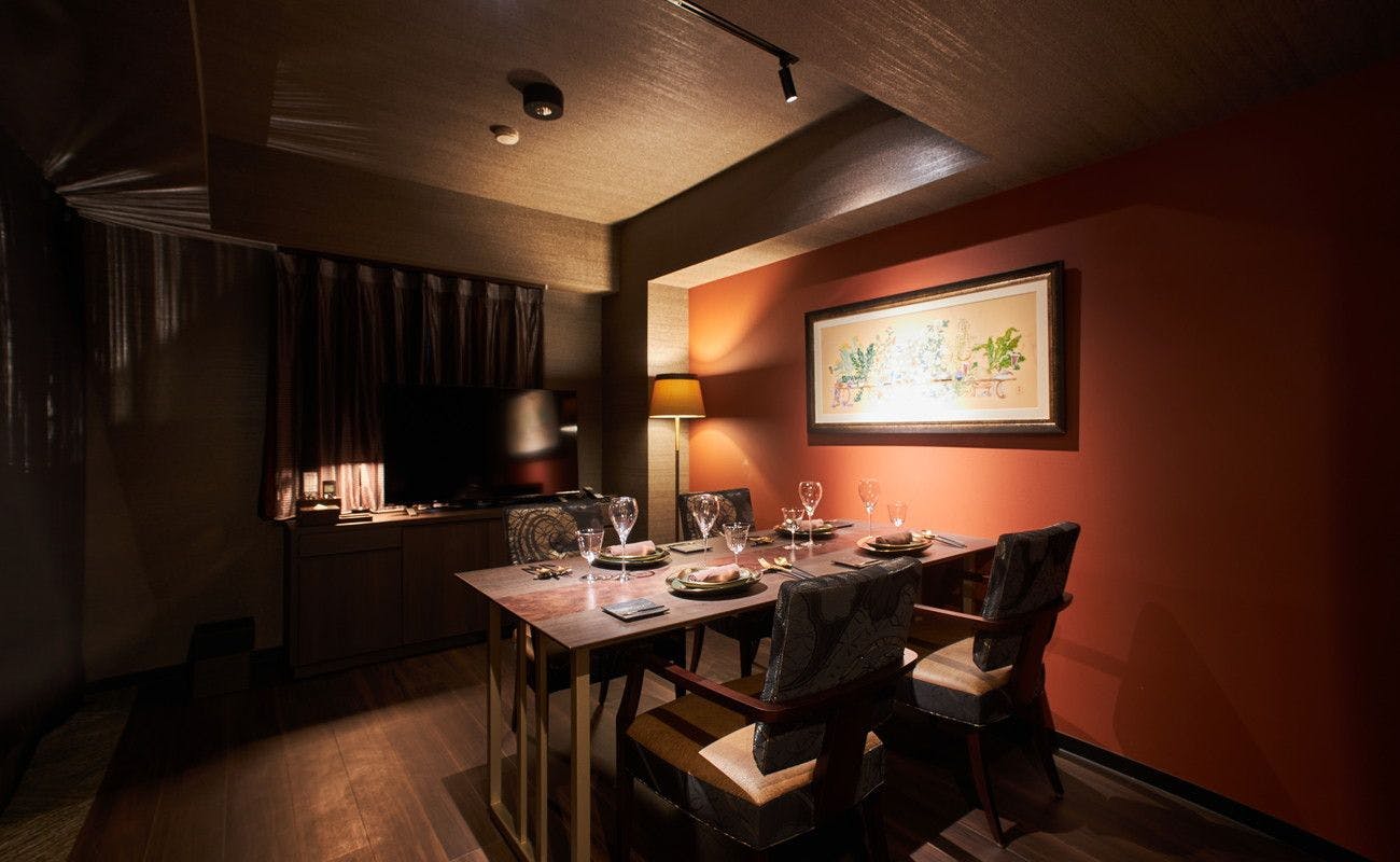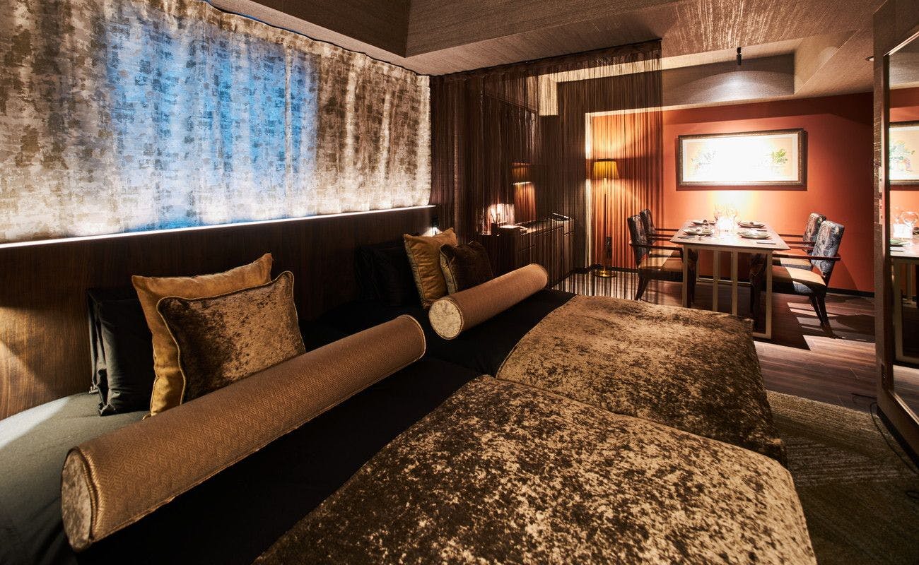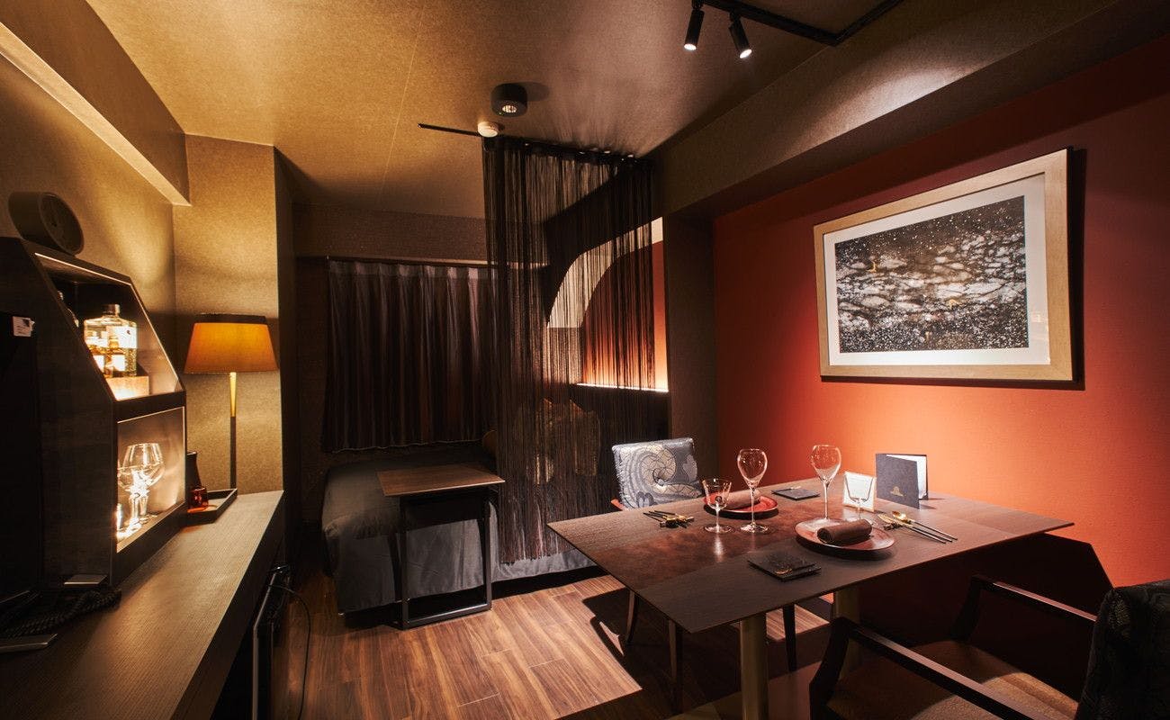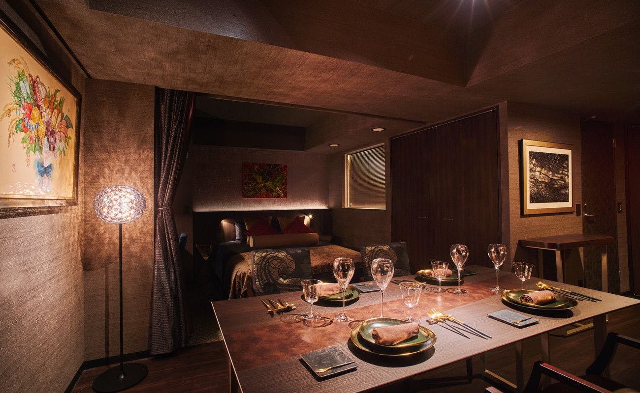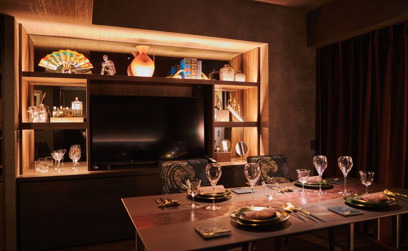 個性的で刺激的なインテリアにリニューアルされたお部屋。ダイニングエリアは紅色のクロスがアクセントとなり、大切な人との時間を艶やかに演出します。バーキャビネットにはバーツール、ミニボトル、冷蔵庫にドリンクが備え付けられており、お好きなスタイルでお酒をメイキング頂けます。
