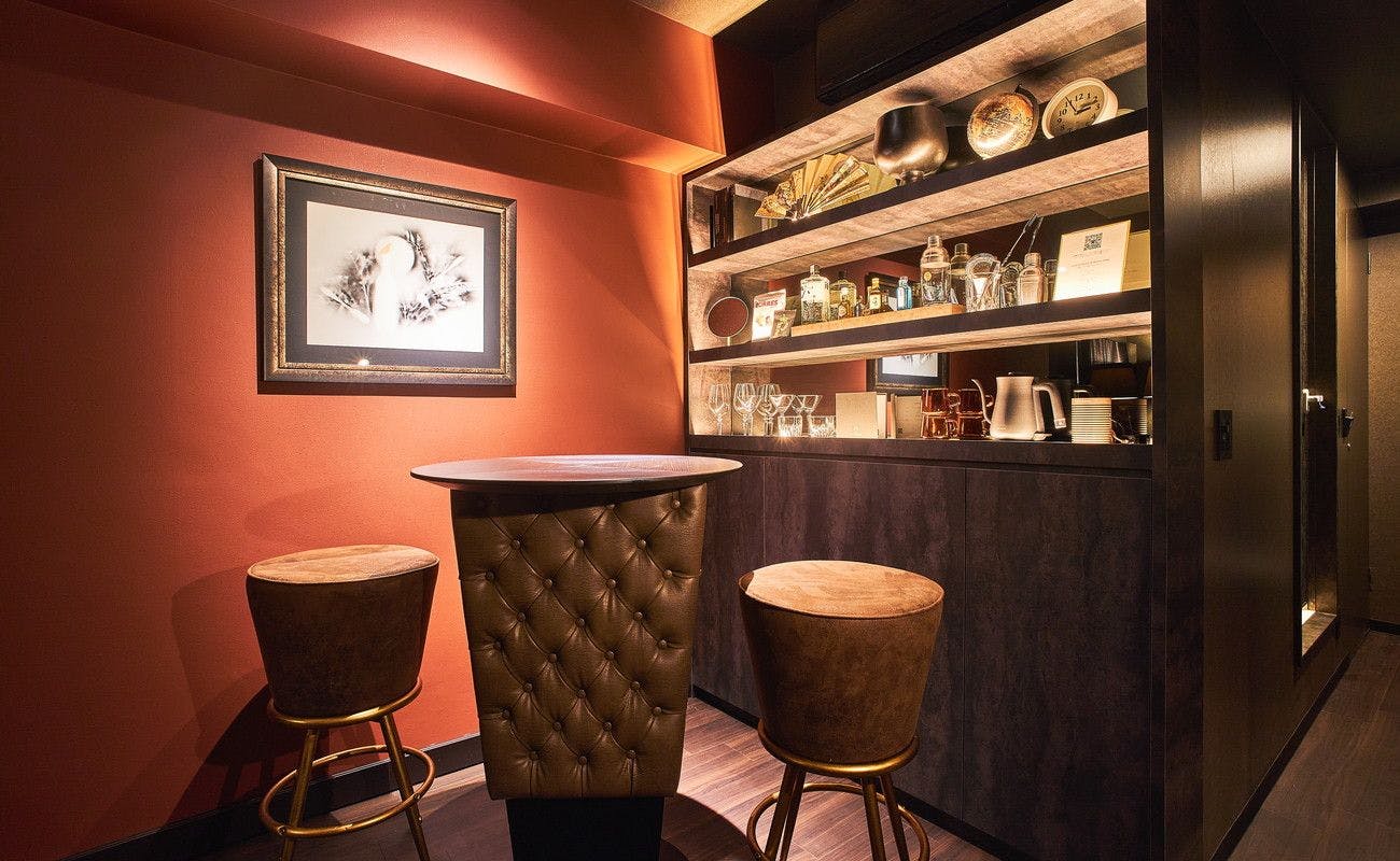個性的で刺激的なインテリアにリニューアルされたお部屋で、お酒をお楽しみ頂けます。バーキャビネットにはバーツール、ミニボトル、冷蔵庫にドリンクが備え付けられており、お好きなスタイルでお酒をメイキング頂けます。