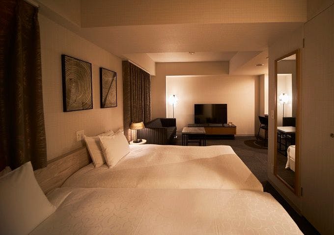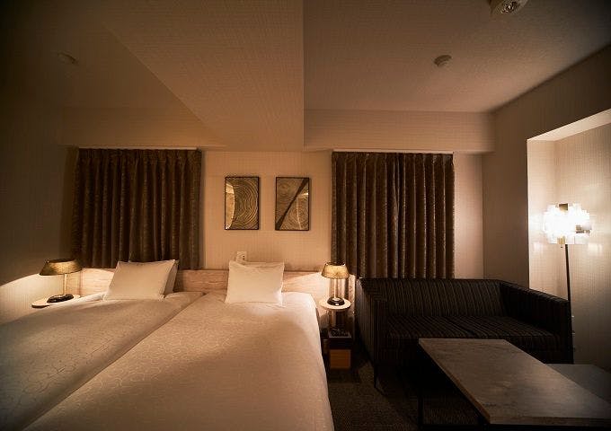 ■全ての客室で窓の開閉が可能。エアコンも個別空調となっております。都会の喧騒を忘れられる静寂な空間。120cm幅のベッド二台にソファが入ったツインルーム。ご家族やご友人と素敵な時間をお過ごしくださいませ。