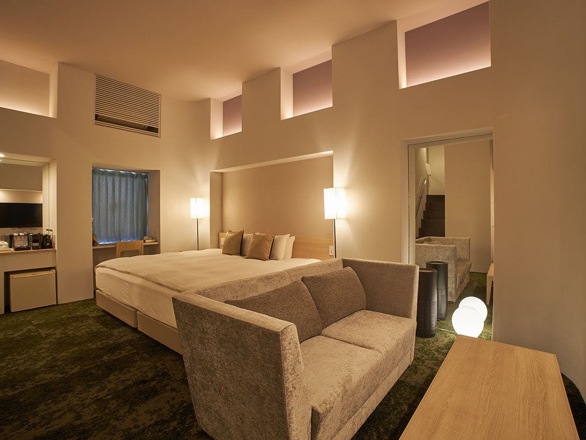 天井高3.3メートルの開放感あふれる大空間!六本木に突如出現した空中庭園をイメージしたこだわりのお部屋。45平米の広々としたお部屋で日々の喧騒を忘れリフレッシュしてください。全ての客室で窓の開閉が可能。エアコンも個別空調となっております。