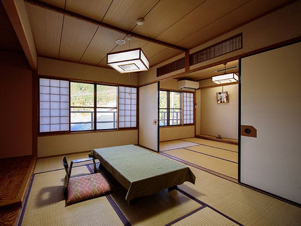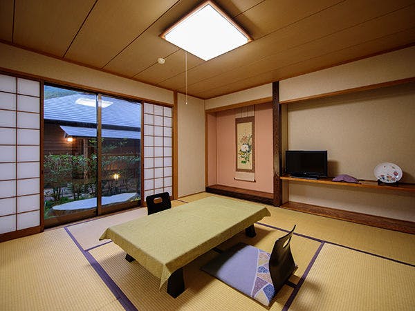 家族向け・一組限定の離れ 4畳+6畳+10畳。お天気の良い日は窓から由布岳もご覧頂けます。