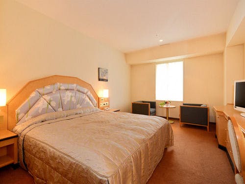 26.2平米のお部屋に1,800mmのゆったりサイズのシモンズベッドをご用意しております。ダブルベッドを使用しておりますので2名様でもご利用いただけます。