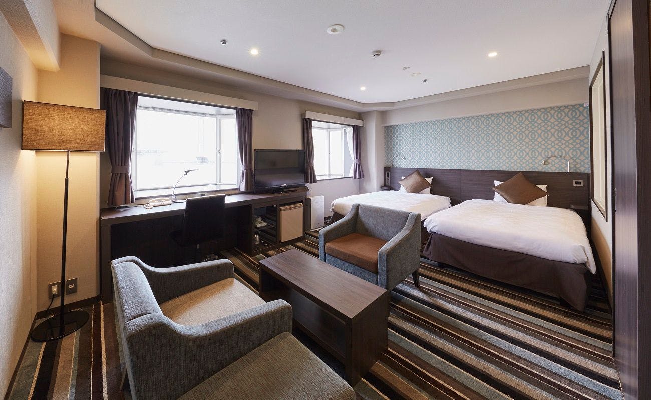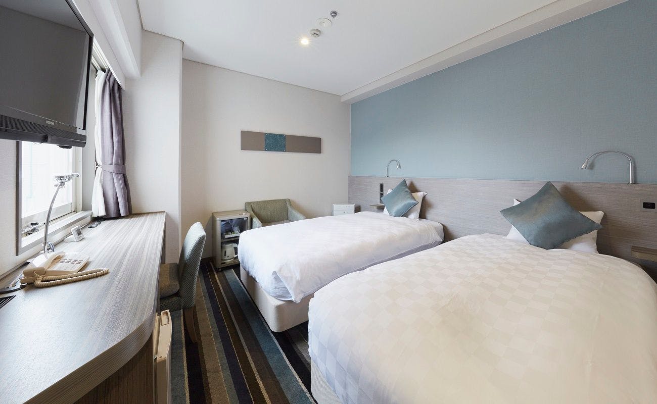白×寒色系でまとめられたシンプルなツインルーム。【客室設備のご案内】・加湿空気清浄機・32インチテレビを設置・ミネラルウォーター(ペットボトル)・高速インターネット回線無料(無線・有線)※ ズボンプレッサー・アイロン・アイロンボードは客室階のエレベーターホールにご用意しております