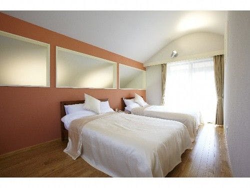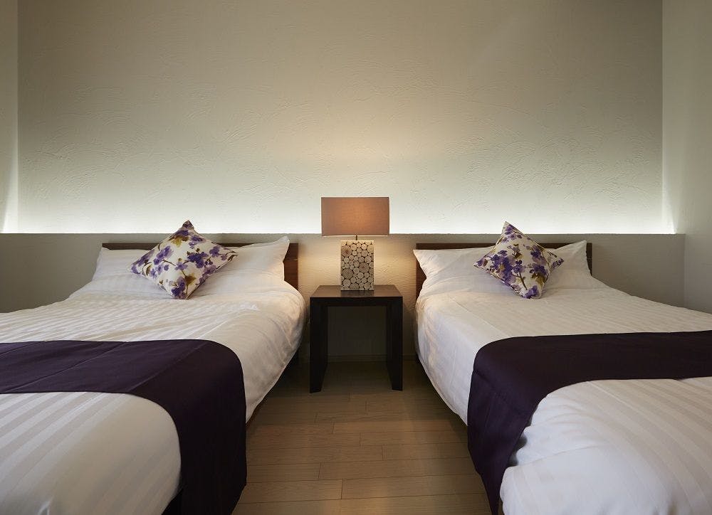 室内に和室スペースを兼ね備えた、和洋室タイプのお部屋です。柔らかな光と畳の香りがお客様のくつろぎの時間を優しく包み込みます。またベッドはセミダブルベッドを二台配置しています。