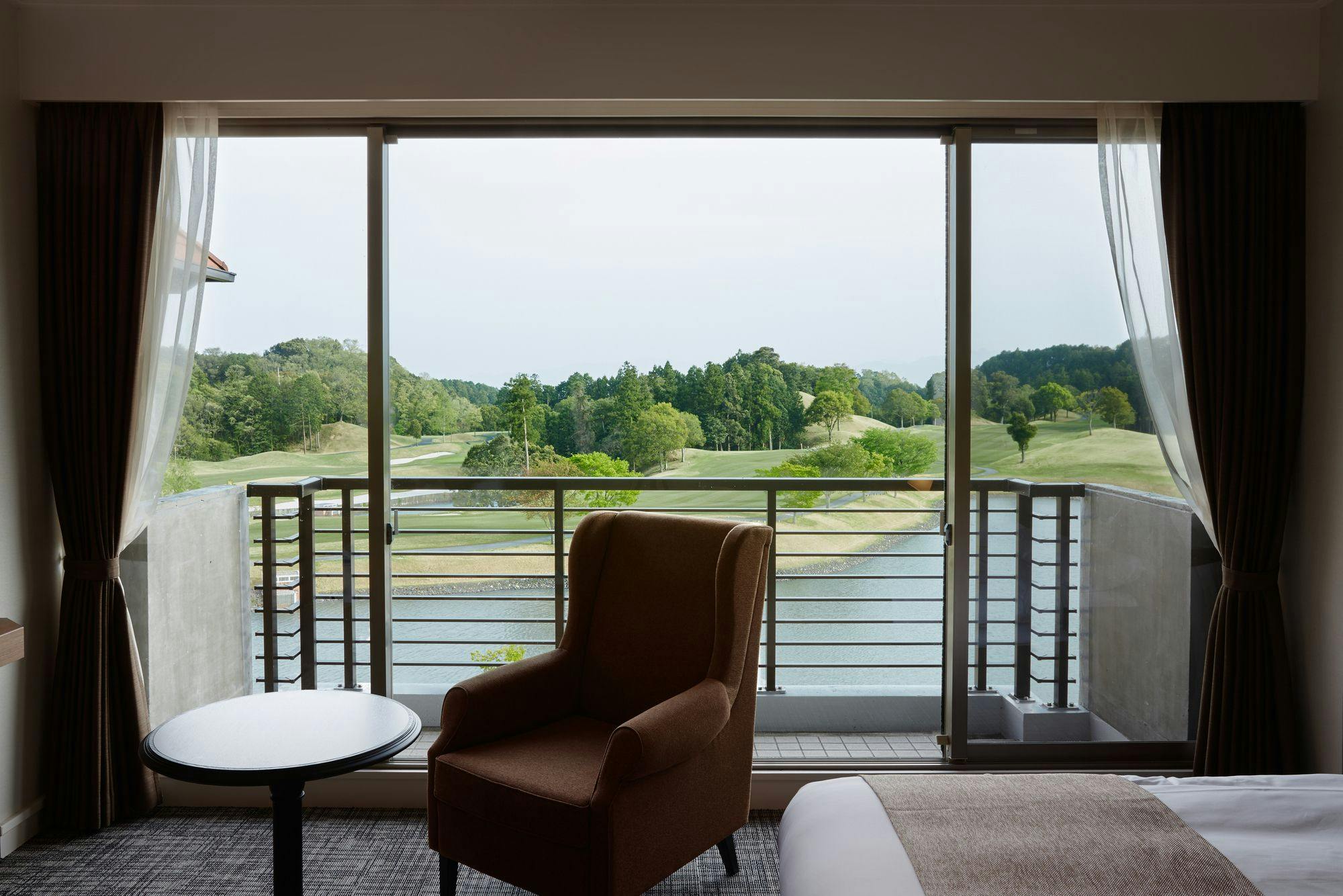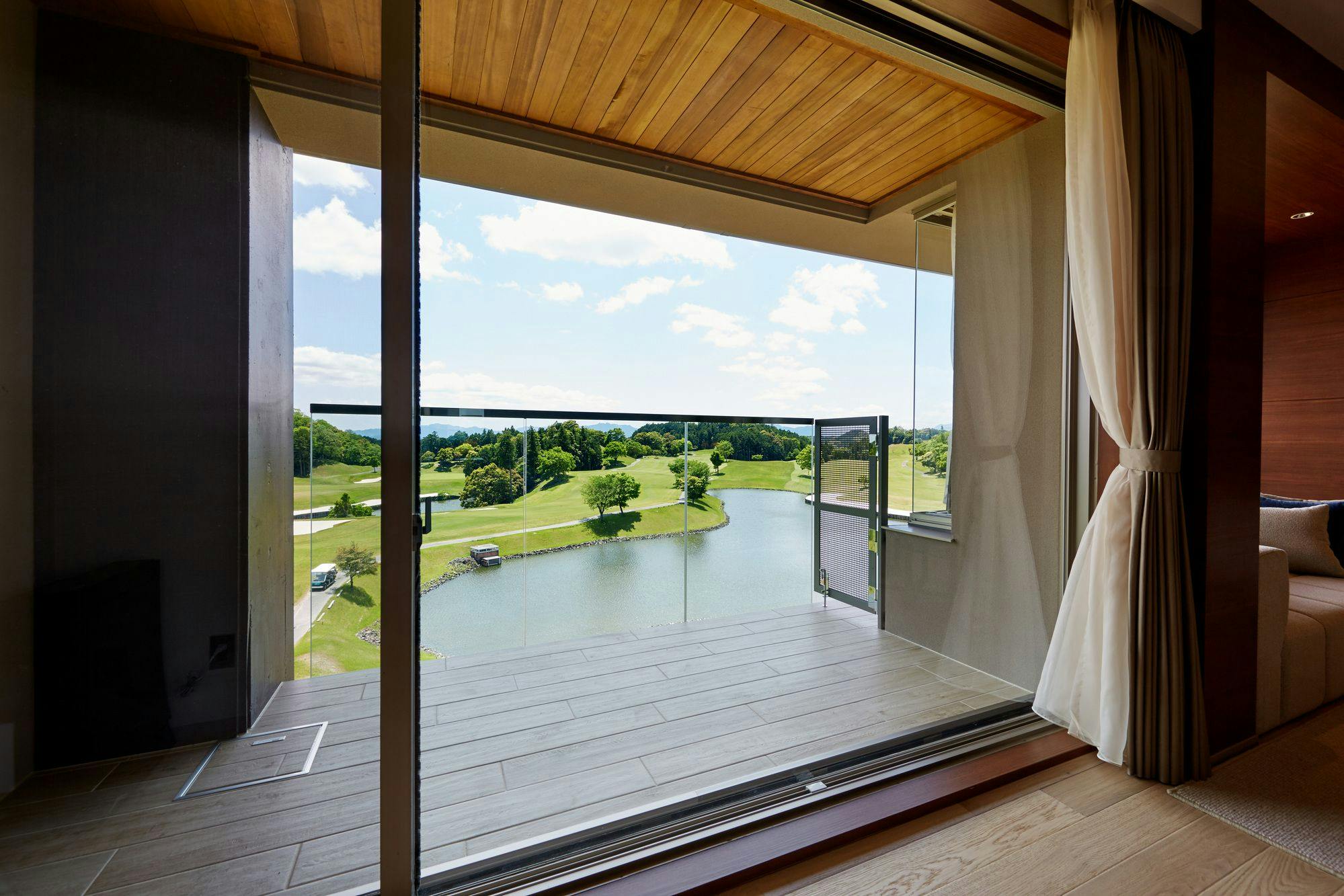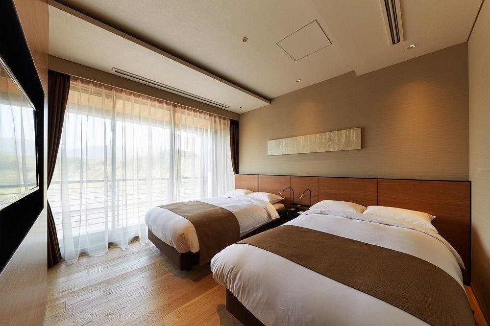 コースに接する面はほぼ全面ガラス張りのコースビュー。ベッドからも一望出来るグリーンとブルーのコントラスト、そして刻一刻と表情を変える自然の姿は、滞在中の時間を豊かにしてくれます。室内の家具や調度品はもちろん、照明から空間デザインまで、こだわりは細部にわたり、その1つ1つがお客様のくつろぎの時間を上質且つ贅沢に演出します。ベッドは大型のセミダブルベッドを2台配備。ゆっくりとお休み頂ける環境をご提供することで、快適な滞在をお約束します。