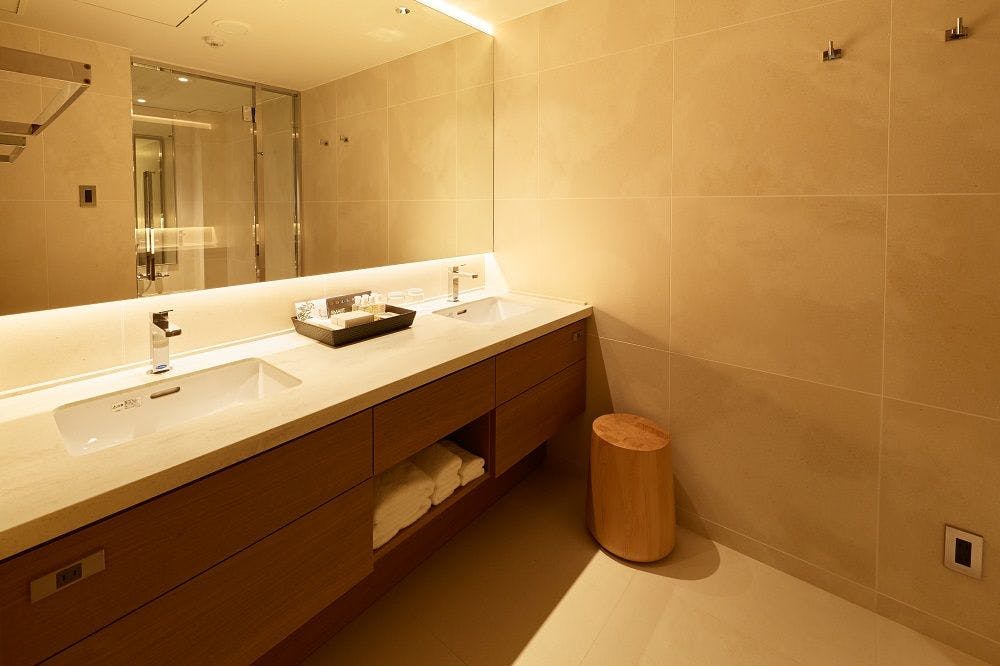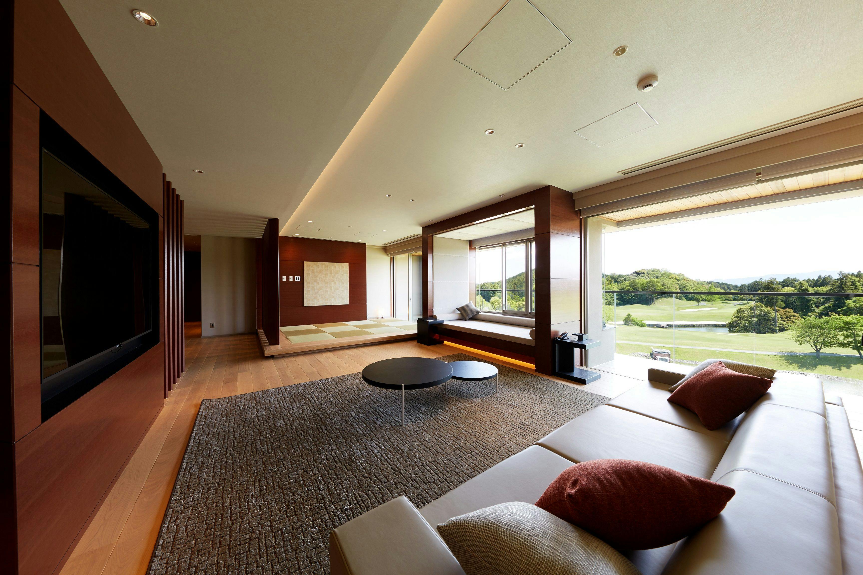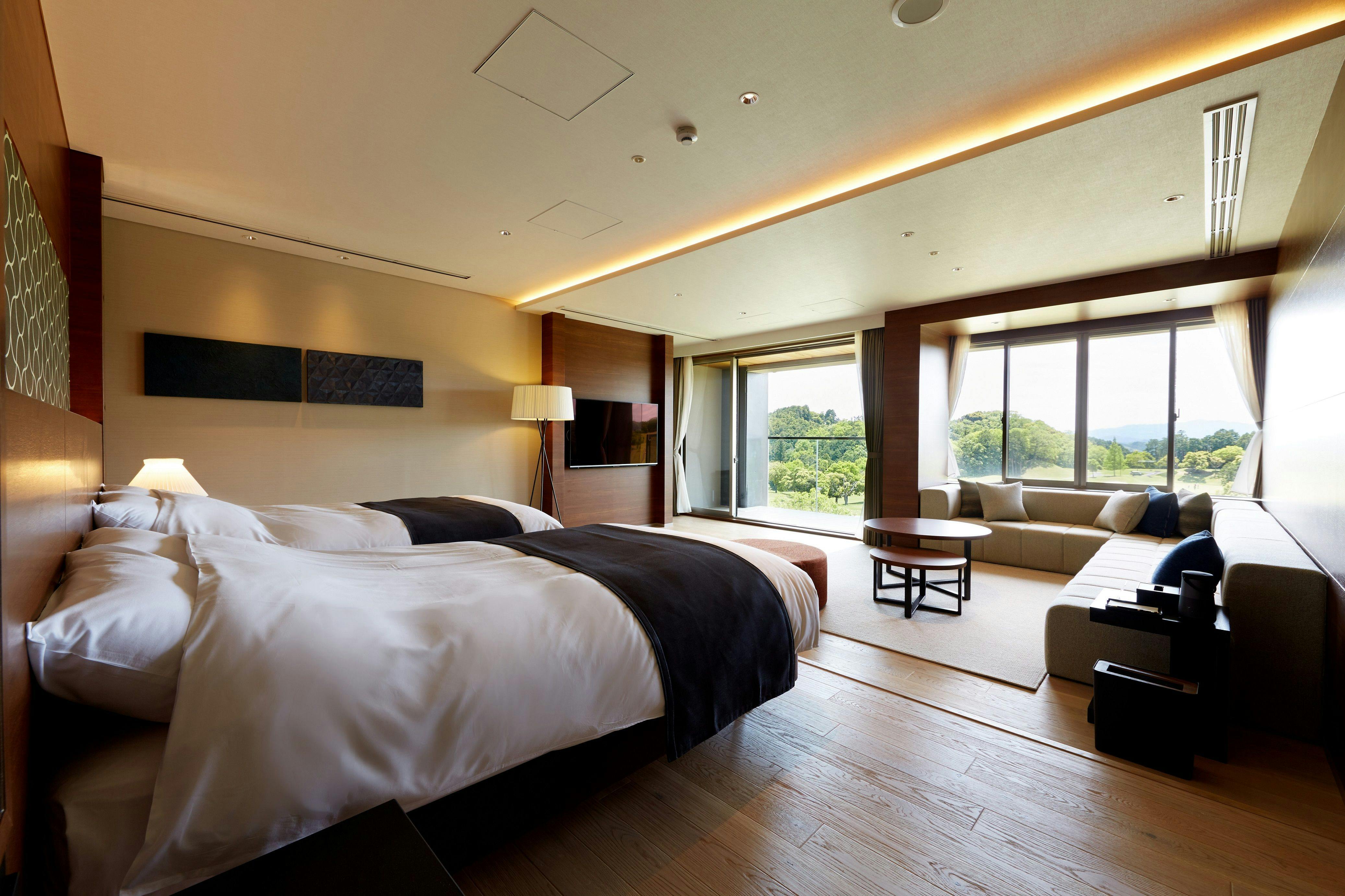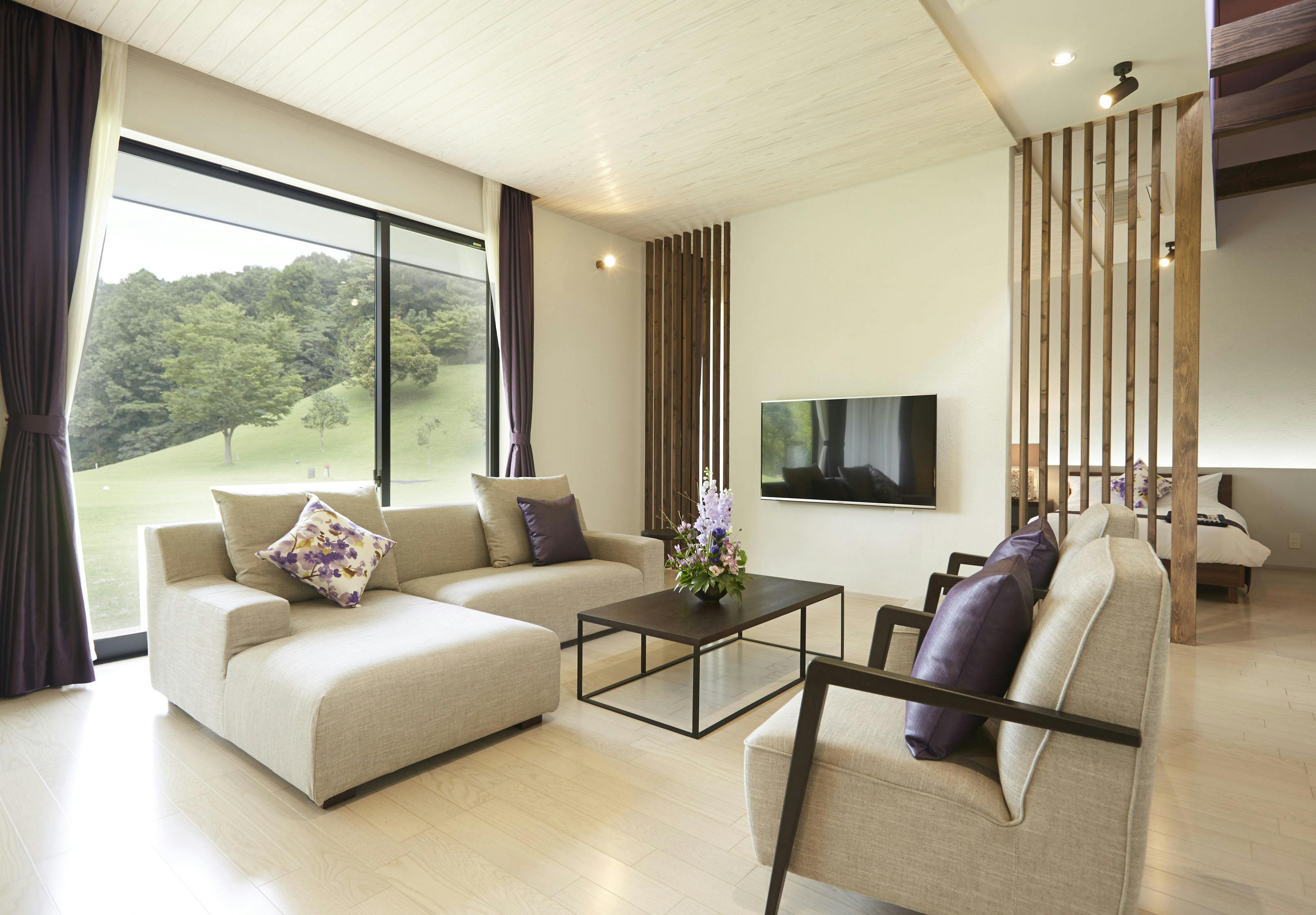 コースに接する面はほぼ全面ガラス張りのコースビュー。ベッドからも一望出来るグリーンとブルーのコントラスト、そして刻一刻と表情を変える自然の姿は、滞在中の時間を豊かにしてくれます。室内の家具や調度品はもちろん、照明から空間デザインまで、こだわりは細部にわたり、その1つ1つがお客様のくつろぎの時間を上質且つ贅沢に演出します。ベッドは大型のセミダブルベッドを2台配備。ゆっくりとお休み頂ける環境をご提供することで、快適な滞在をお約束します。