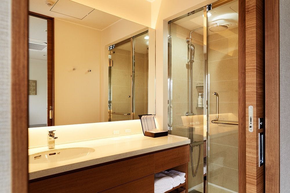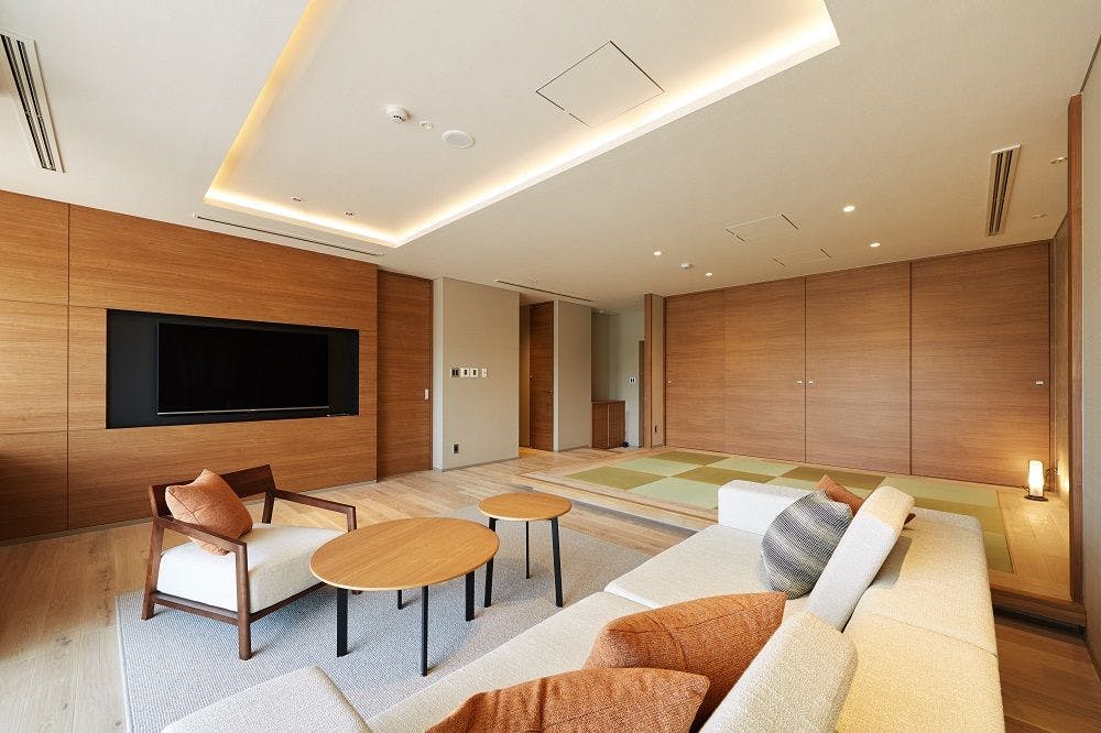 室内は和室・洋室で構成され、大型テレビを3か所に配備。洗面台も2台設置する他、ロイヤルスイートの名に相応しい、充実の設備を備えています。インテリアはイタリア製の家具を中心に、ウッド・レザーを基調に統一。柔らかな照明の明かりも上質でぬくもりのある空間を演出してくれます。自然の光りに包まれた開放感のある空間に、こだわりの檜風呂を配置。檜の自然豊かな香りとともに、榊原の自然を独占するビューバスを是非、心ゆくまでご堪能下さい。