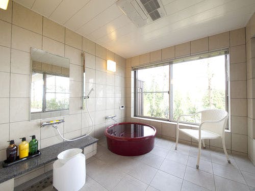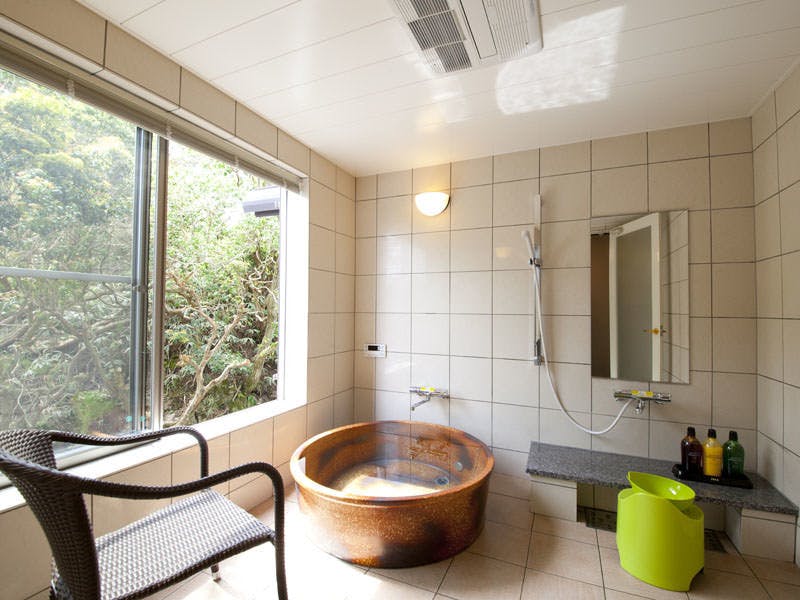 バスルームは開放感があり、浴槽には信楽焼きを使用。