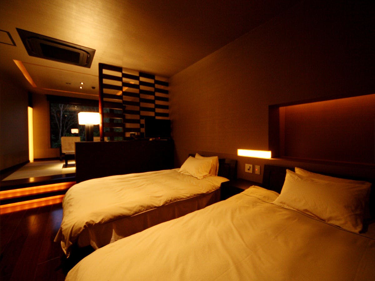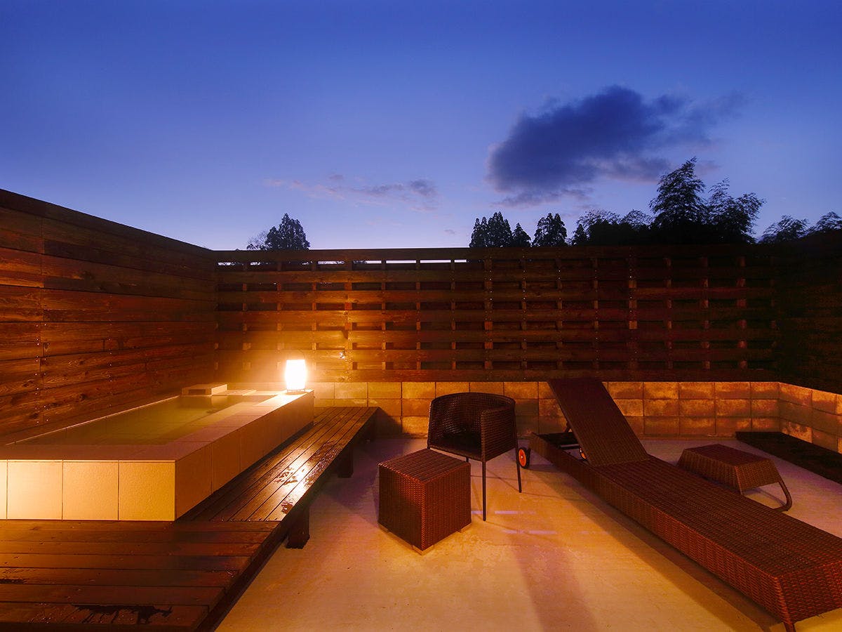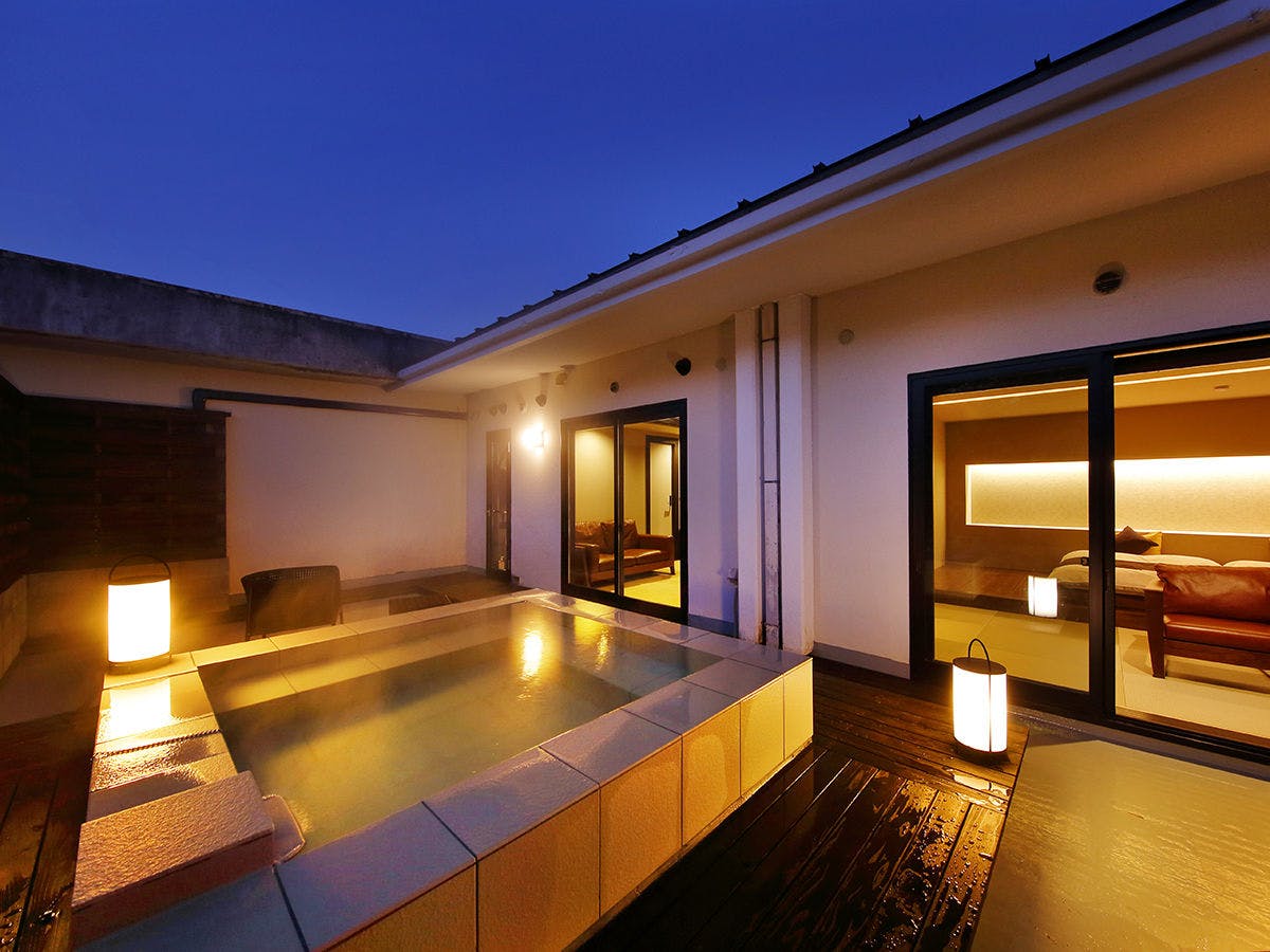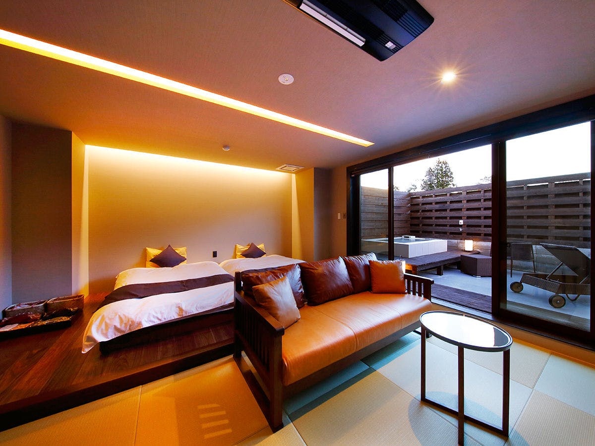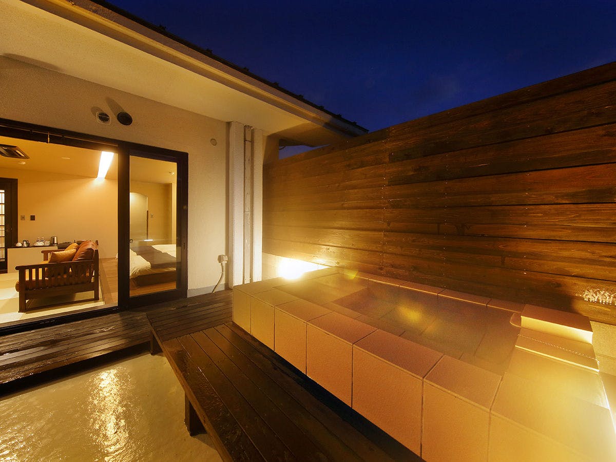 野天風呂(源泉かけ流し)、内風呂、リビング、ツインベッド