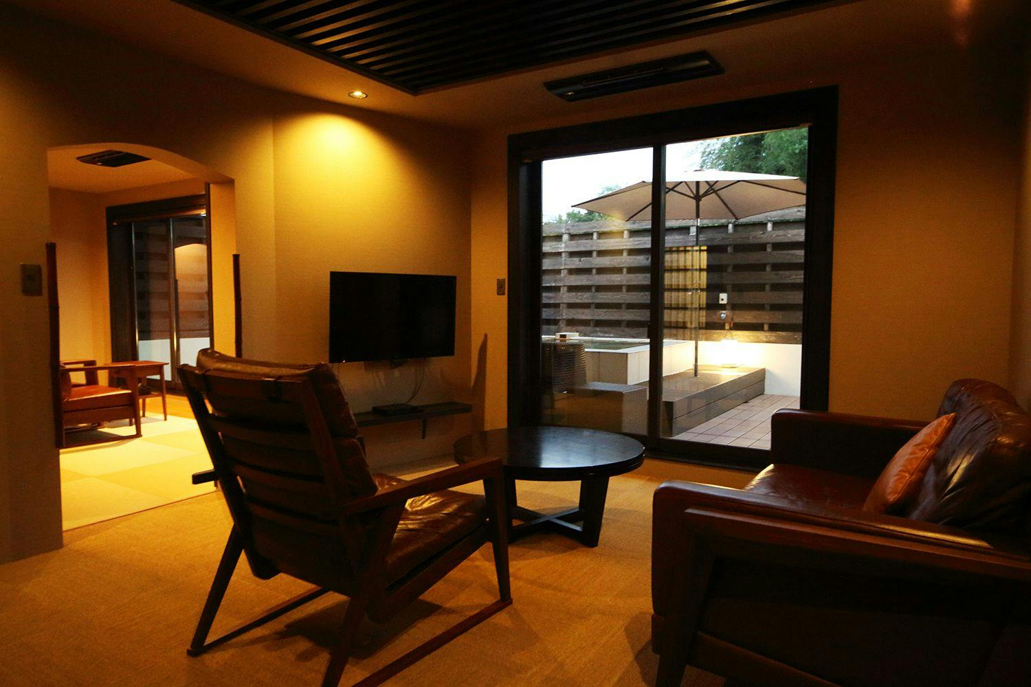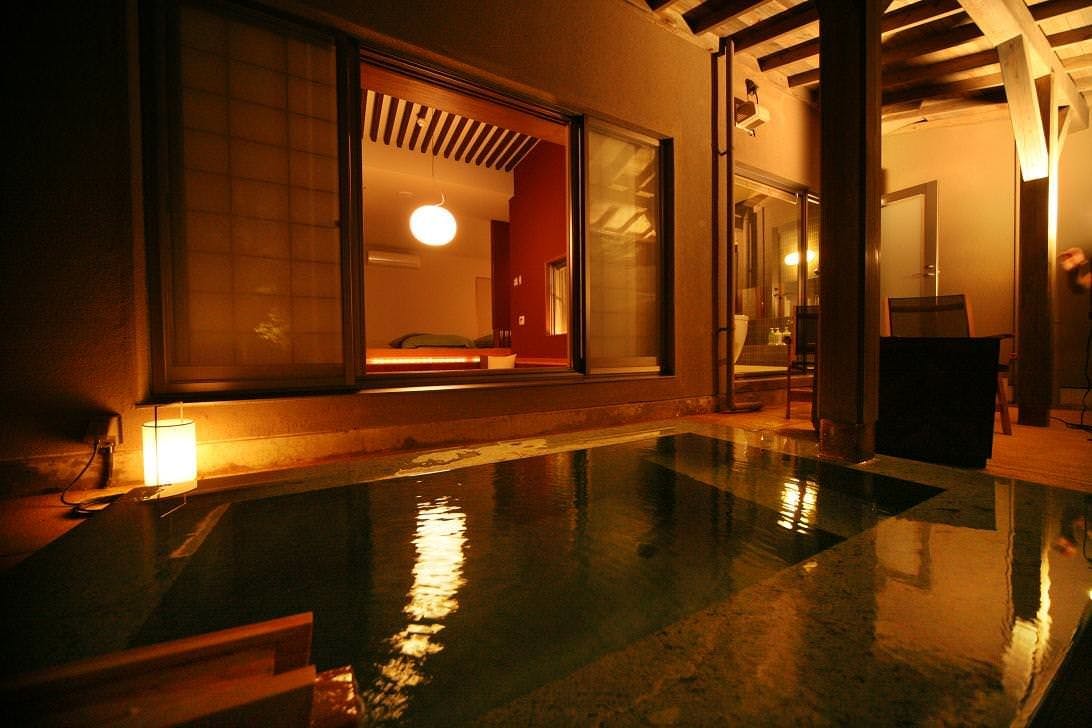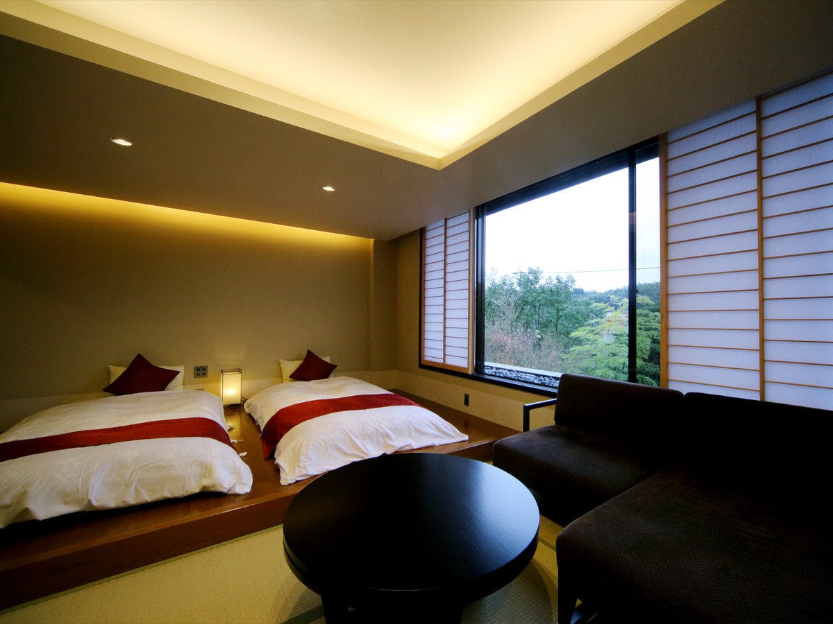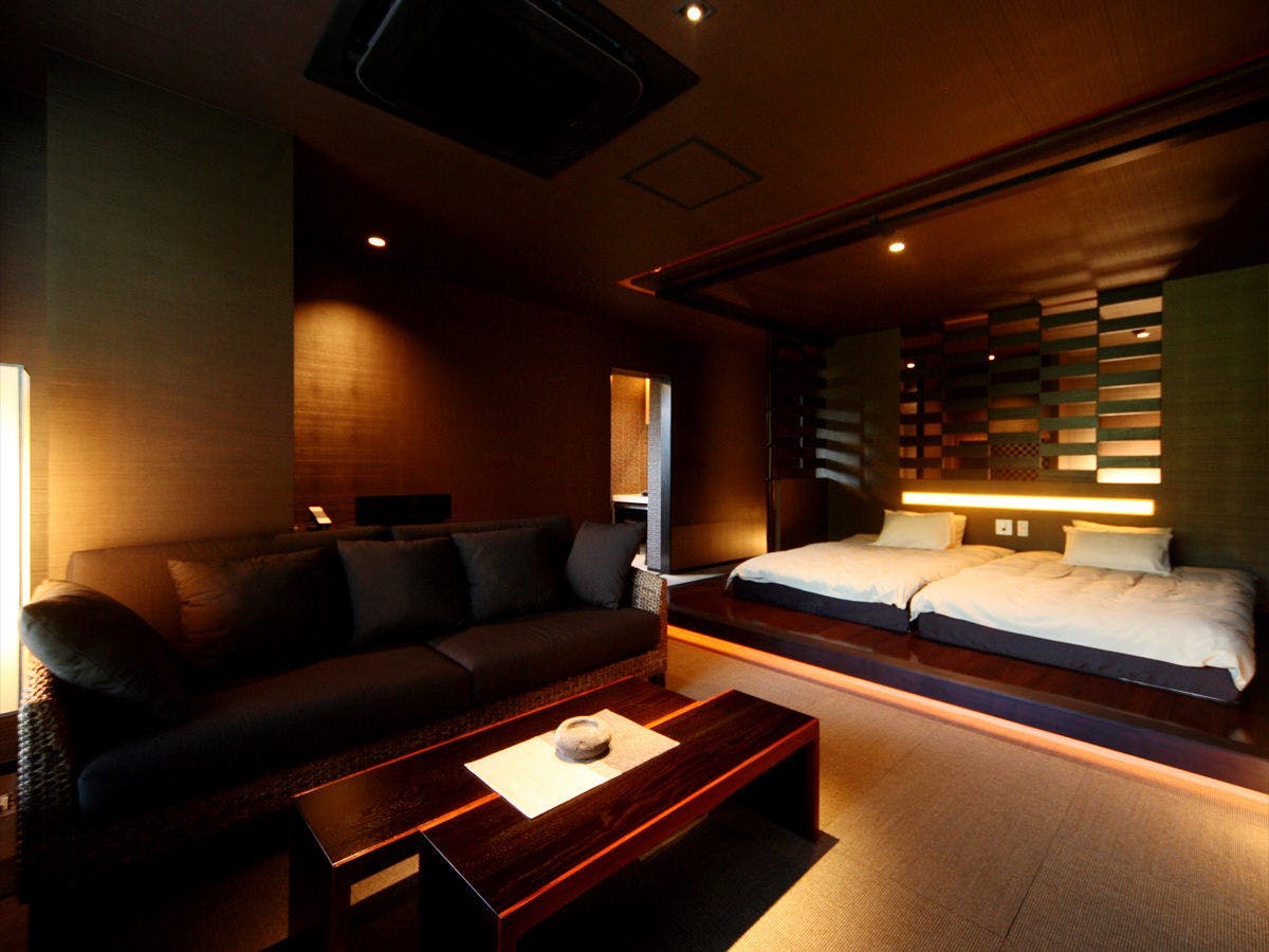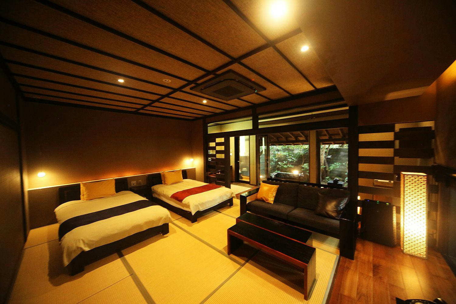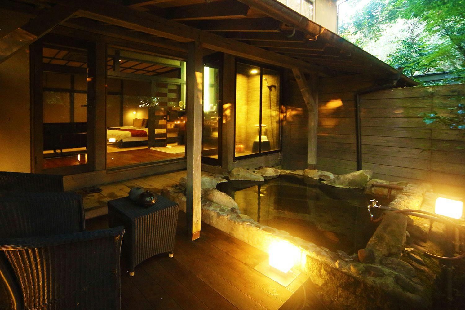 野天風呂(源泉かけ流し)、内風呂、リビング、ツインベッド