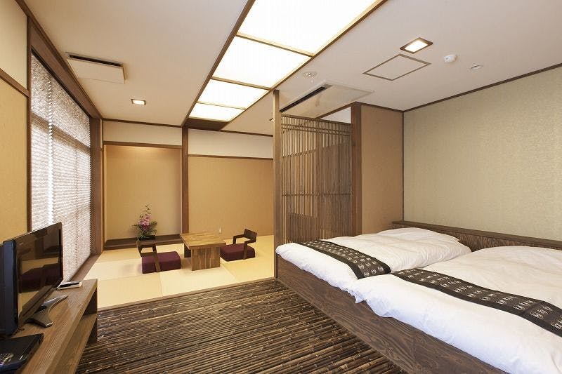 当宿自慢の露天風呂付き客室です。ゆったりとした客室は、モダンなローベットの洋間と和のぬくもりを感じることのできる広々とした畳の和室で、川治温泉の山々を眺めながら入る露天風呂は格別です。