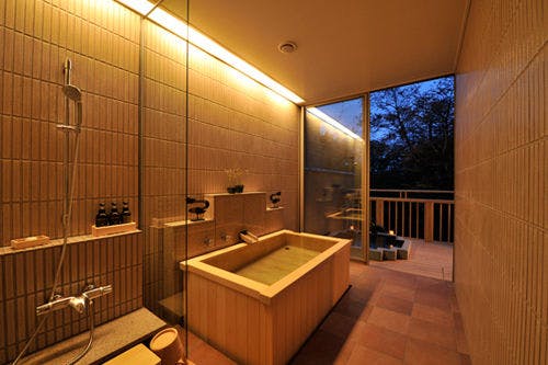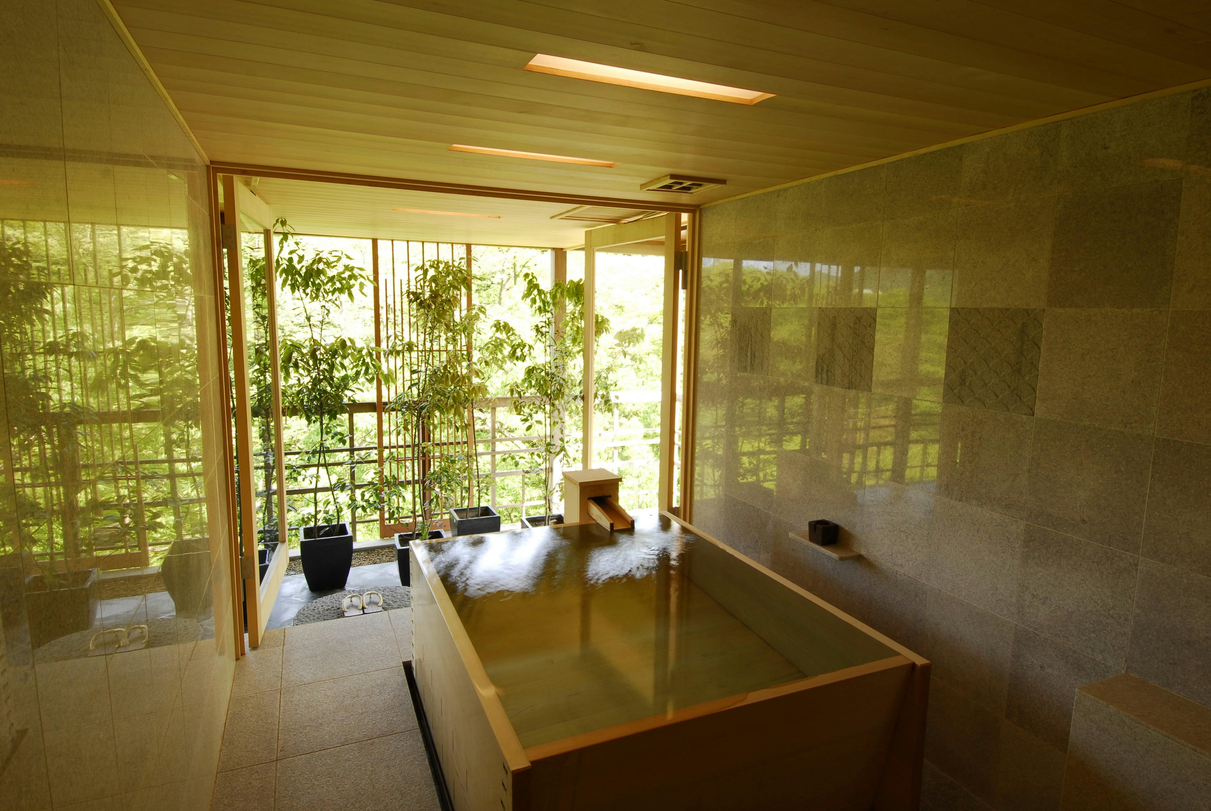 ジャグジー機能が付いた檜の内風呂とスチームサウナルームを備えた貴賓室。開放的な大きな窓からは四季折々の箱根の風景をご堪能いただけます。