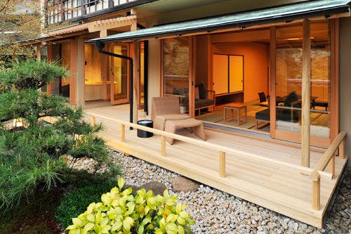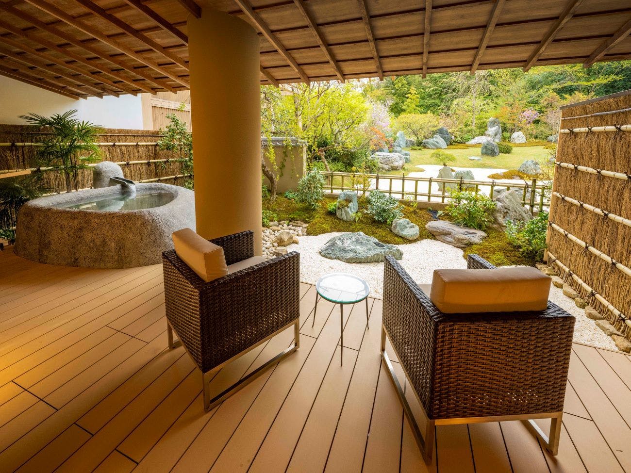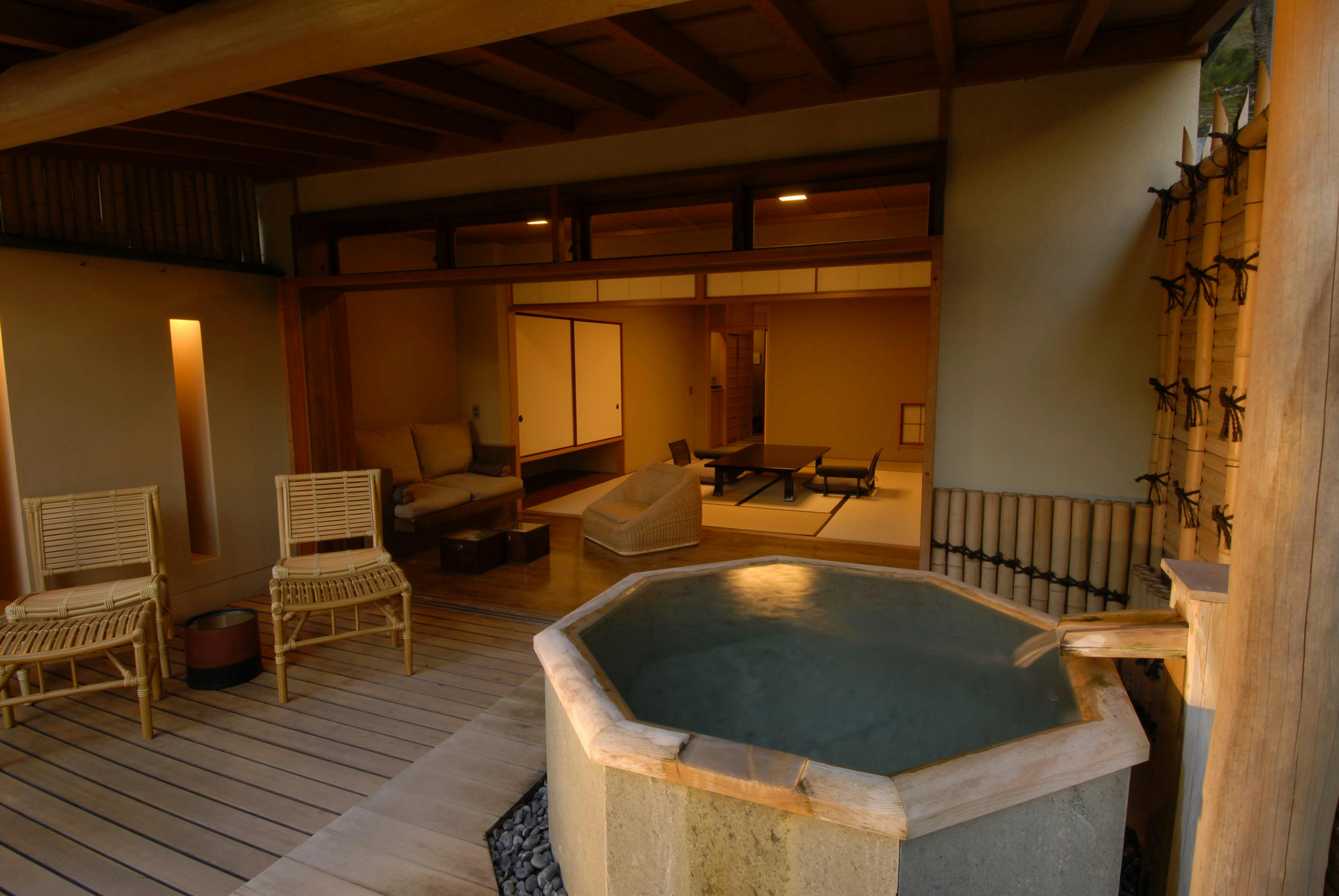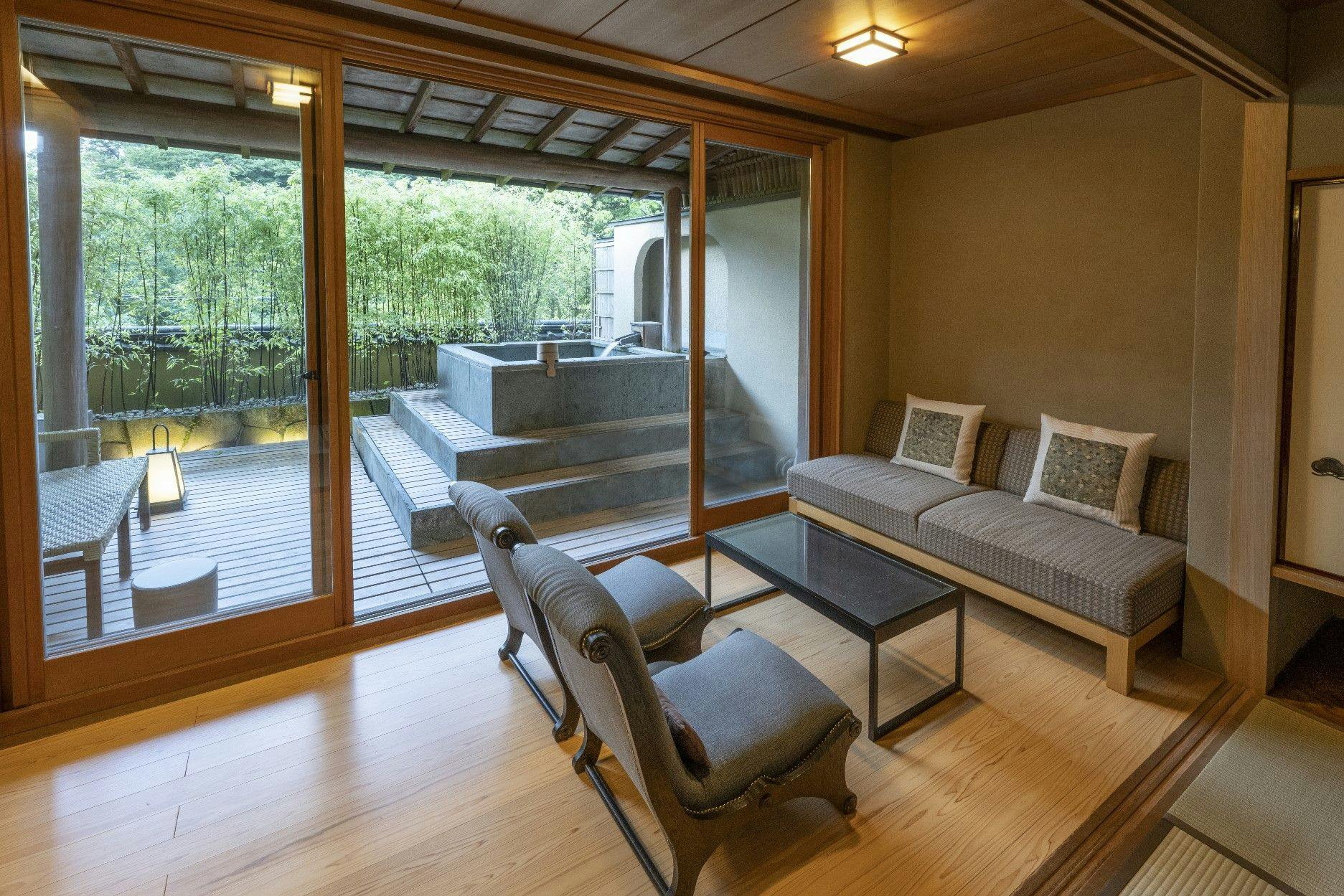 広々としたウッドテラスに露天風呂やガーデンチェア、広縁にソファーを配した客室。開放的なご入浴をお愉しみいただけます。