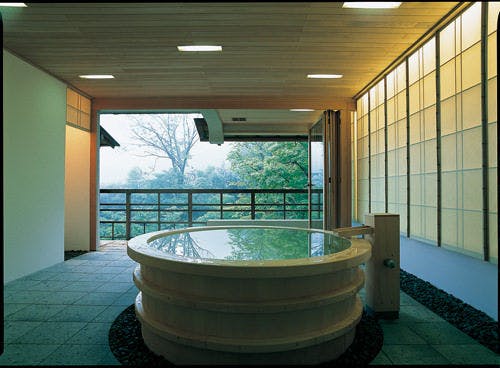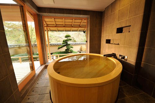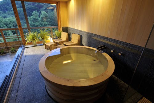 樽型の大きな檜風呂を備えた貴賓室。浴場の窓を全面開放することが出来るので、室内で入浴しながら箱根の自然との一体感をご堪能いただけます。