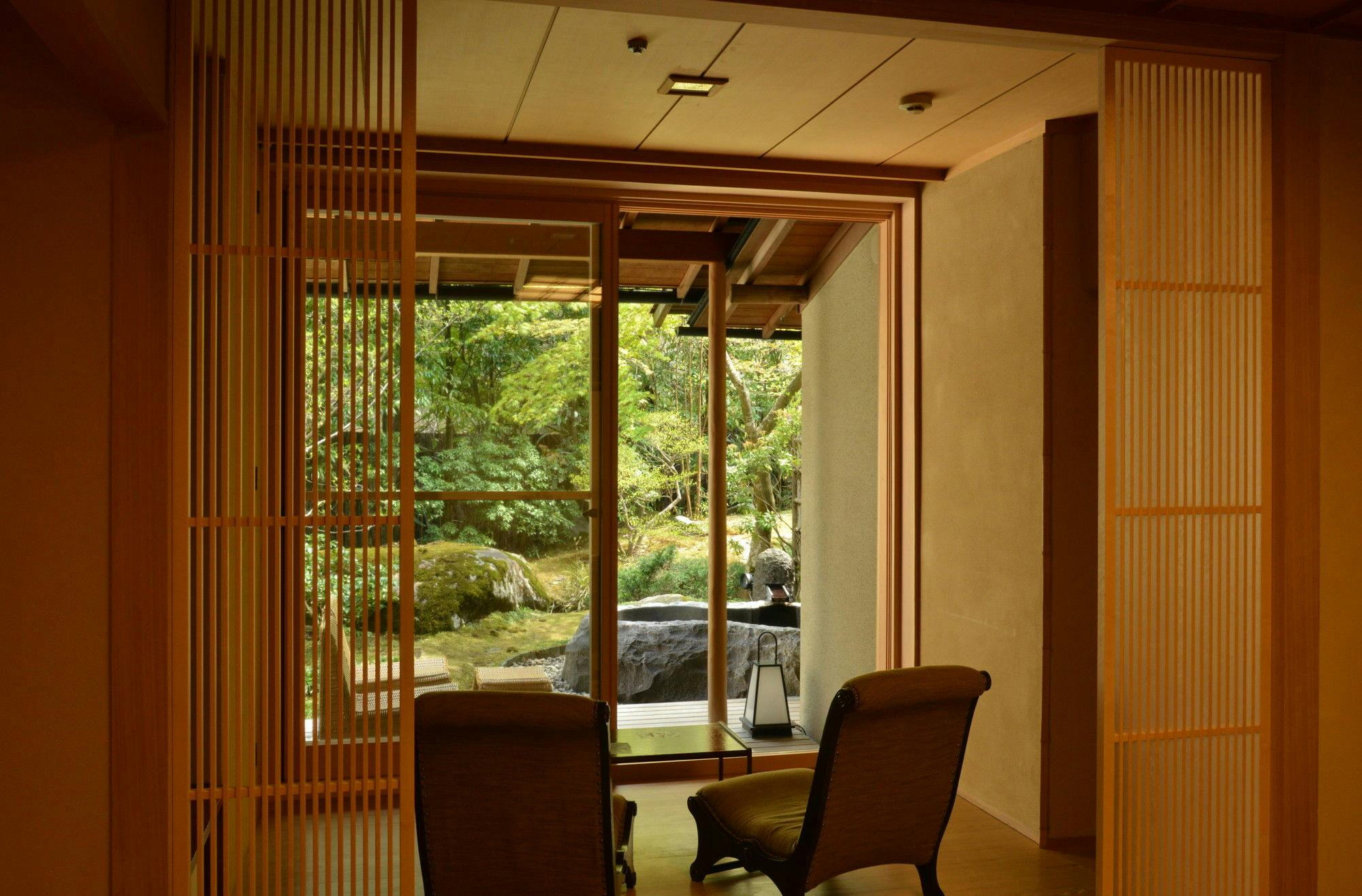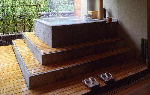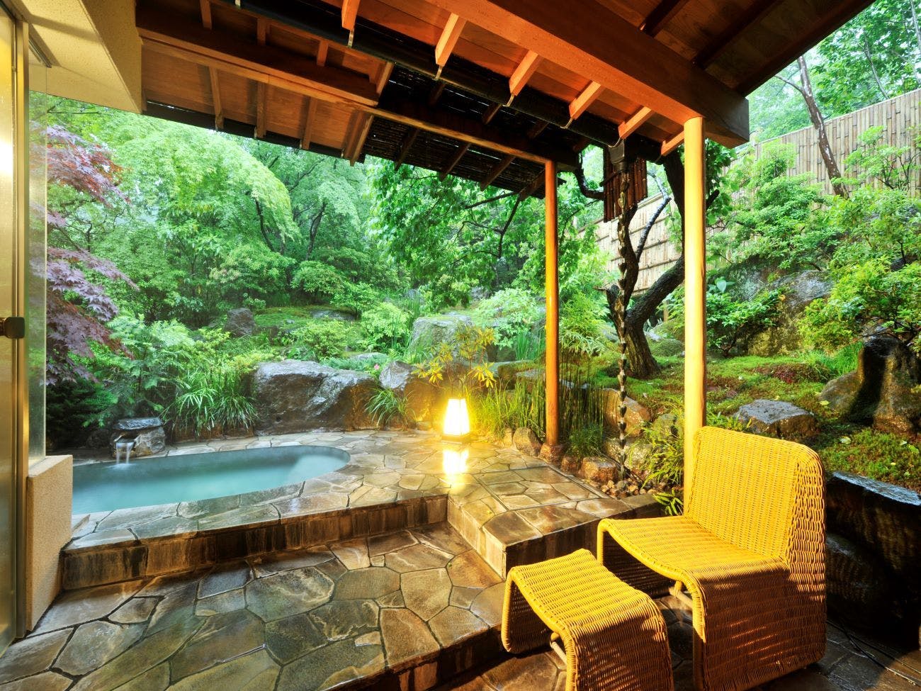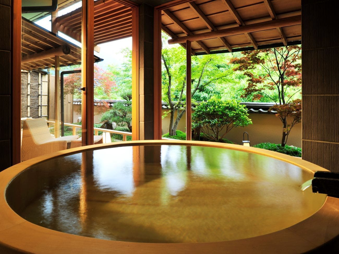 こんこんと湧き出る源泉かけ流しの温泉を天然石の湯舟でお愉しみいただけるこちらの客室では、窓際に面したソファーから四季折々の前庭の風景をご覧いただけます。