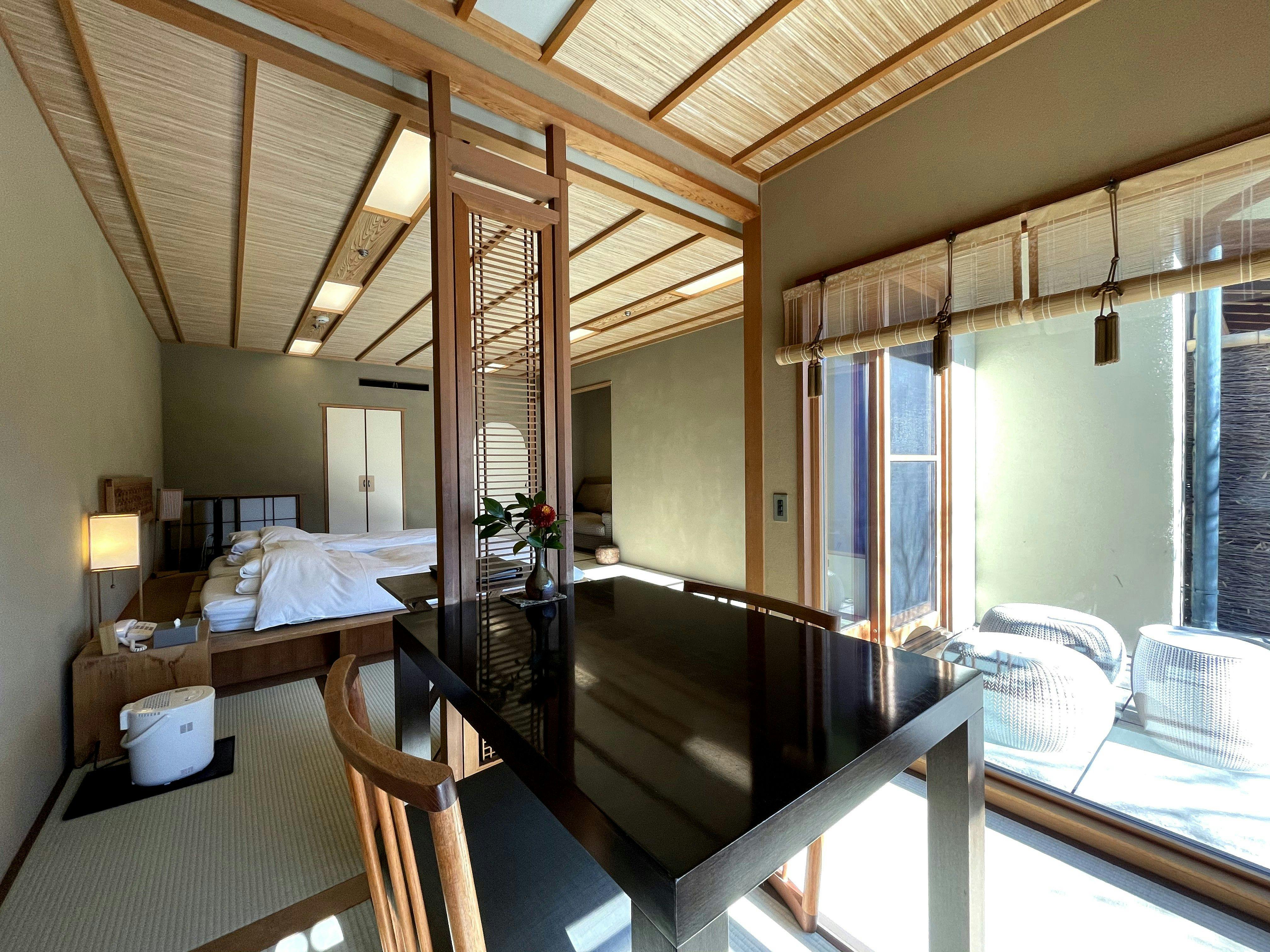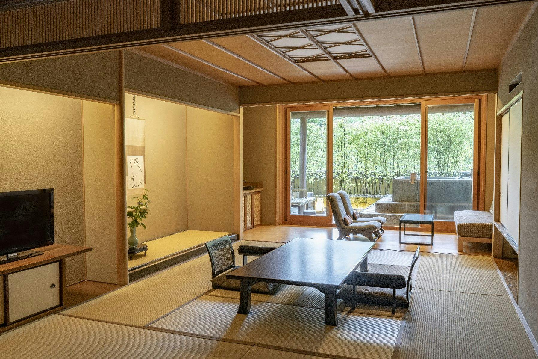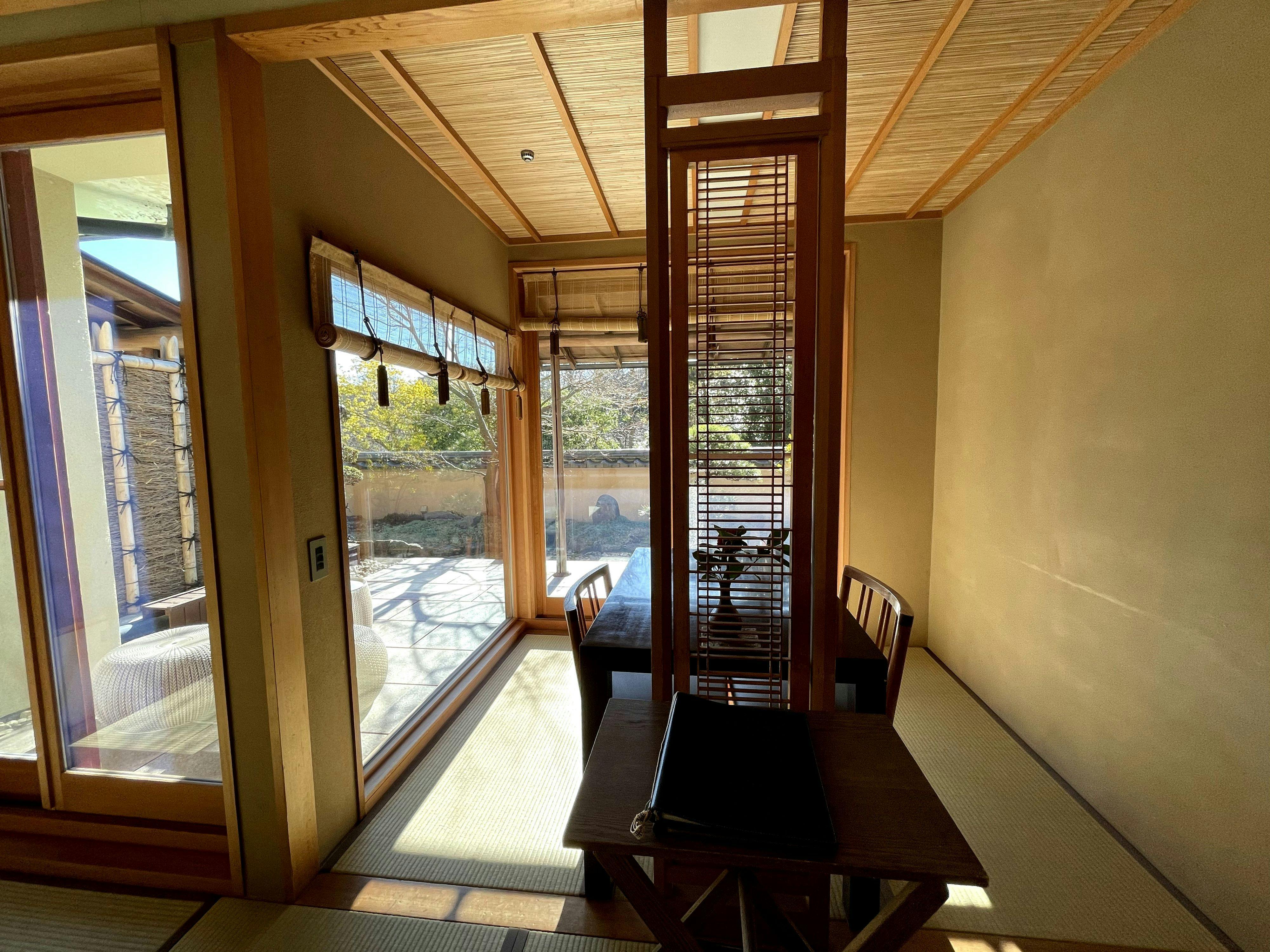 和室に畳ベッドとテーブル・椅子を備え、前庭に面した大きな窓から心地よい日差しが差し込む客室。室内には檜の内風呂を備えております。