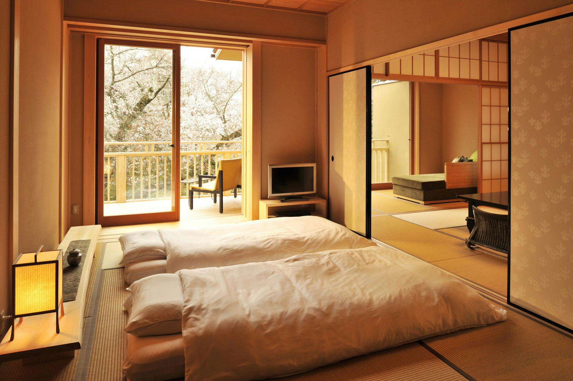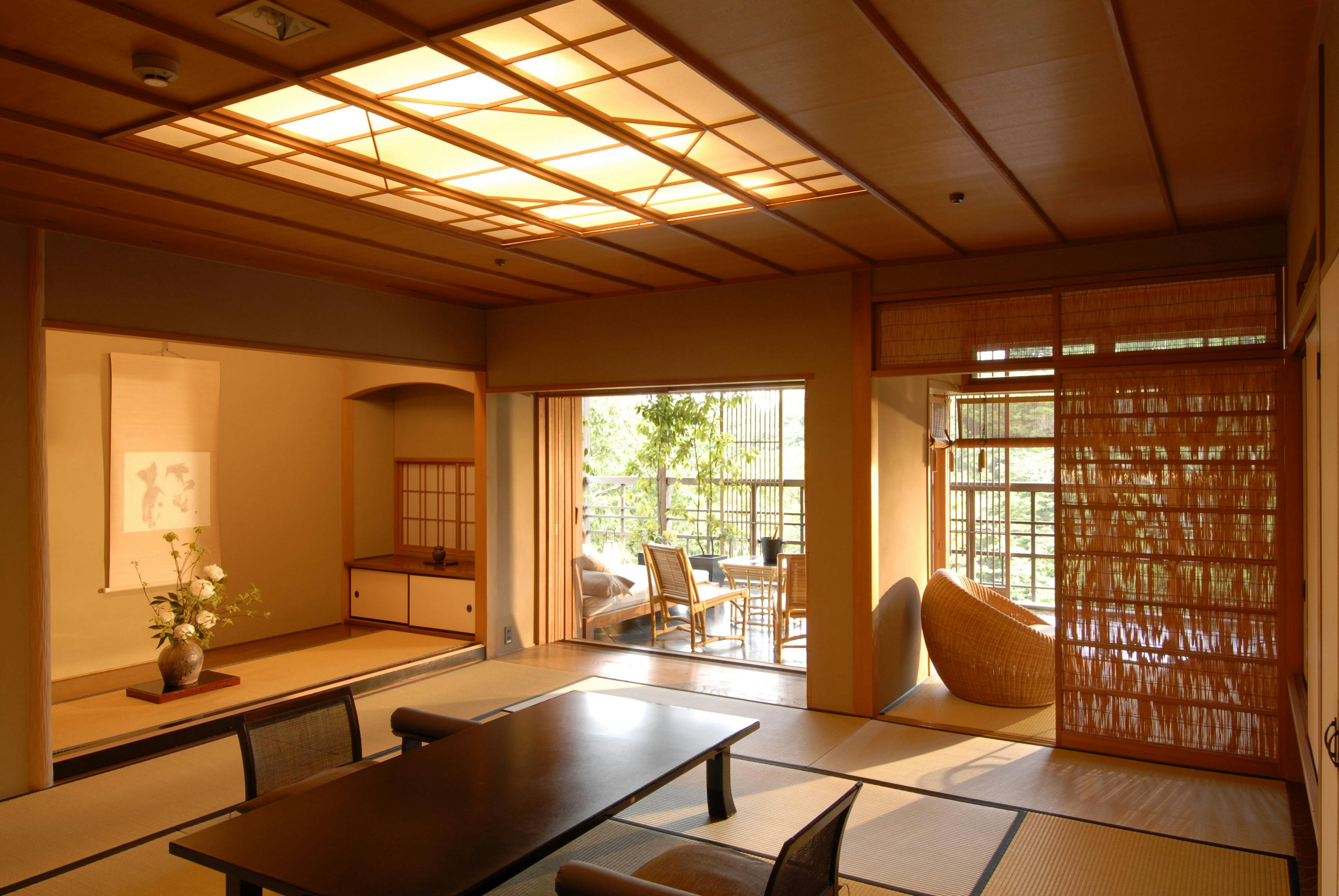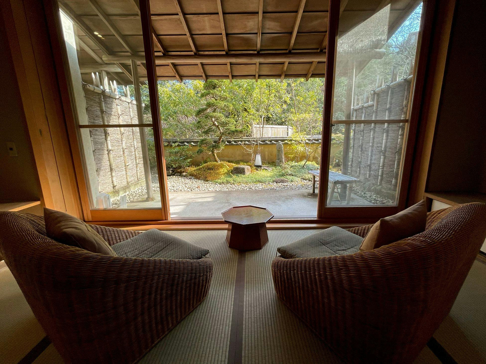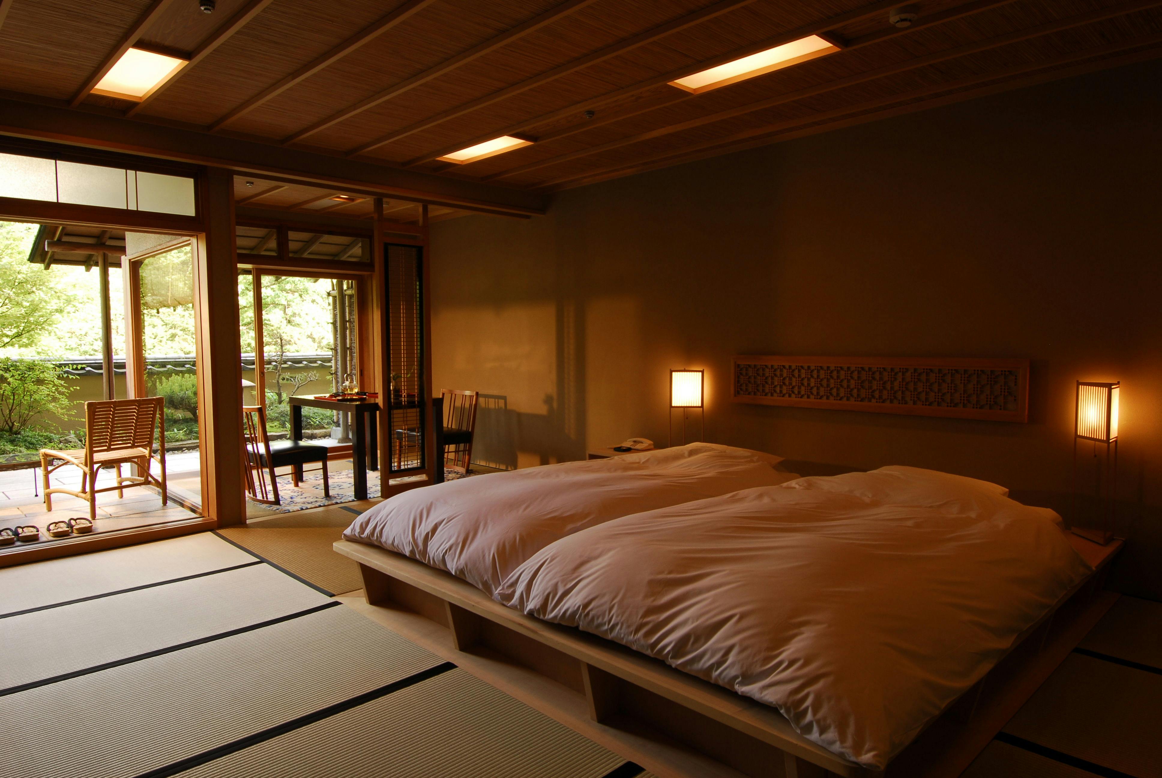 和室に畳ベッドとテーブル・椅子を備え、前庭に面した大きな窓から心地よい日差しが差し込む客室。室内には檜の内風呂を備えております。