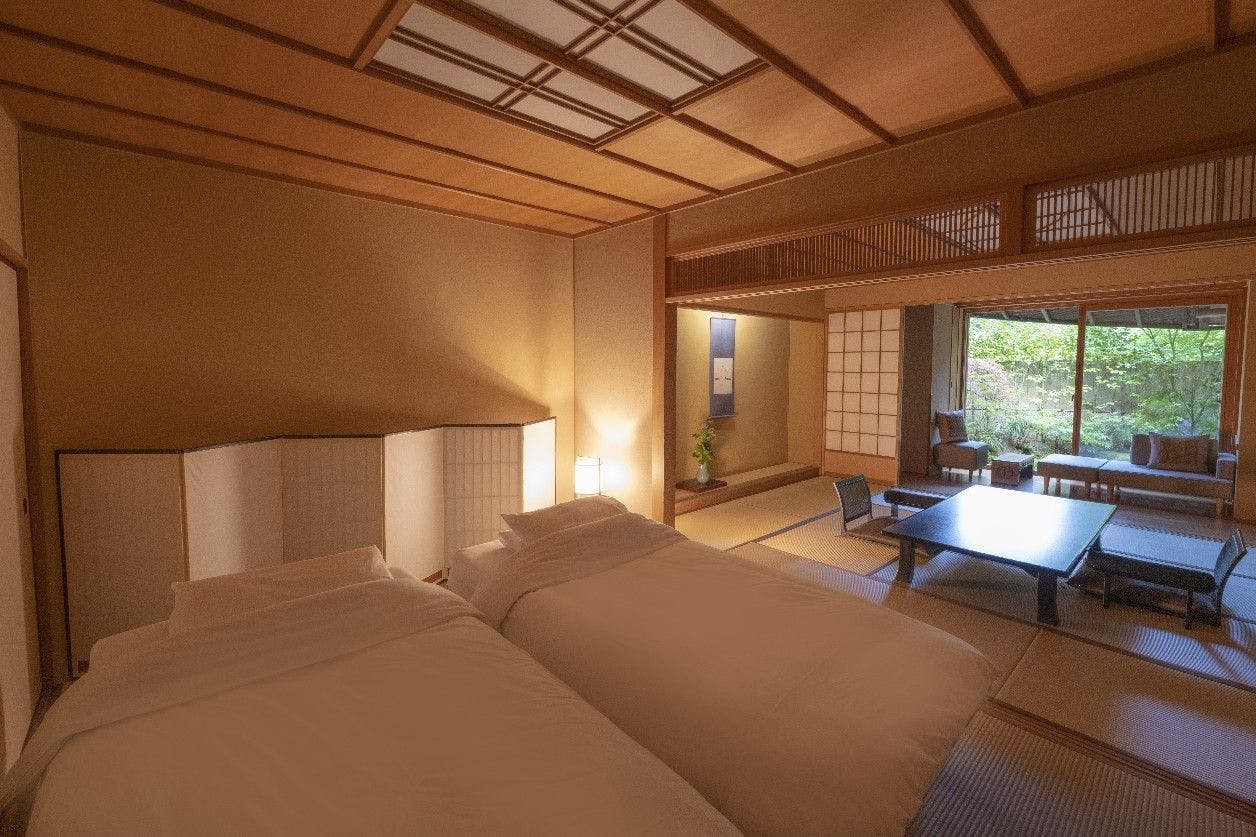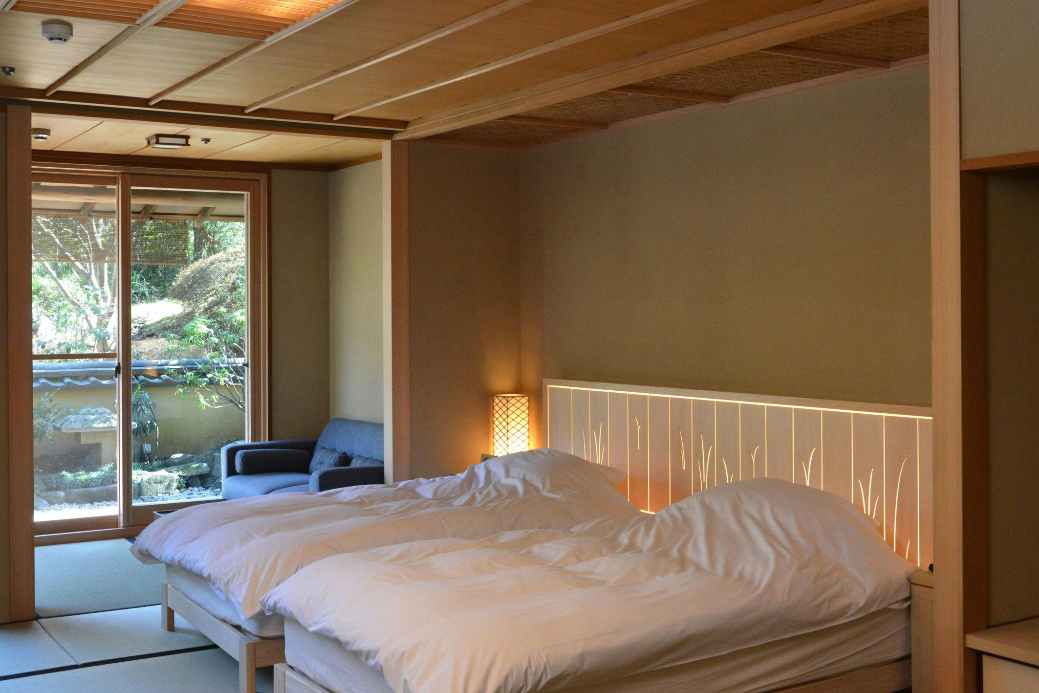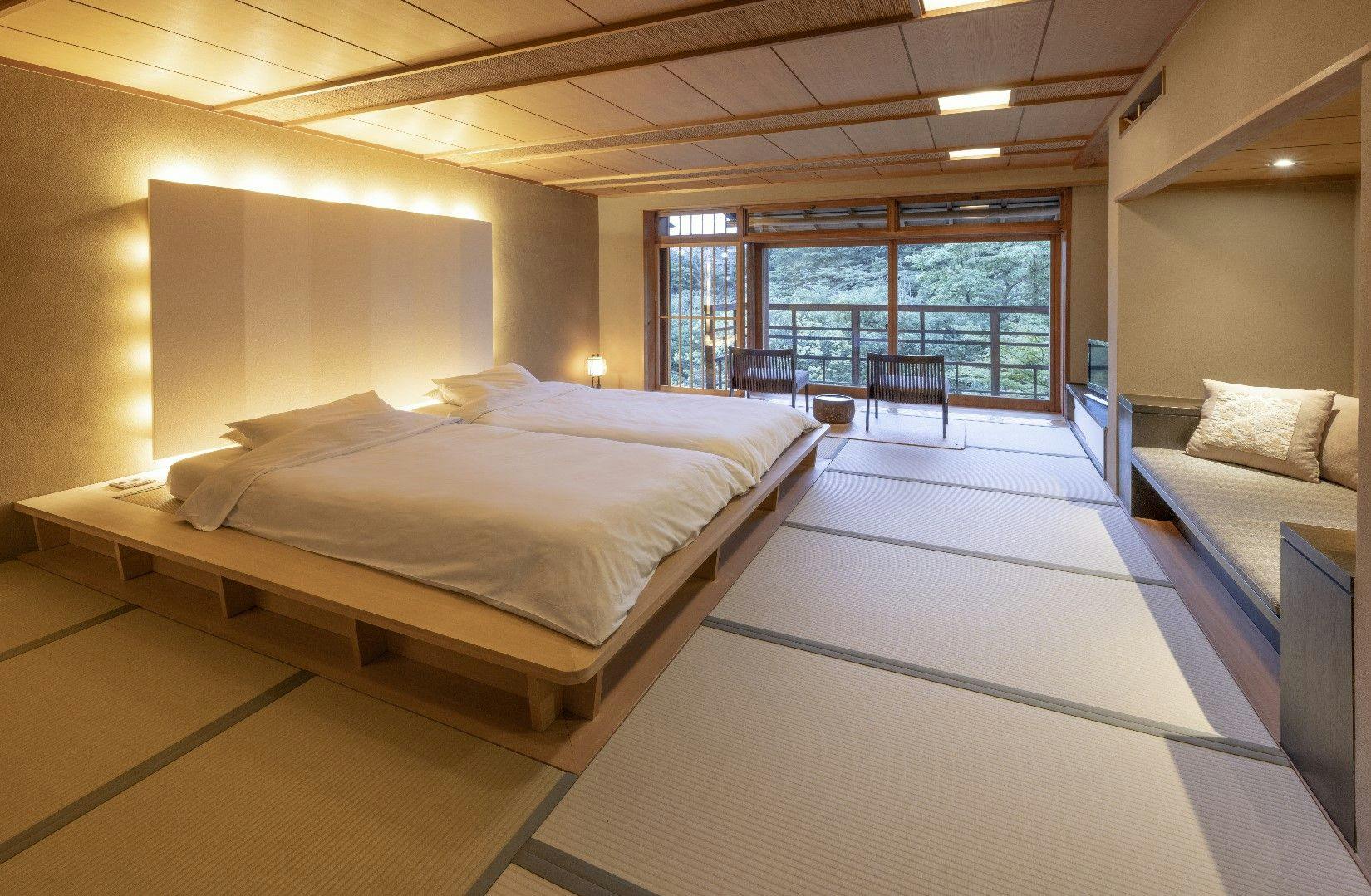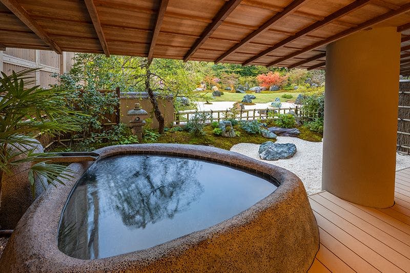 情緒ある源泉かけ流し露天風呂からは、枝垂れ桜や四季の花々で彩られた庭園をお愉しみ頂けます。室内はご夫婦やカップルでのご宿泊に最適な広さで、ベッドにお休み頂きながらお庭を眺められる造りになっており、枯山水庭園を望む別邸の醍醐味を存分にご堪能いただける客室です。