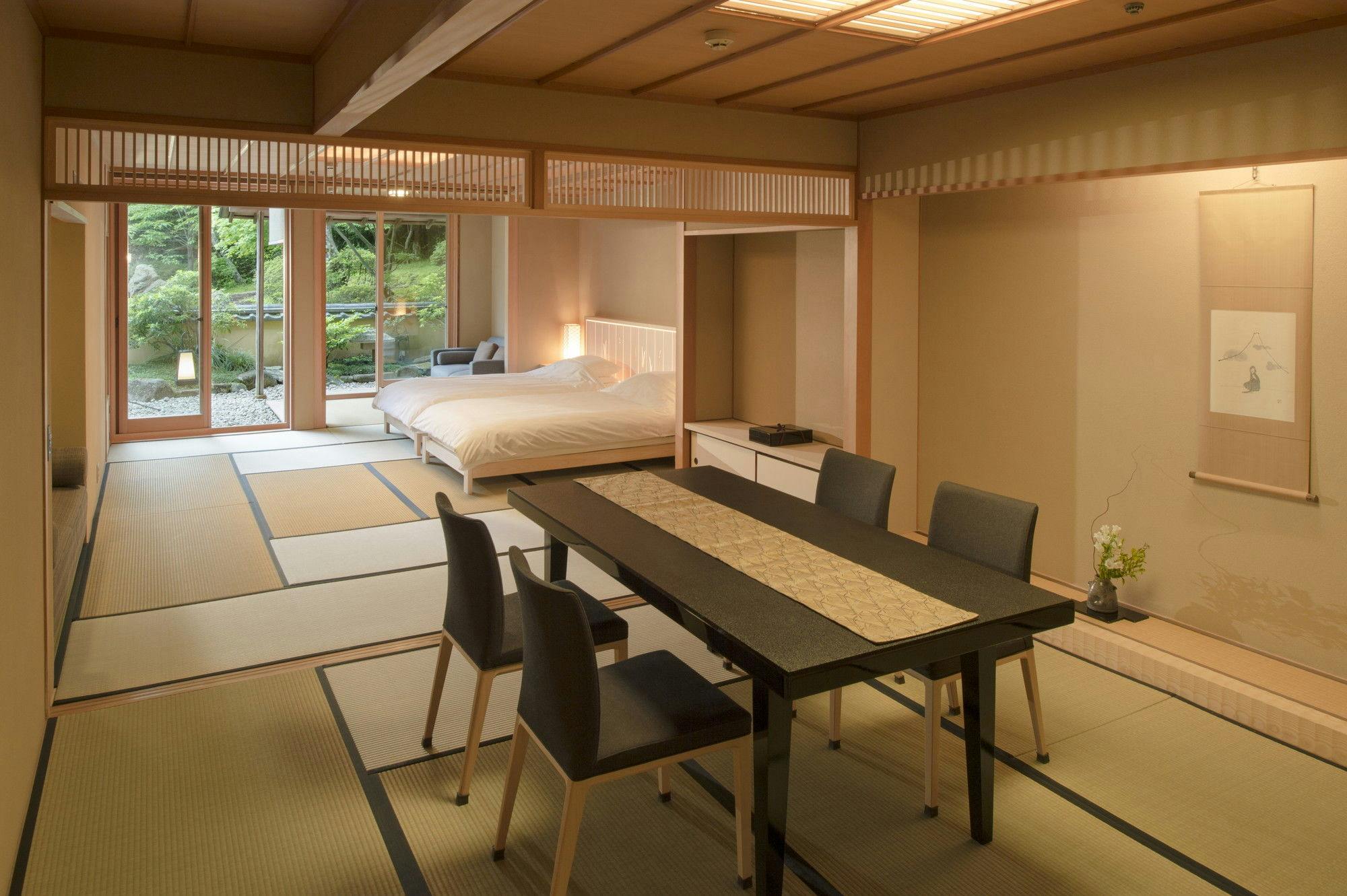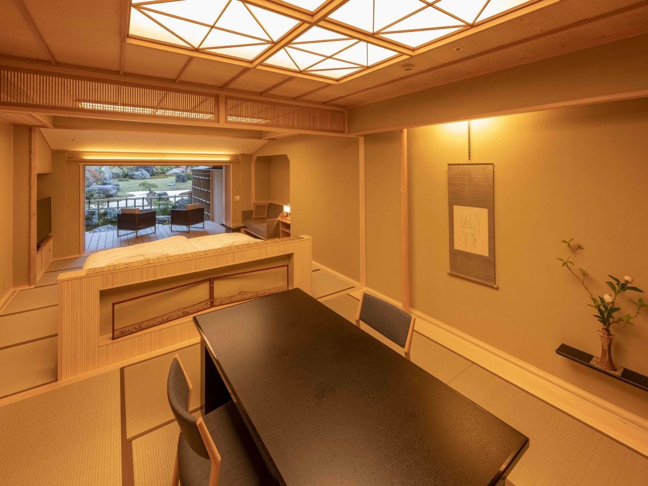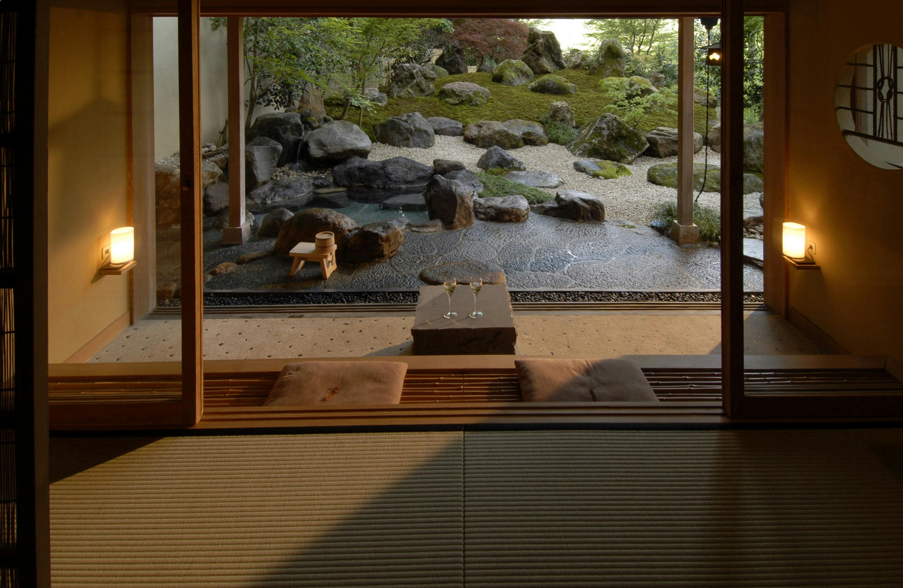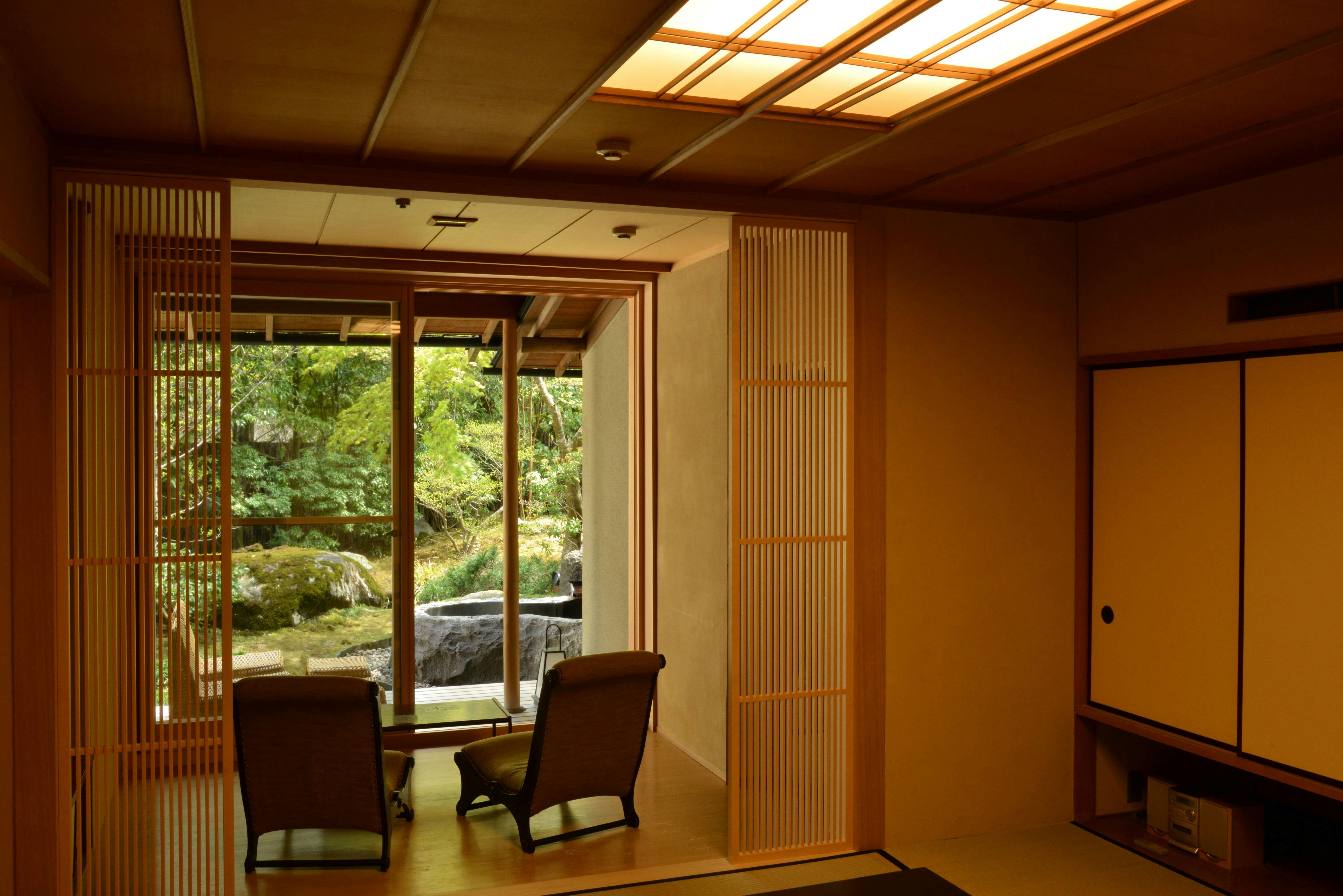 情緒ある源泉かけ流し露天風呂からは、枝垂れ桜や四季の花々で彩られた庭園をお愉しみ頂けます。室内はご夫婦やカップルでのご宿泊に最適な広さで、ベッドにお休み頂きながらお庭を眺められる造りになっており、枯山水庭園を望む別邸の醍醐味を存分にご堪能いただける客室です。