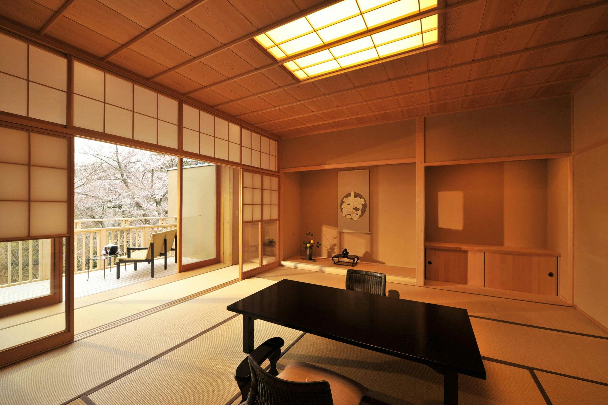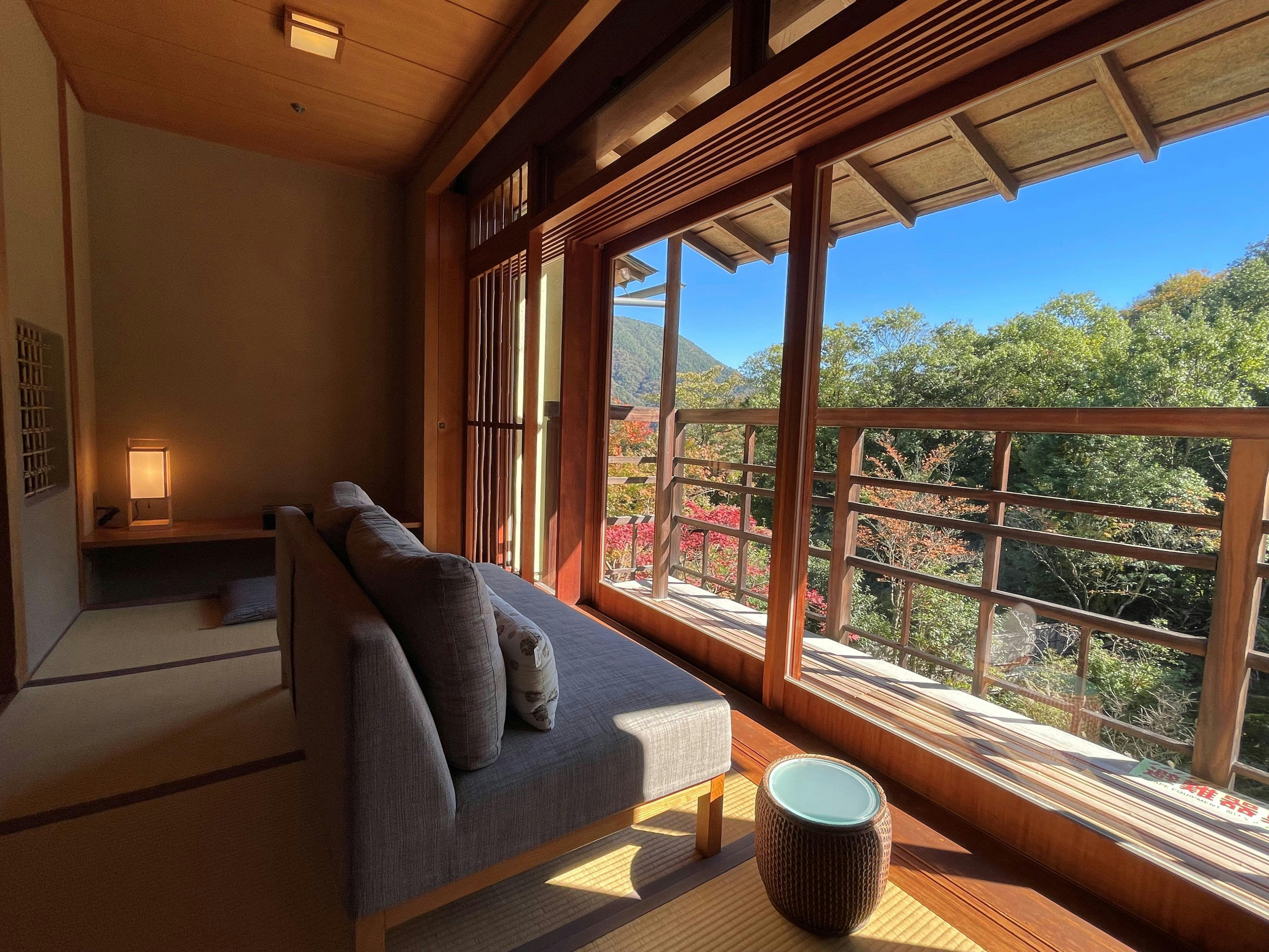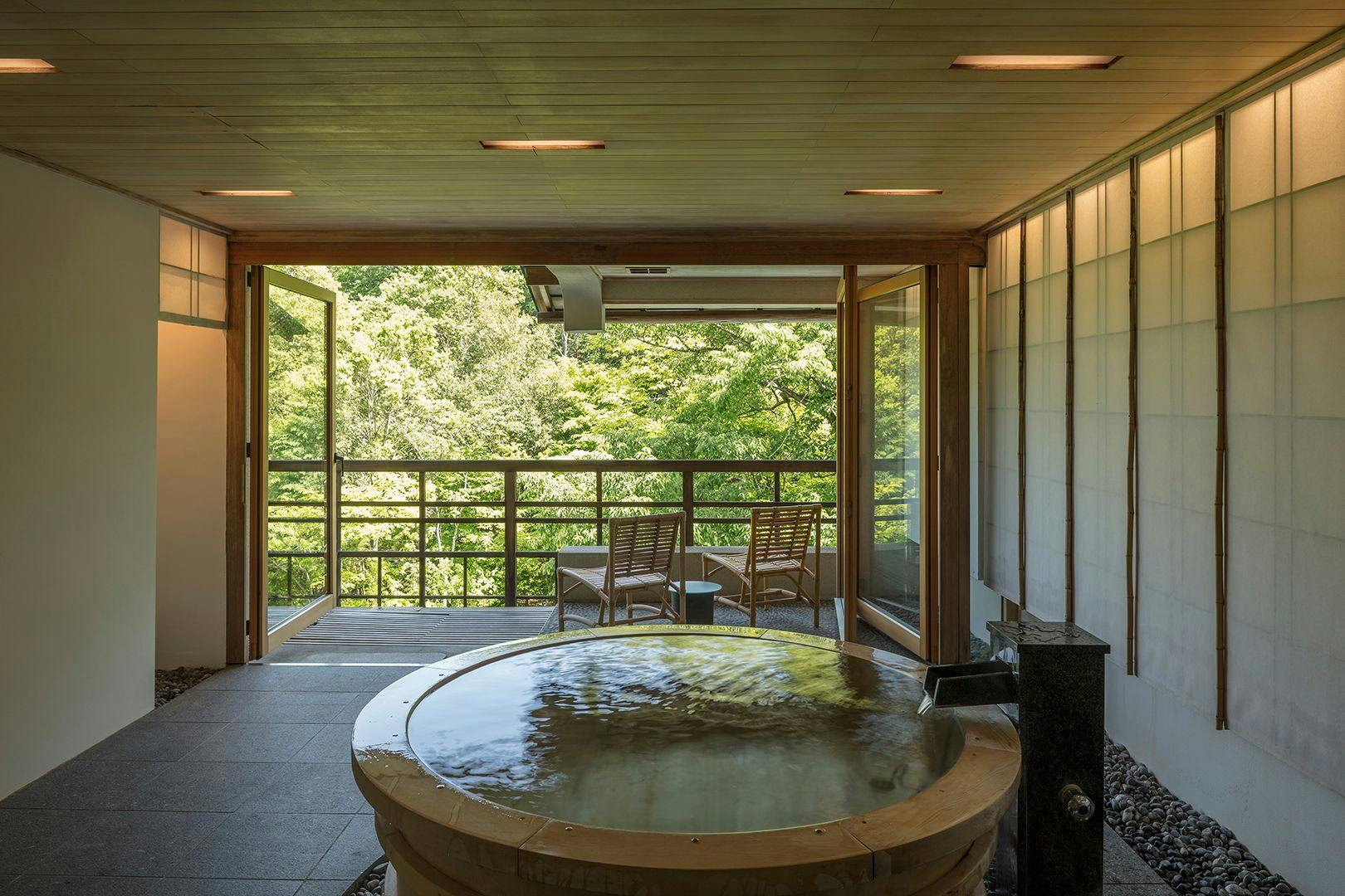 箱根の山々を一望できる広大なバルコニーと檜の展望風呂を備えた貴賓室。デイベッドやソファーが設えられたバルコニーへと続くガラス扉は完全に開放することができ、客室に居ながら箱根の自然を全身で体感していただけます。