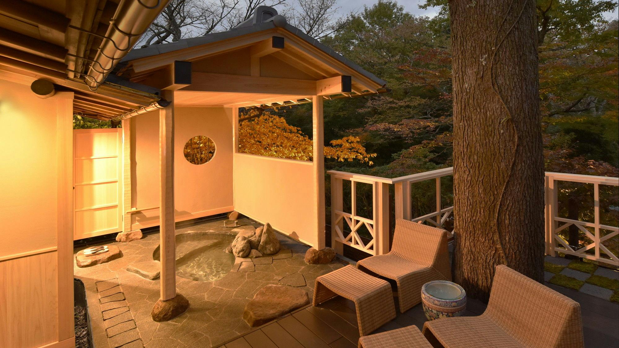 強羅花壇創業当時からの離れを改築し、20畳の日本間にツインベッドやソファーなどを配して現代的な居心地の良さも併せ持った客室。源泉かけ流しの露天風呂の隣には広々としたテラスが備わり、箱根の山々を望みながらの森林浴もお愉しみいただけます。朝夕のお食事は旧閑院宮別邸「懐石料理 花壇」の、趣ある個室にてお召し上がりいただけます。