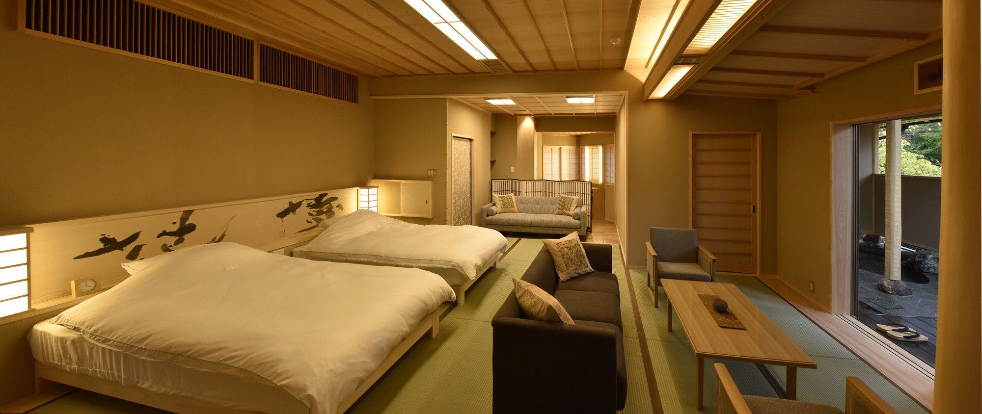 前庭に巨石をくり抜いた源泉かけ流しの露天風呂やスチームサウナを備えた客室。次の間にはツインベッドをご用意しております。