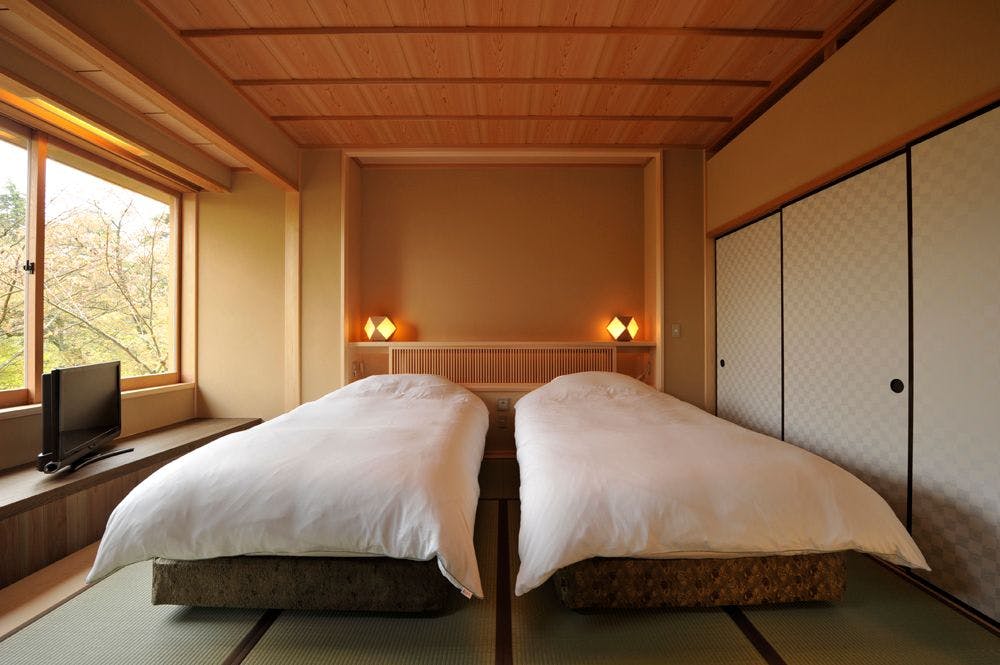 伝統的な和室の心地よさに、ツインベッドやテーブル・椅子など現代的な要素を調和させた客室。室内には檜の内風呂を備えております。