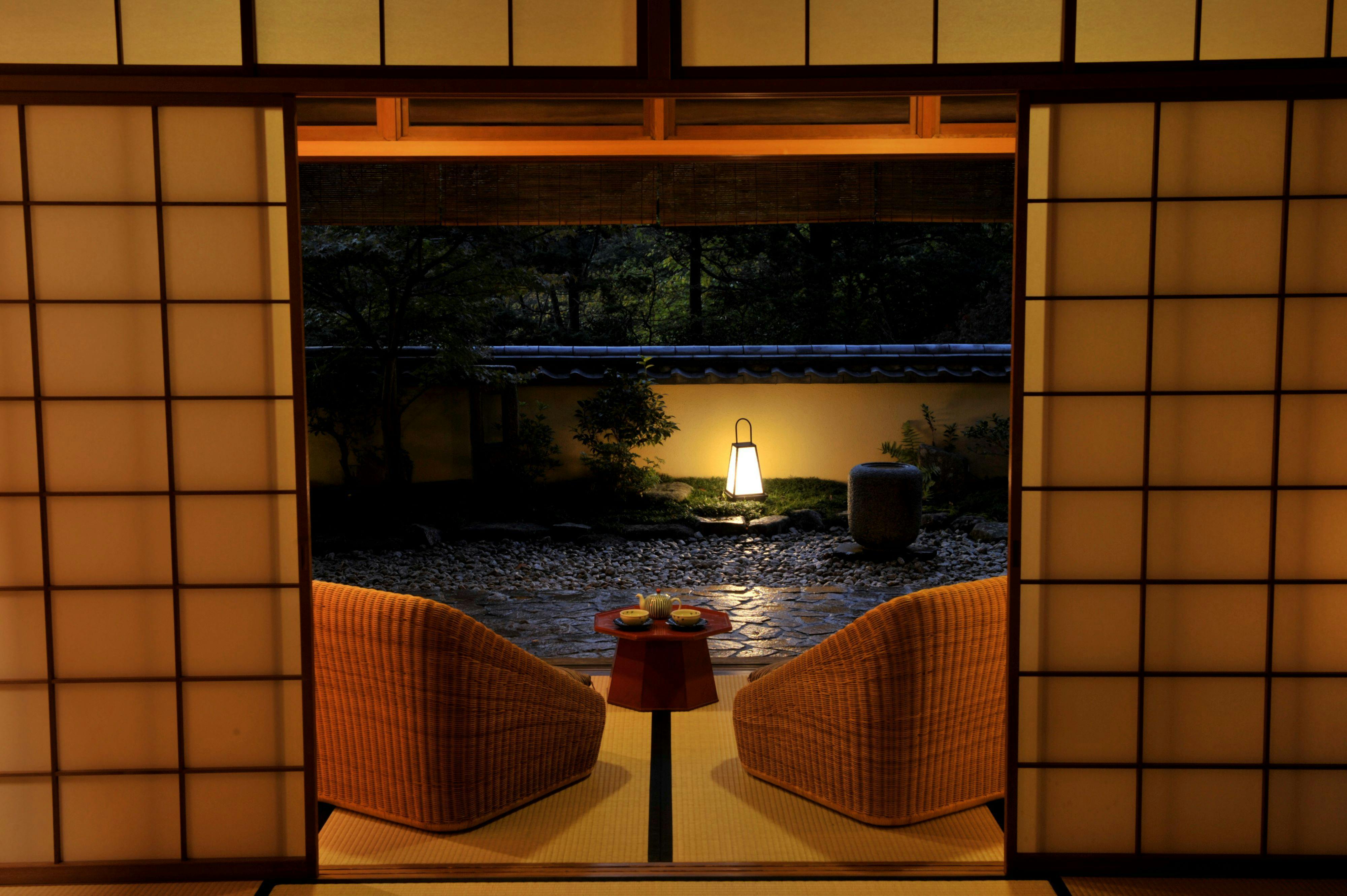 本間と次の間を有する純和風の室内は、お食事いただくお部屋とお休みいただく寝室を使い分けることができます。広縁に配されたソファーからは四季折々の前庭の風景をご覧いただけます。客室内には檜の内風呂も備えております。