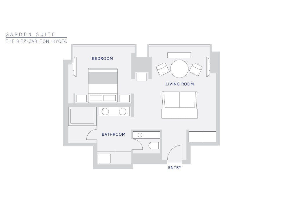 この部屋のために特別に備えた庭のある、静寂に包まれたスイート。ソファと二人掛けのテーブルがあるリビングルームと、キングサイズのベッドを備えたベッドルームから成る、心地よくくつろげる広さ65平米です。同じ大きさの円が重なり合いながら繋がっていく、吉祥を表す文様「七宝」など、伝統的なモチーフをインテリアにさりげなく、スタイリッシュに取り入れました。伝統を礎にした、今に息づく京都の美意識にふれる、豊かなひとときをお過ごしください。