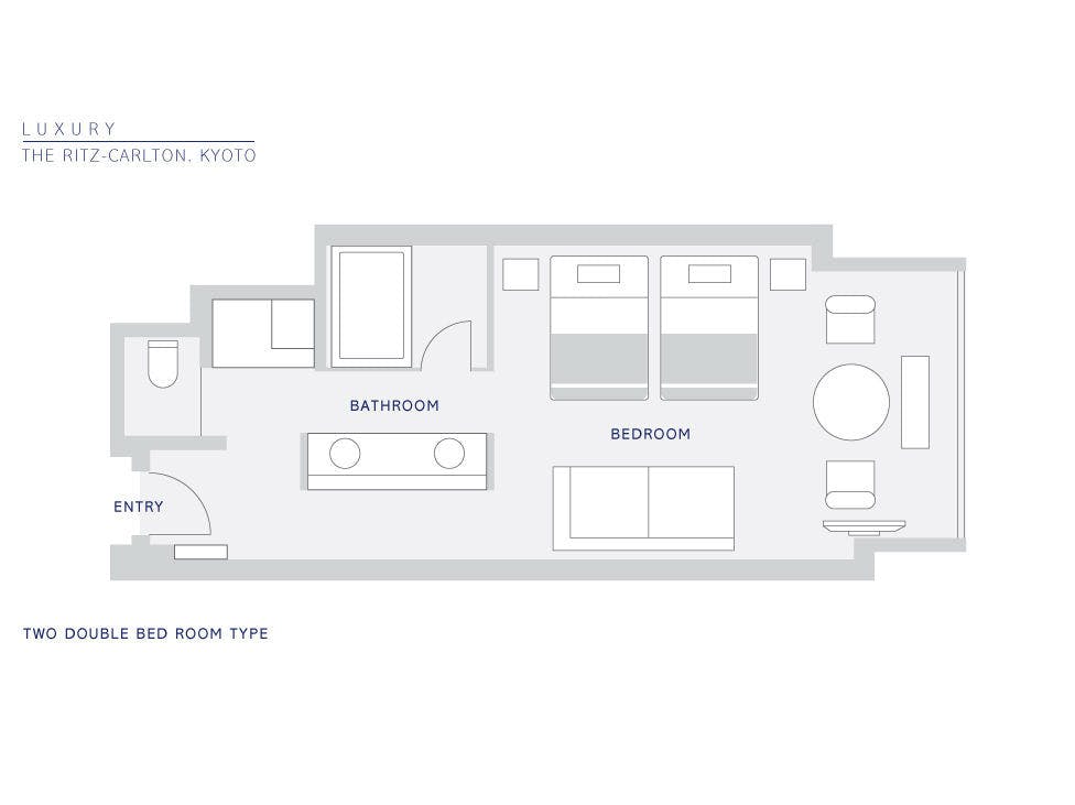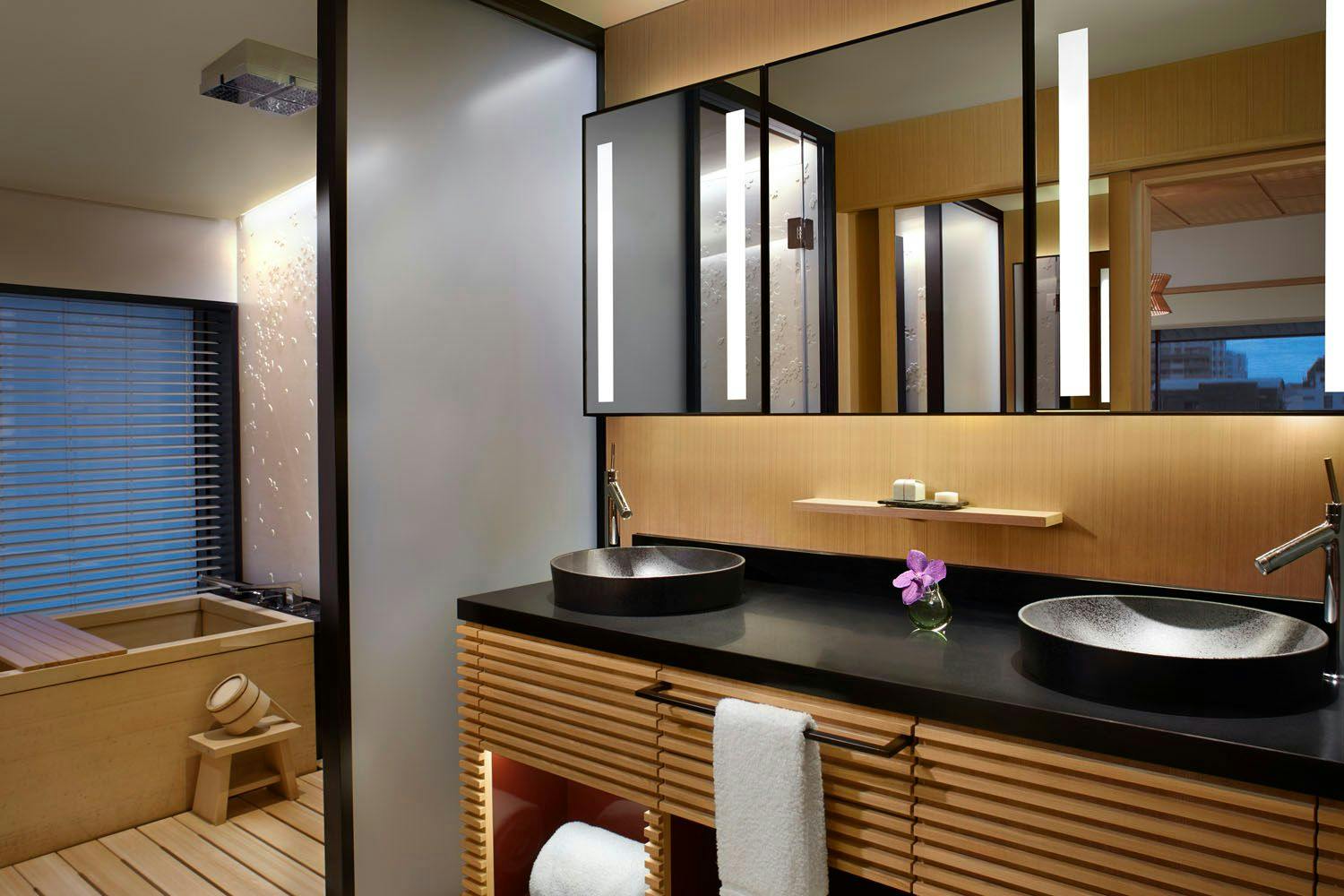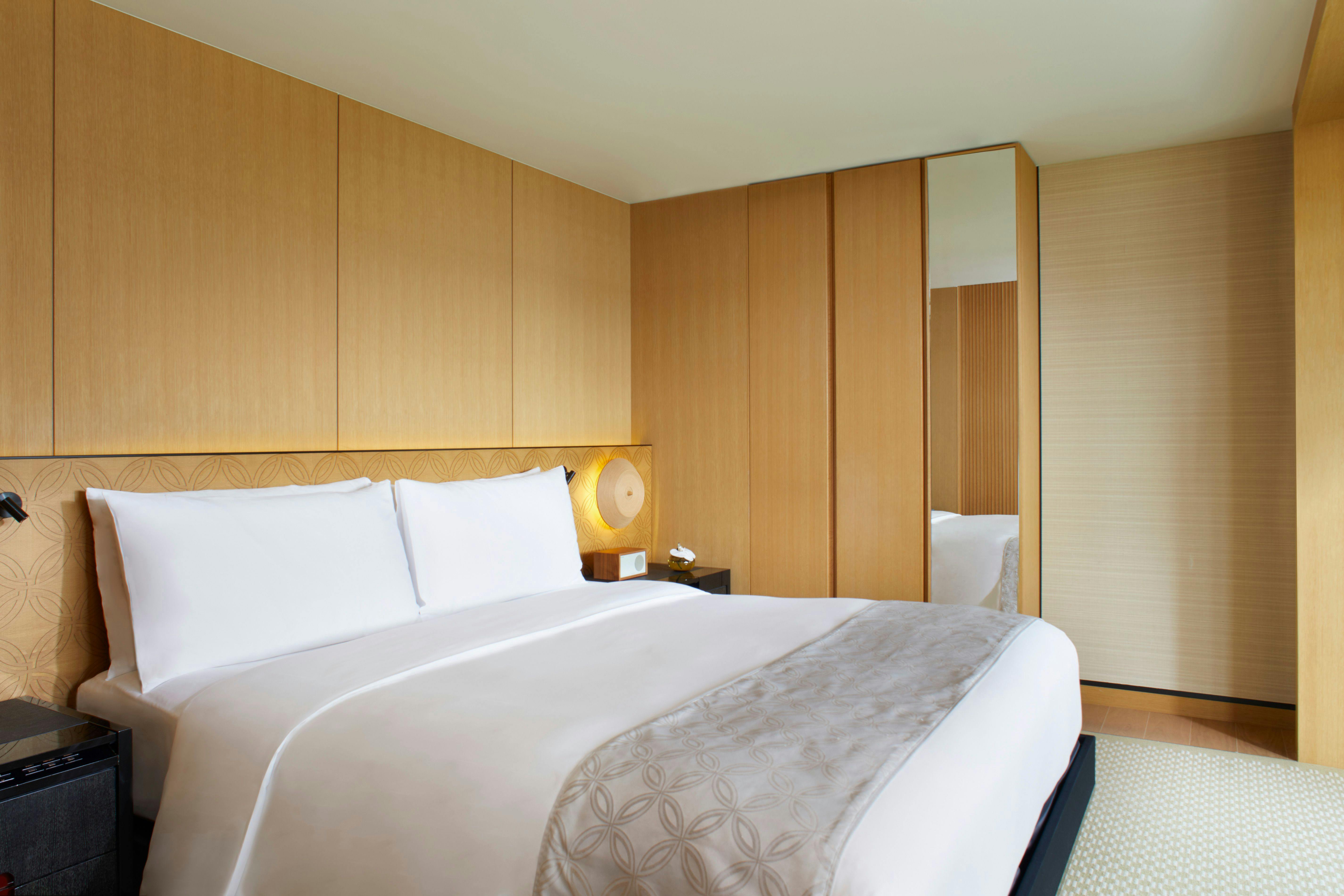 白砂を敷き詰め、石を配した、枯山水。自然の美を映す日本庭園に面したゲストルームです。庭と静かに向き合い、伝統的な町家で過ごすような、心穏やかなステイをお楽しみください。ベッドはキングサイズ、または、2つのダブルベッドを備えた2タイプをご用意。ソファや窓辺のテーブルで、ゆっくりとおくつろぎいただけます。同じ大きさの円が重なり合いながら繋がっていく、吉祥を表す文様「七宝」をはじめ、光と影を美しく織りなす照明など、インテリアには日本の美意識を表すモチーフをさりげなく取り入れました。今に息づく伝統の美にふれる、洗練された空間をご満喫ください。