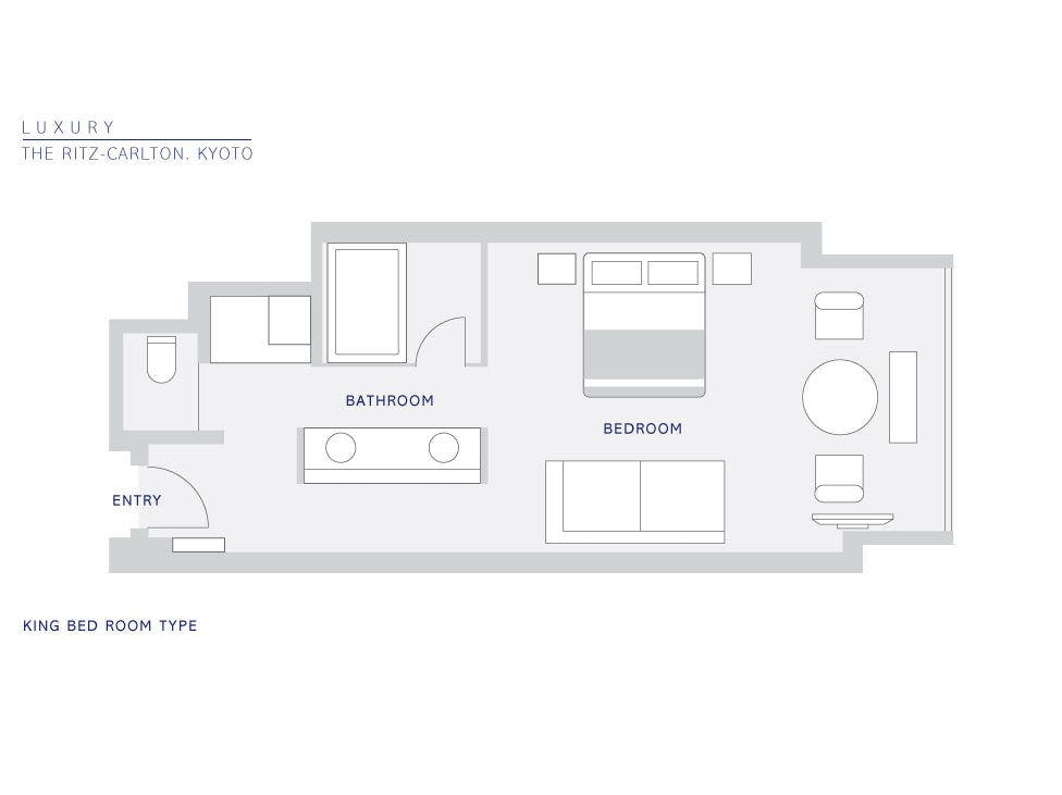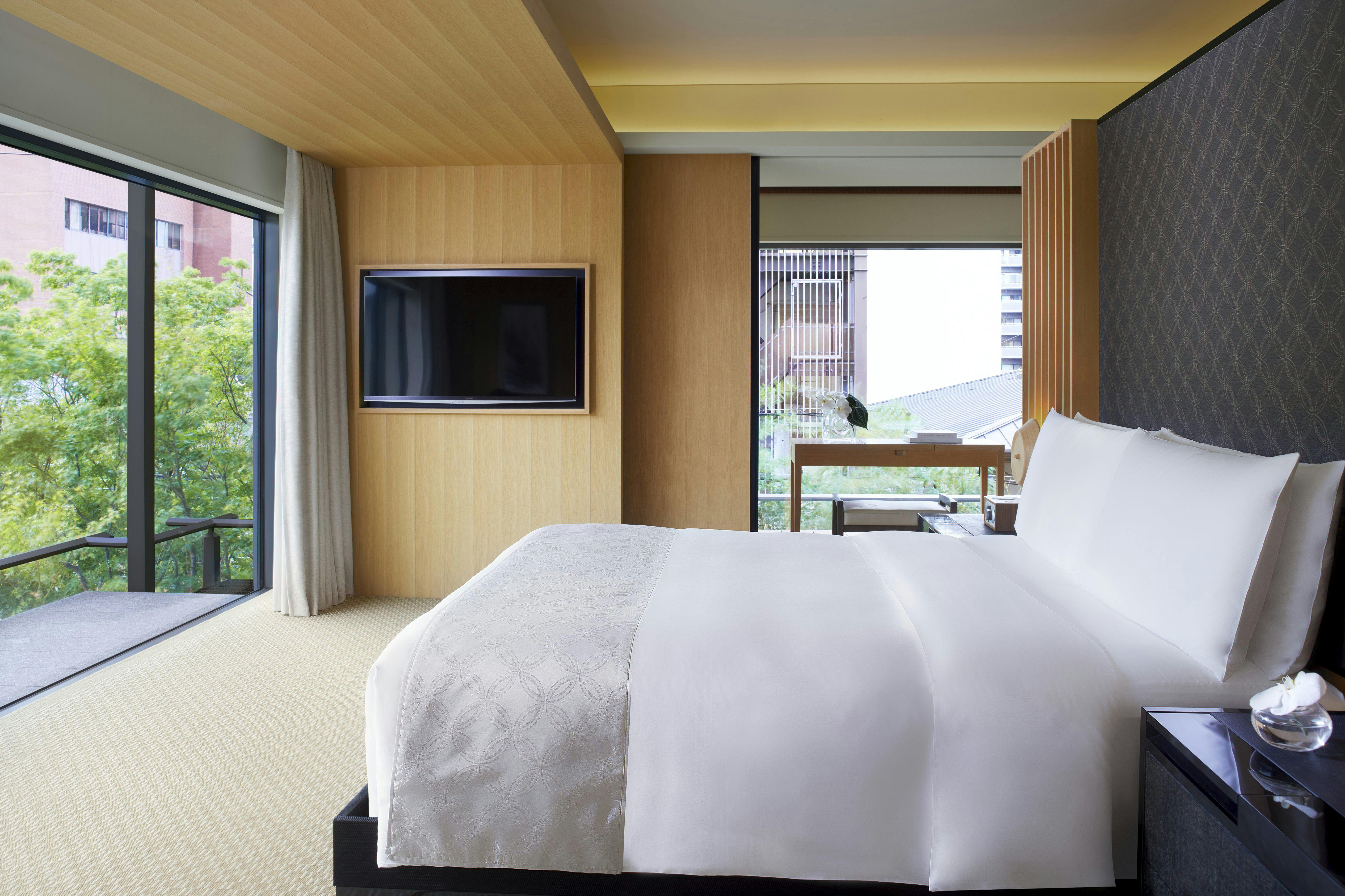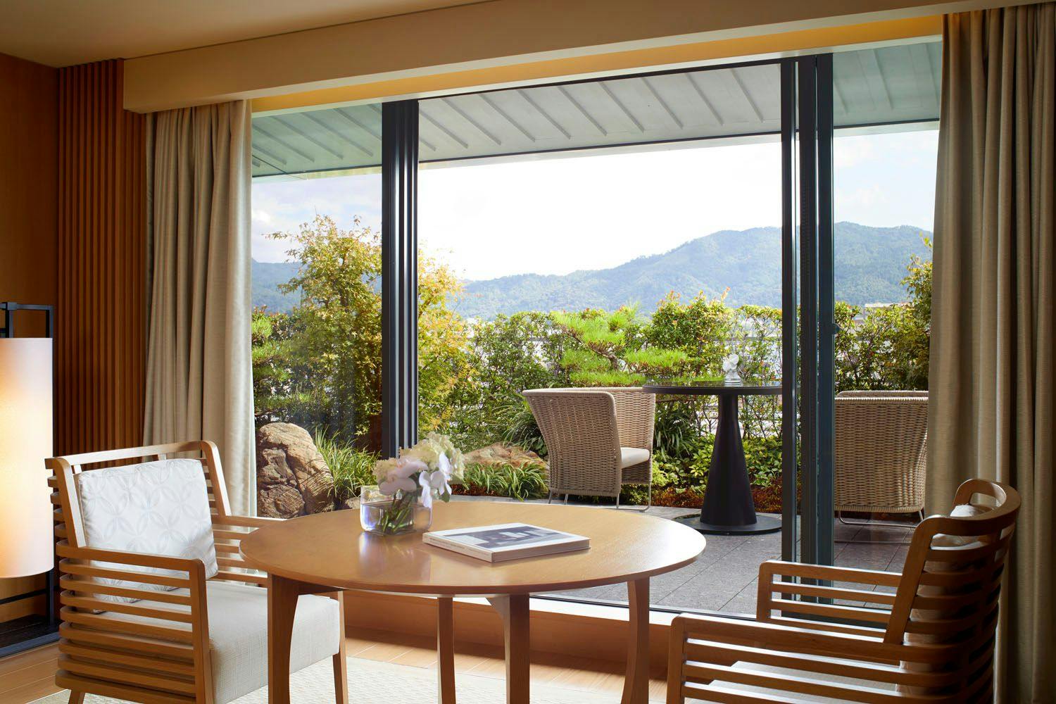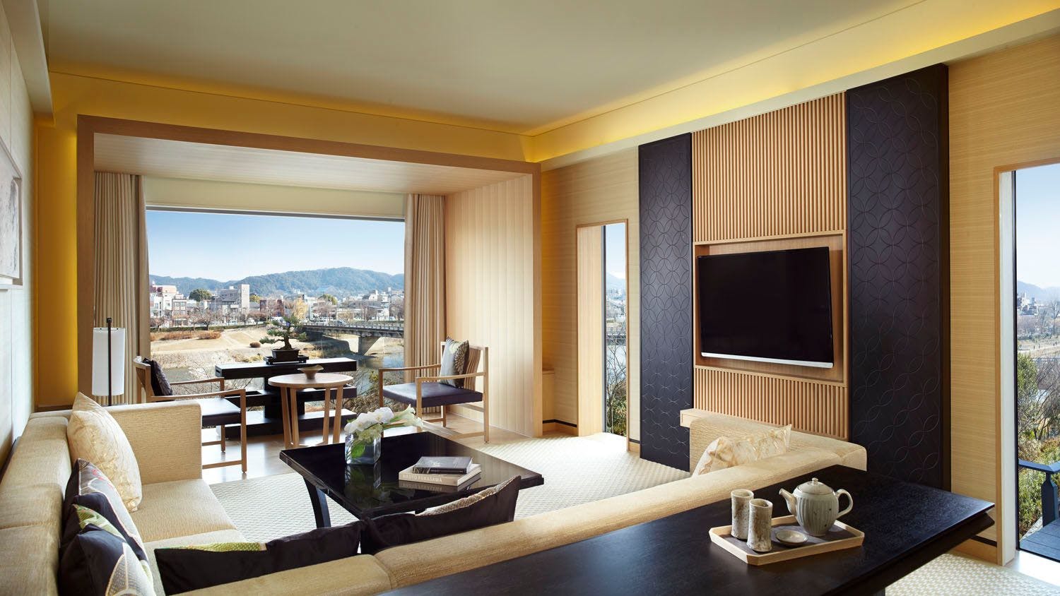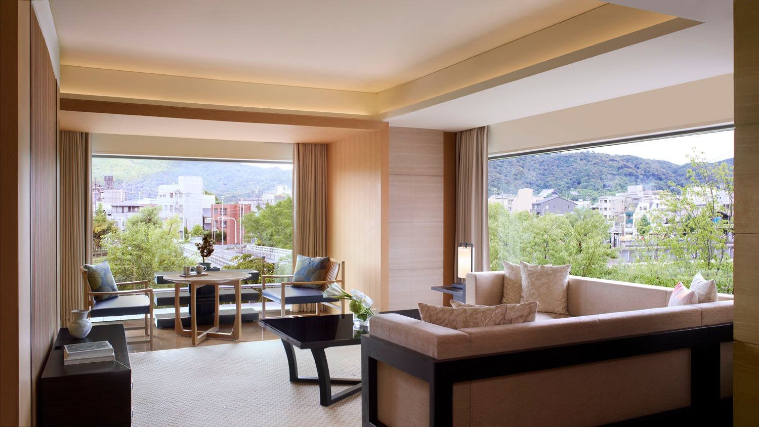 東向きの窓一面には、鴨川と東山三十六峰の絶景。全55室が52平米以上で鴨川に面しており、ザ・リッツ・カールトン京都の象徴とも言うべきお部屋。町家の縁側に見立てたリビングスペースからは、季節の彩りの景色をお楽しみいただけます。京都に息づく美意識を感じる、洗練された空間で思い出に残るステイをお楽しみください。