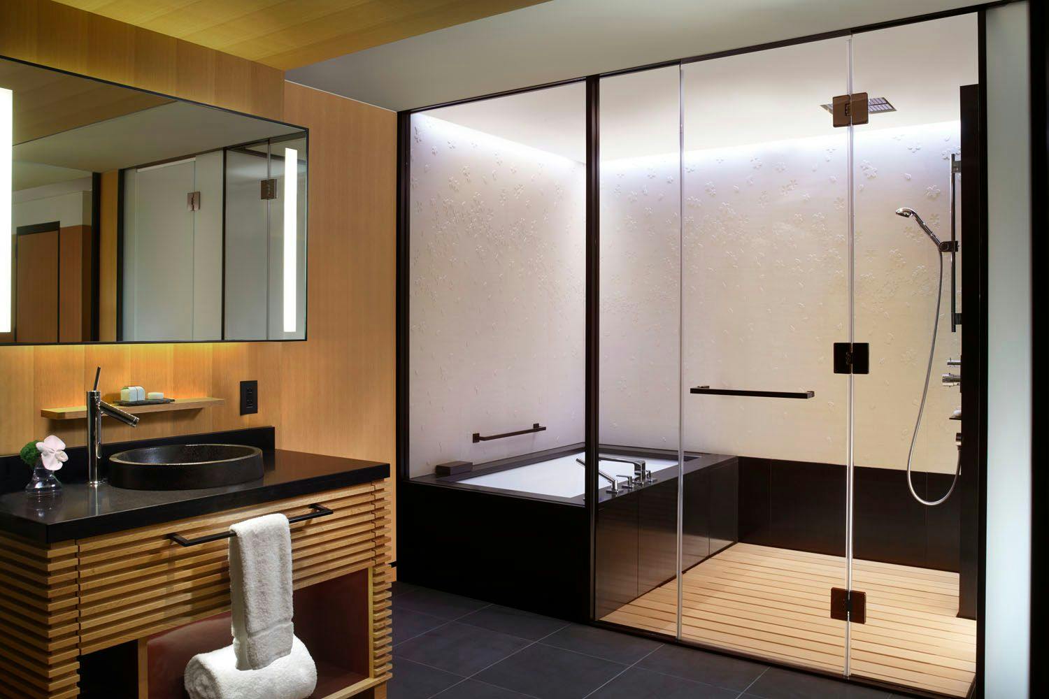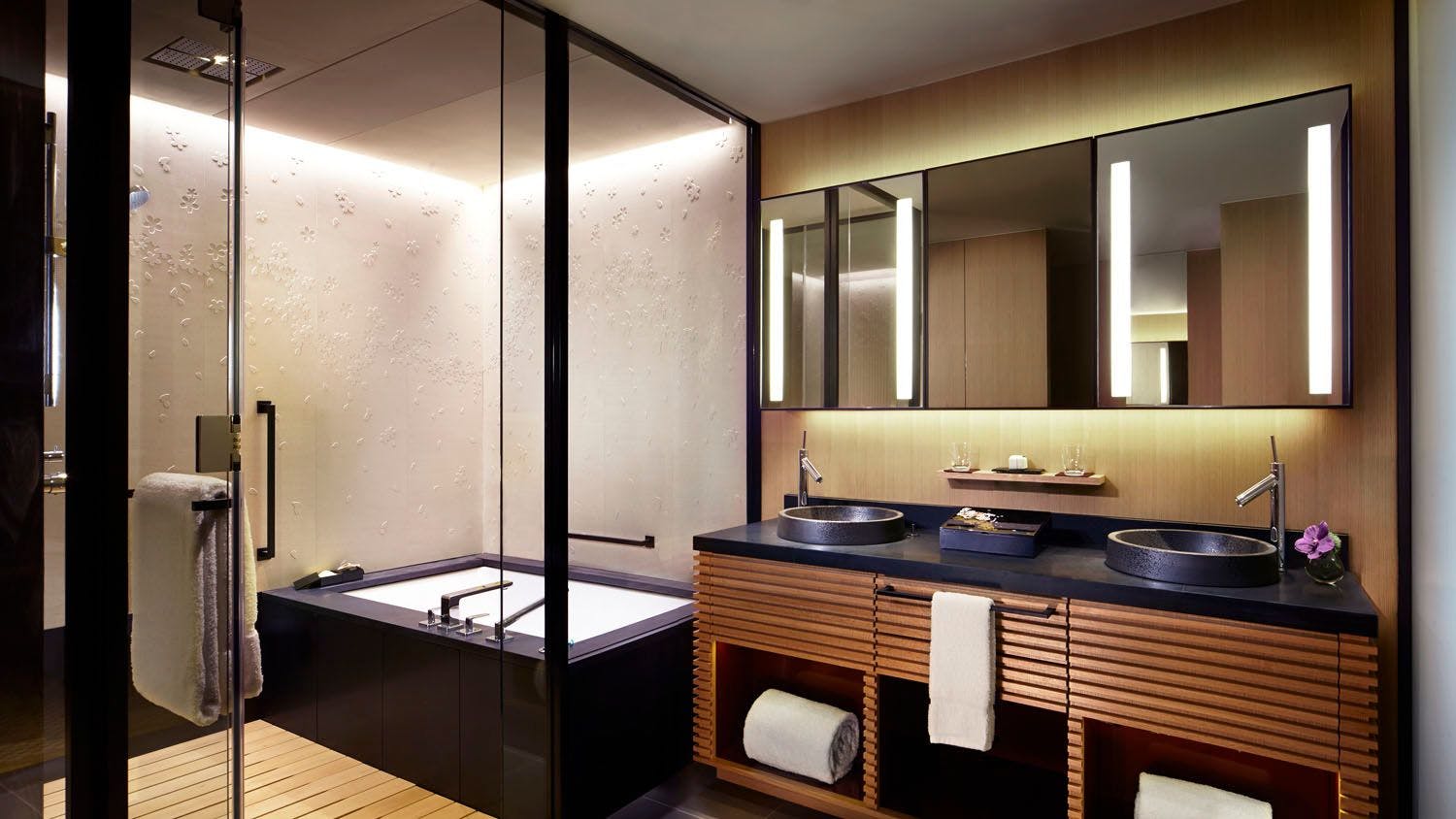 明るく、モダンで、機能的。ゆったりとした二人掛けのソファ、また、窓辺にはテーブルとラウンジチェアを備え、ゆっくりとおくつろぎいただけます。同じ大きさの円が重なり合いながら繋がっていく、吉祥を表す文様「七宝」をはじめ、光と影を美しく織りなす照明など、インテリアには日本の伝統的なモチーフをさりげなく取り入れました。気品あふれる落ち着いたお部屋で、穏やかな時間をお過ごしください。