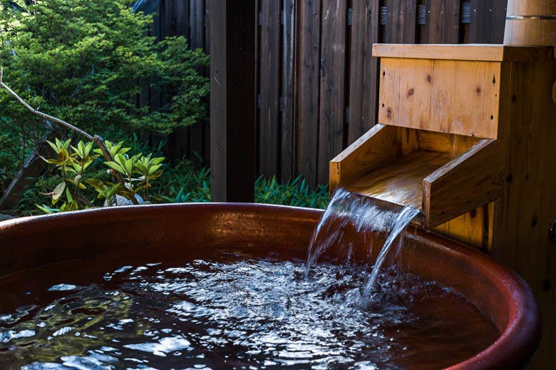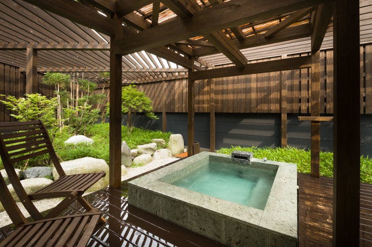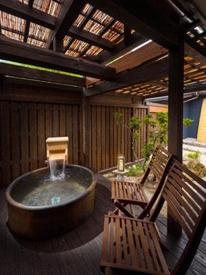 露天風呂・庭園付の準離れで、ろ棟唯一の特別室となります。お部屋は、和室2間と露天風呂と庭園となっております。客室露天風呂で誰にも邪魔されない特別な時間をお過ごしいただけます。