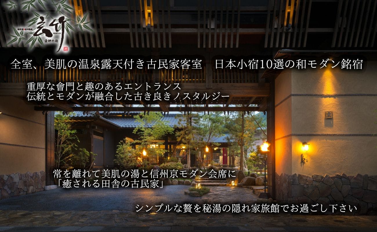 全室、温泉露天付き。日本小宿10選の和モダン銘宿。重厚な會門と大正浪漫を感じるノスタルジー。常を離れて美肌の湯と信州京モダン会席に「癒される田舎の古民家」シンプルな贅を秘湯の隠れ家でお過ごし下さい。