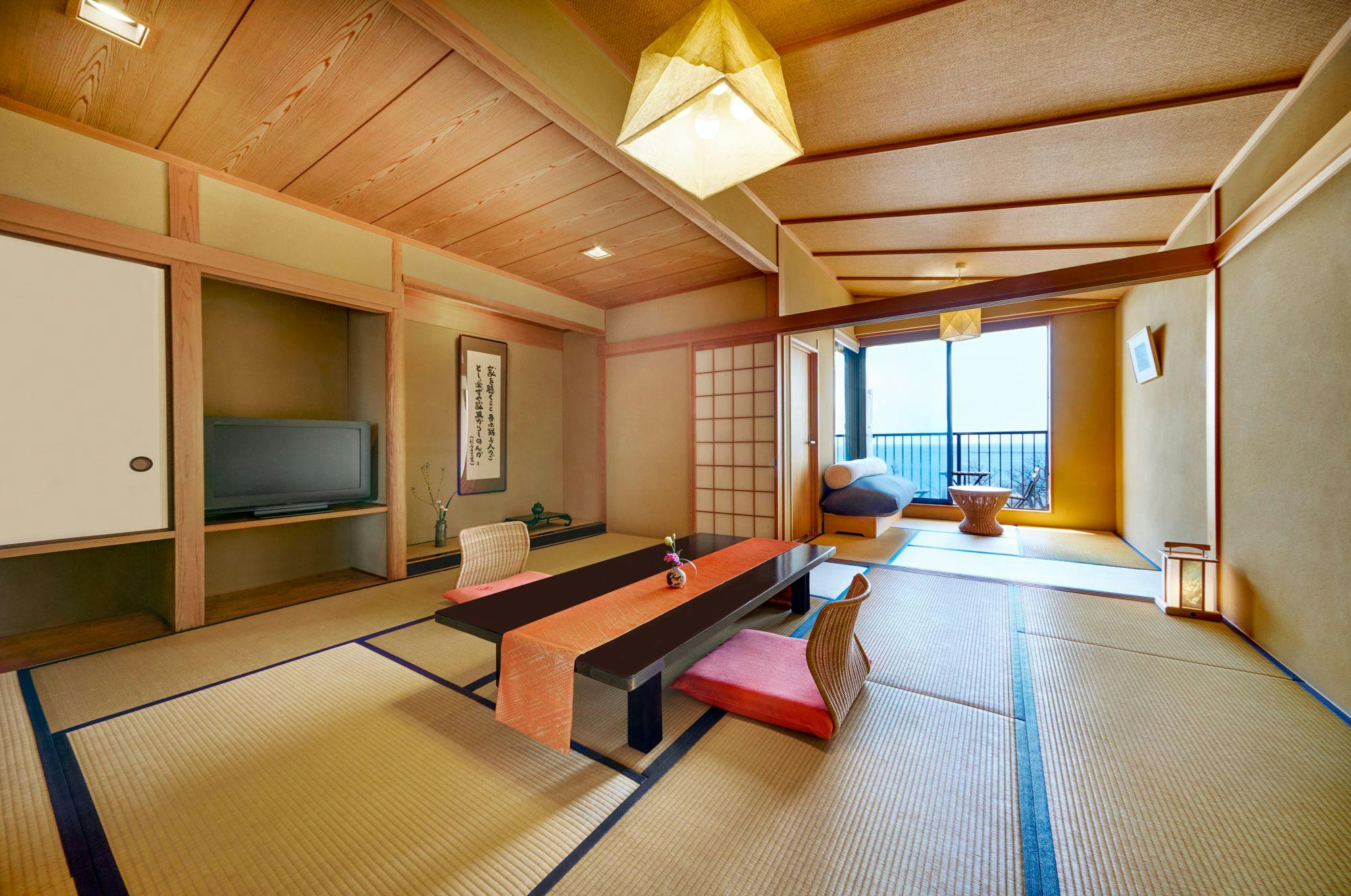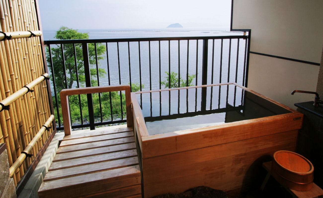全館畳敷きの廊下と、全室にしつらえられた客室露天風呂。湯船につかりながら眺める、びわ湖に浮かぶ竹生島。四季折々の海の幸、山の幸を使った京風会席、湖魚料理の数々。湖畔の別宅での贅沢なひとときを。