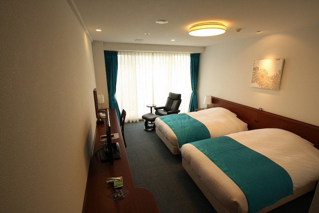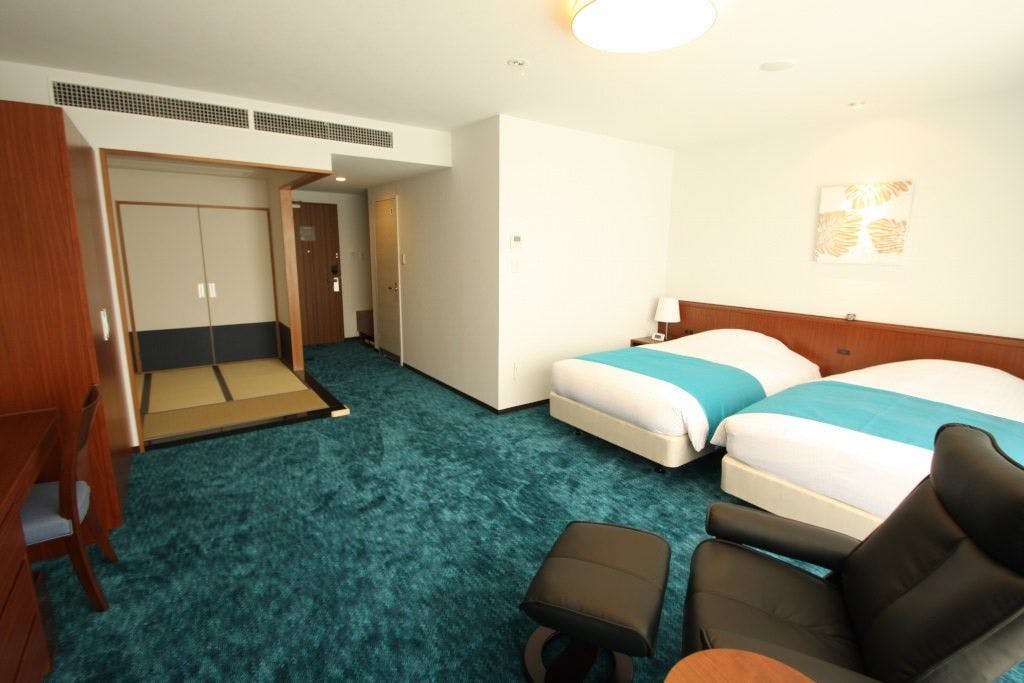 当ホテル最大の広さを誇るデラックスツイン。このお部屋のくつろぎの空間には和畳の和みスペースが含まれております。晴れた日には名瀬のコバルトブルーに輝く海も臨むことができます。またバストイレは分かれており、このお部屋でのご入浴でもリラックスタイムをご提供します。ファミリー、カップルユース、そして自分へのご褒美にも最適のお部屋です。