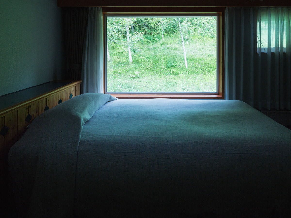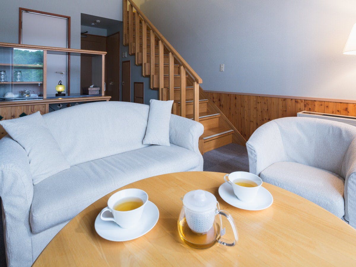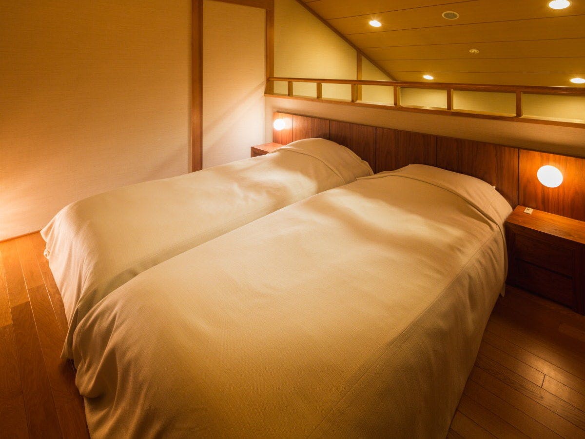 1階がリビングとバルコニー・2階がベッドルームのメゾネットタイプの造りになっております。ベッドに寝転ぶと大きな窓から美しい自然の景色が望めます。3名様からは1階和室にお布団をご用意いたします。