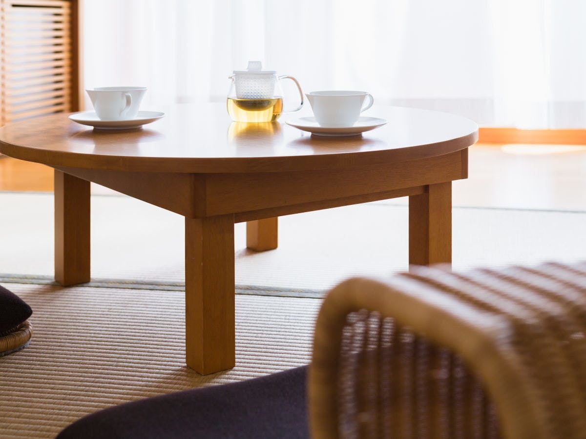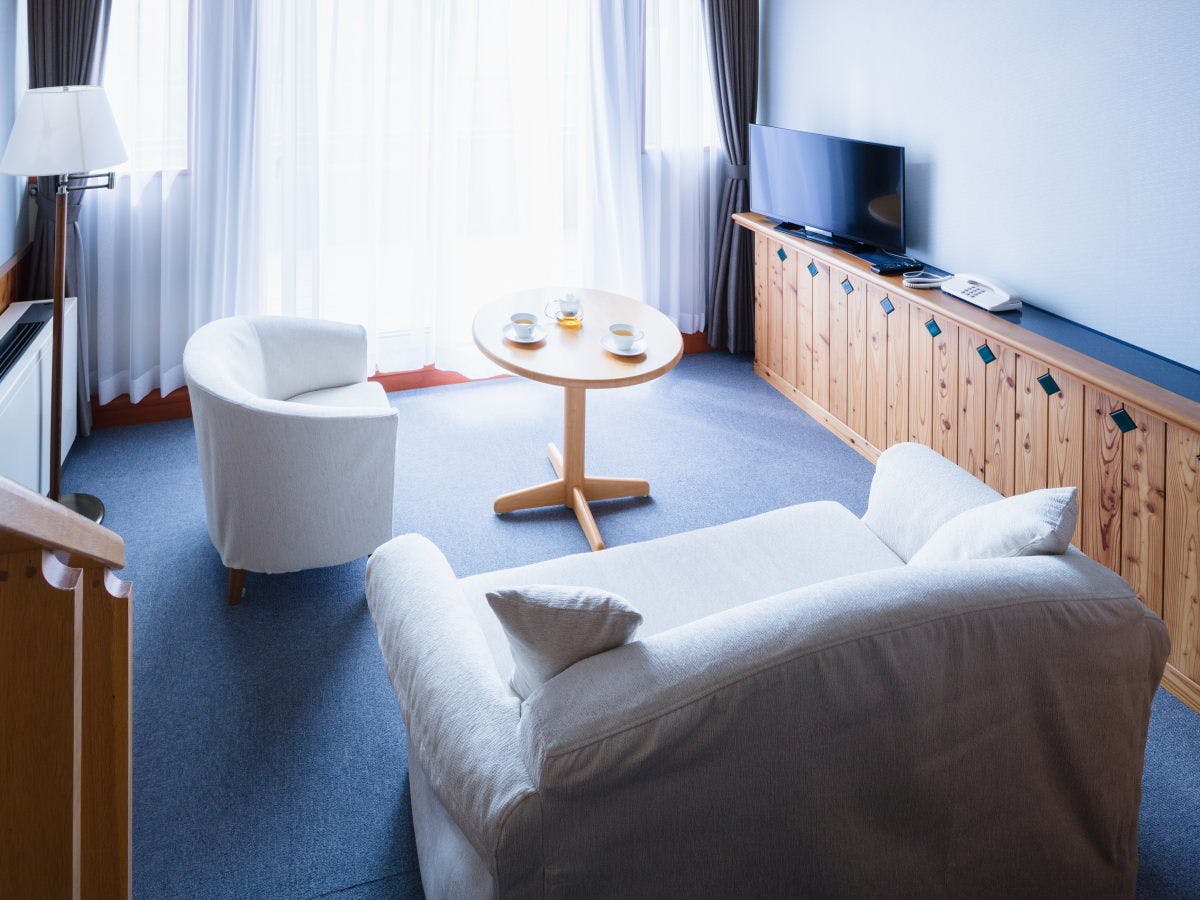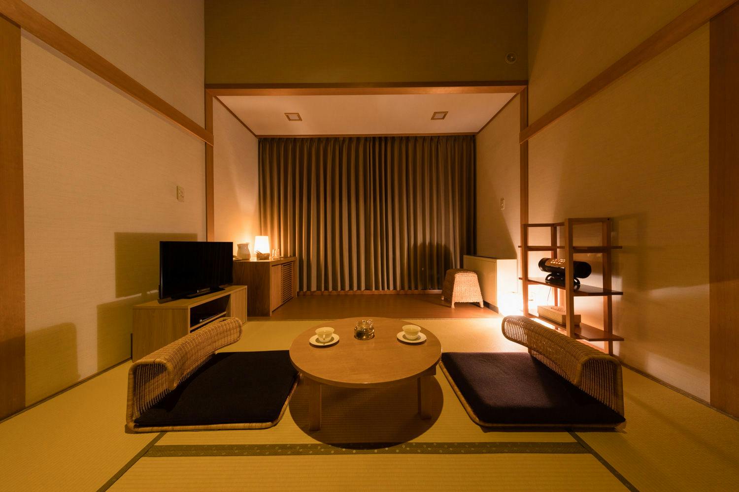 1階がリビングとバルコニー・2階がベッドルームのメゾネットタイプの造りになっております。ベッドに寝転ぶと大きな窓から美しい自然の景色が望めます。3名様からは1階和室にお布団をご用意いたします。