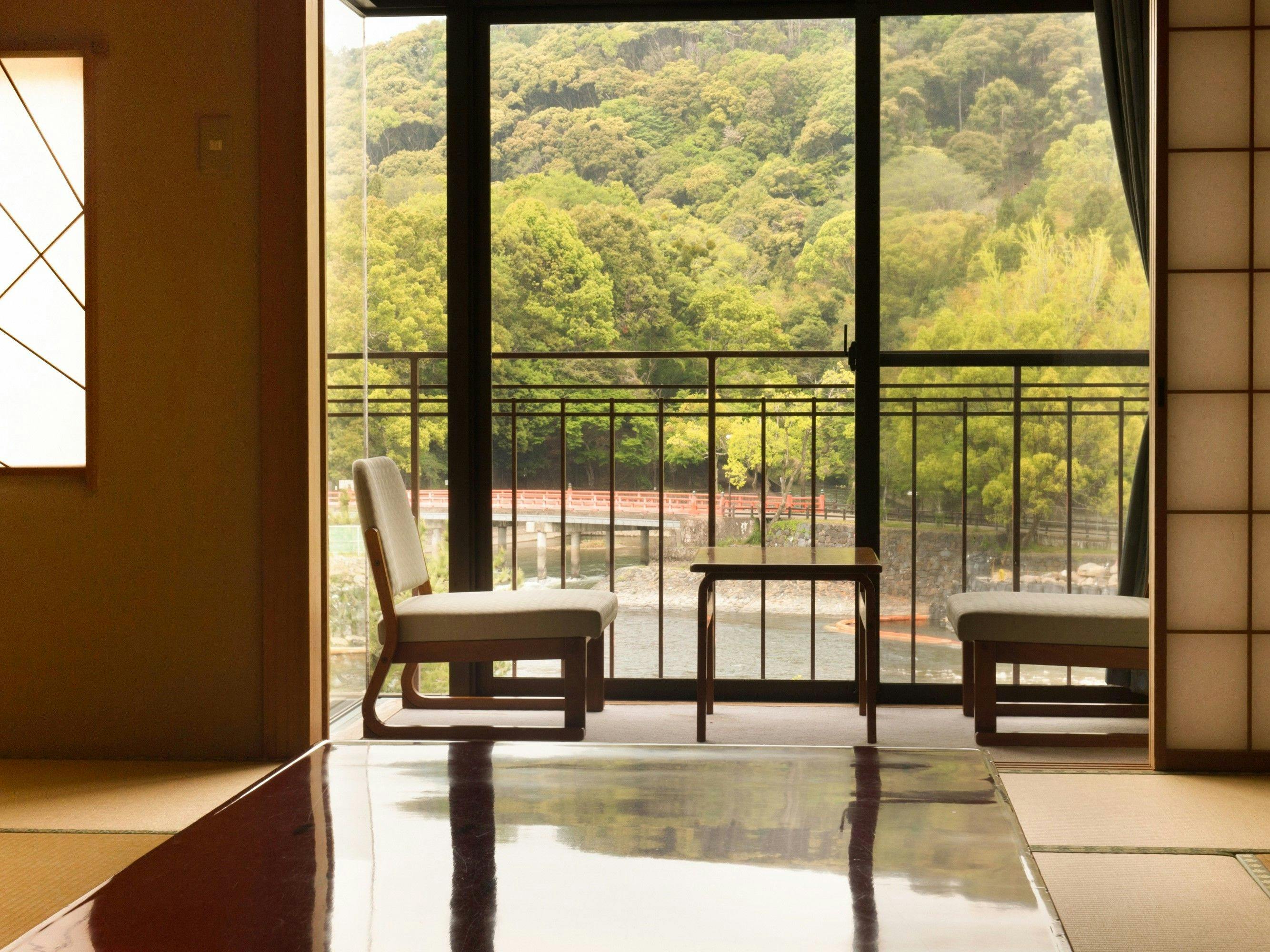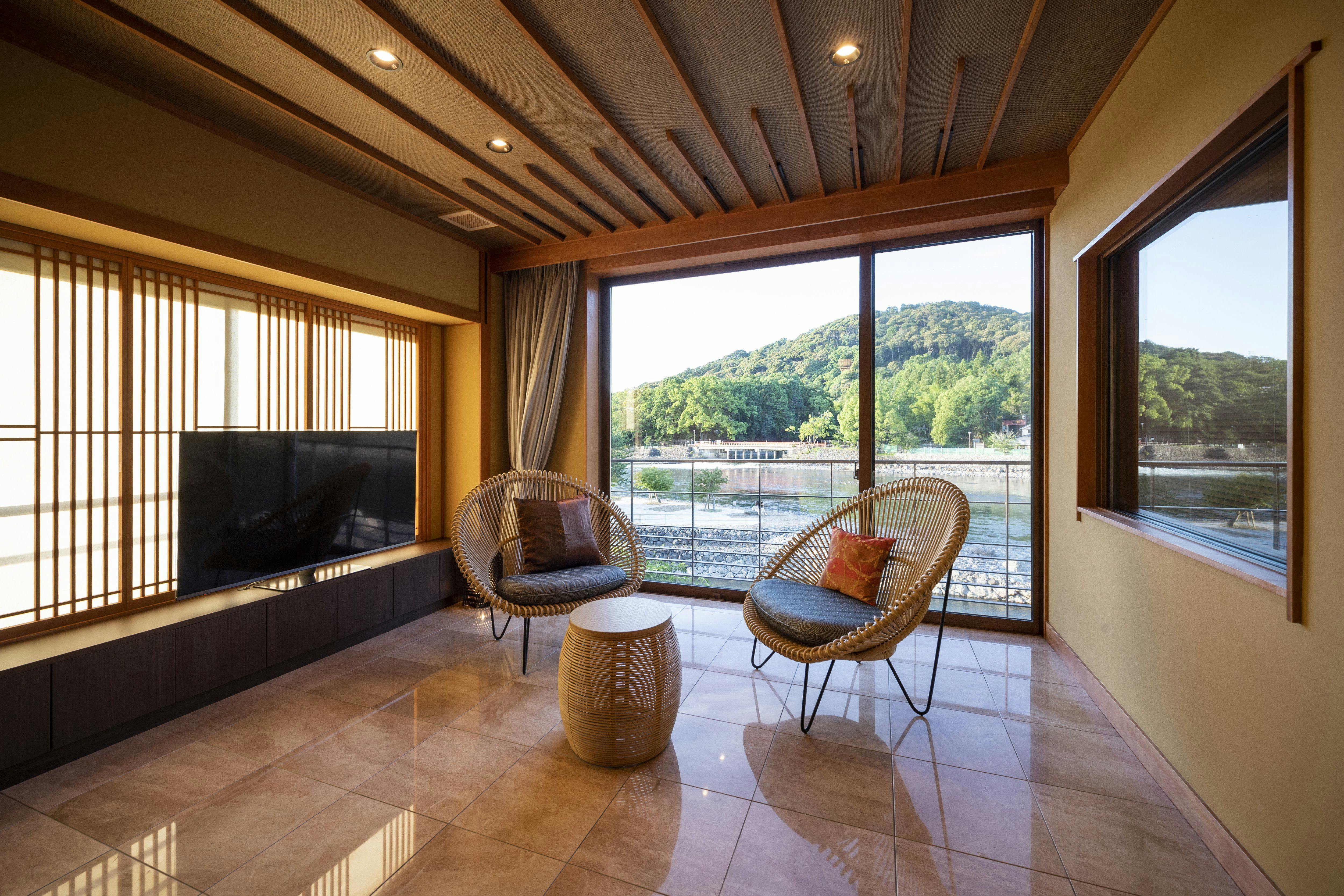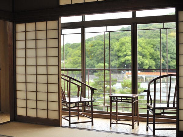 宇治川の景色を一望できる全面ガラス張りのテラス・半露天風呂付きのお部屋です。