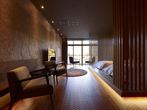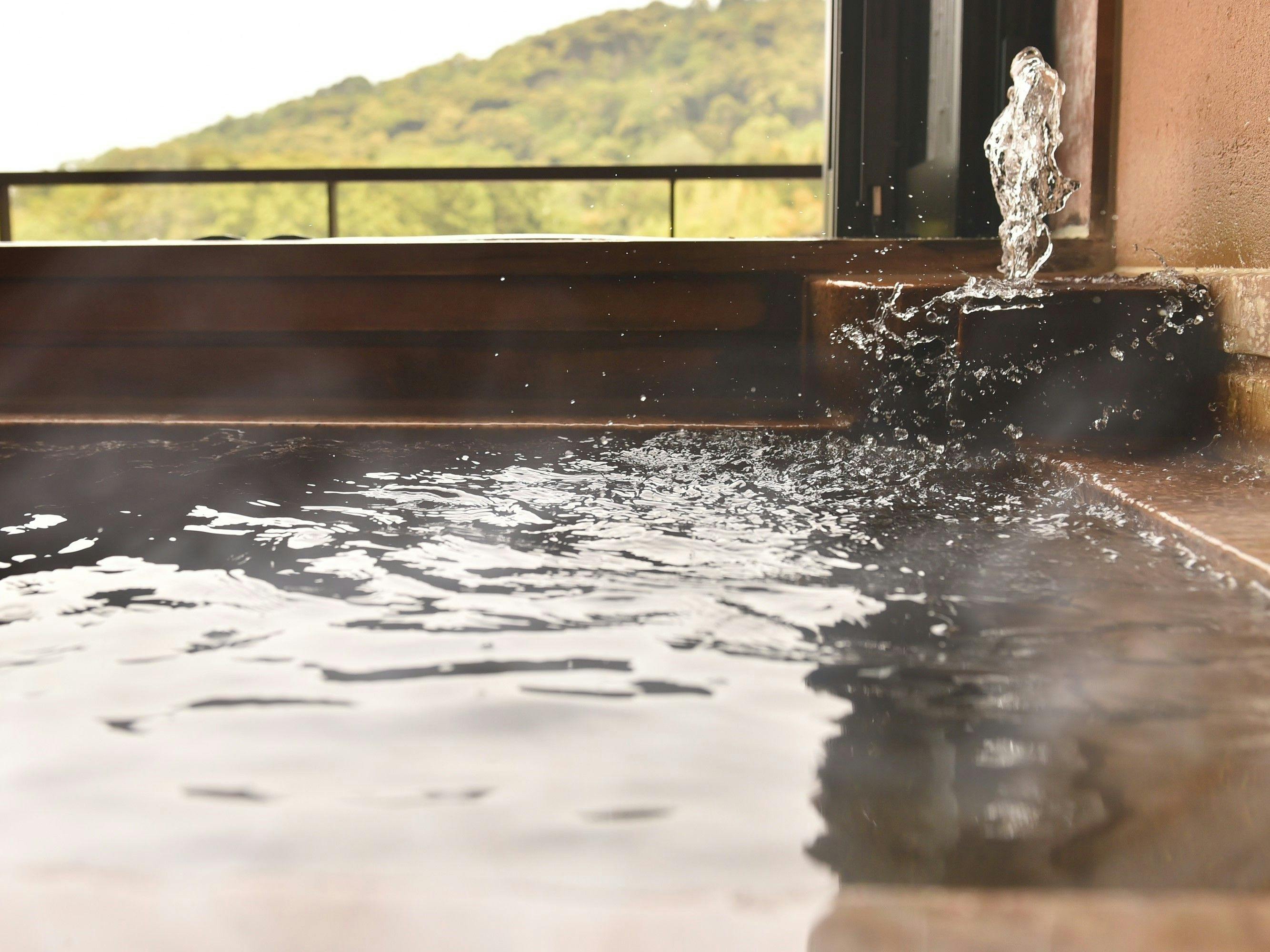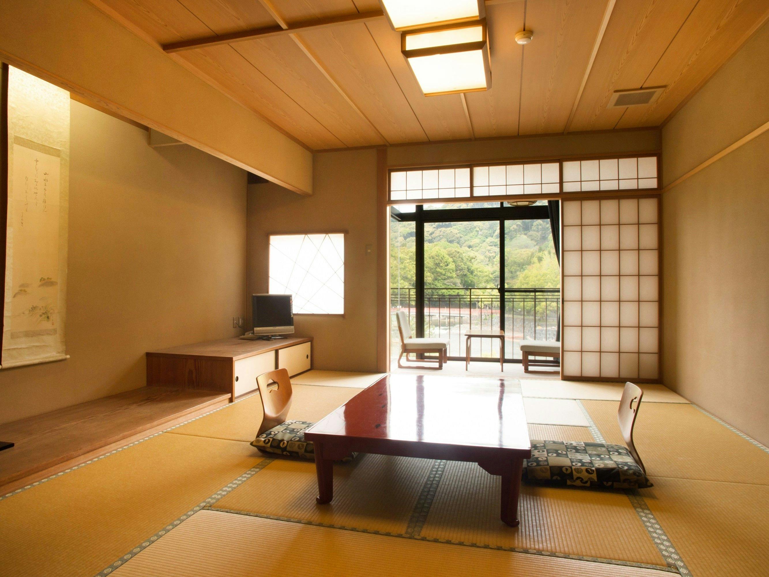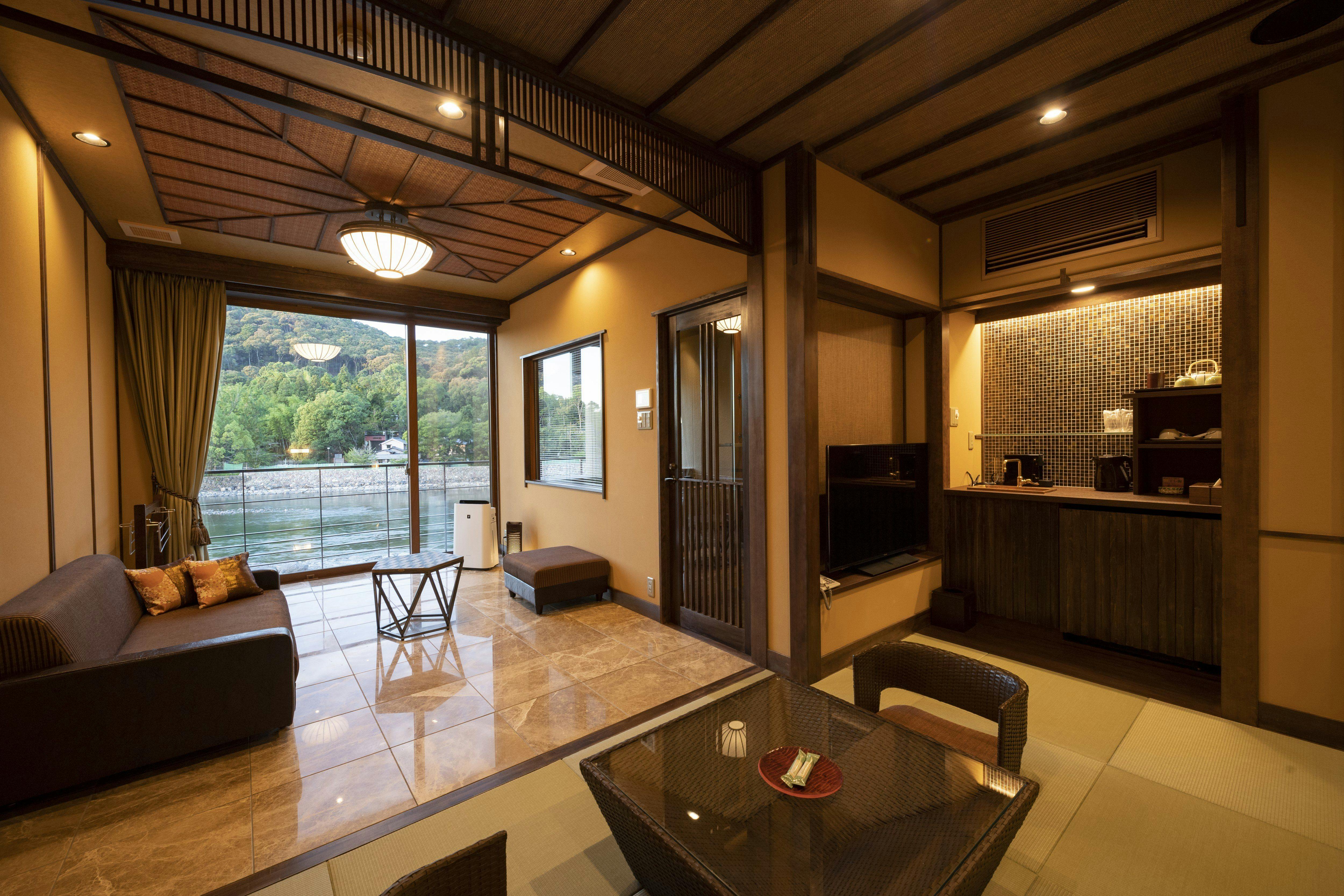 宇治川の景色を一望できる全面ガラス張りのテラス・半露天風呂付きのお部屋です。