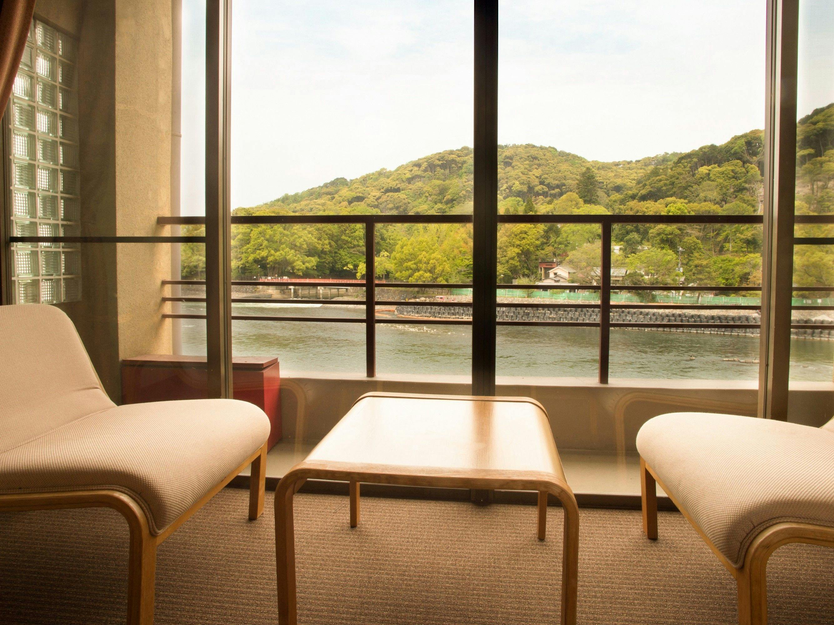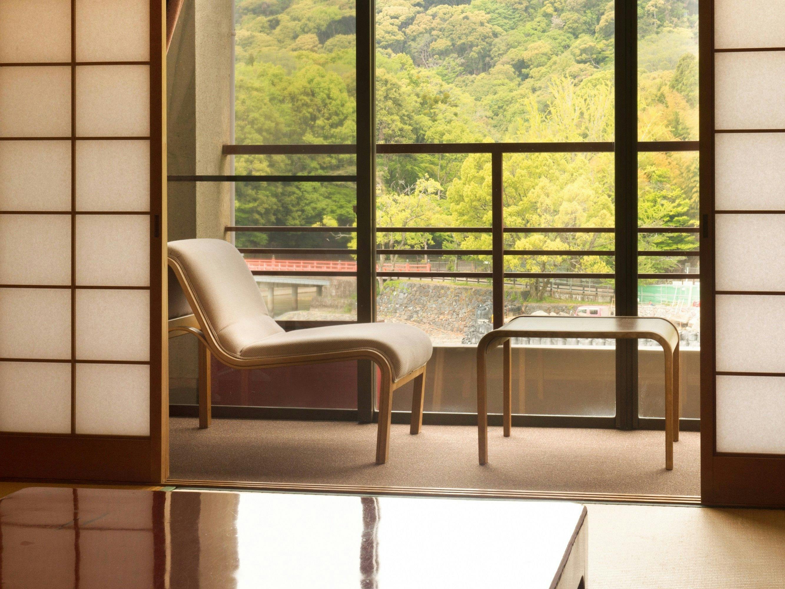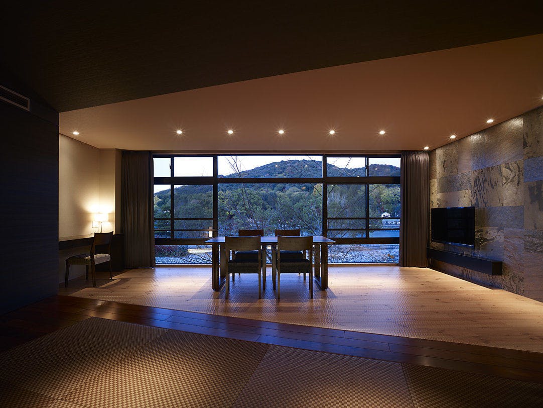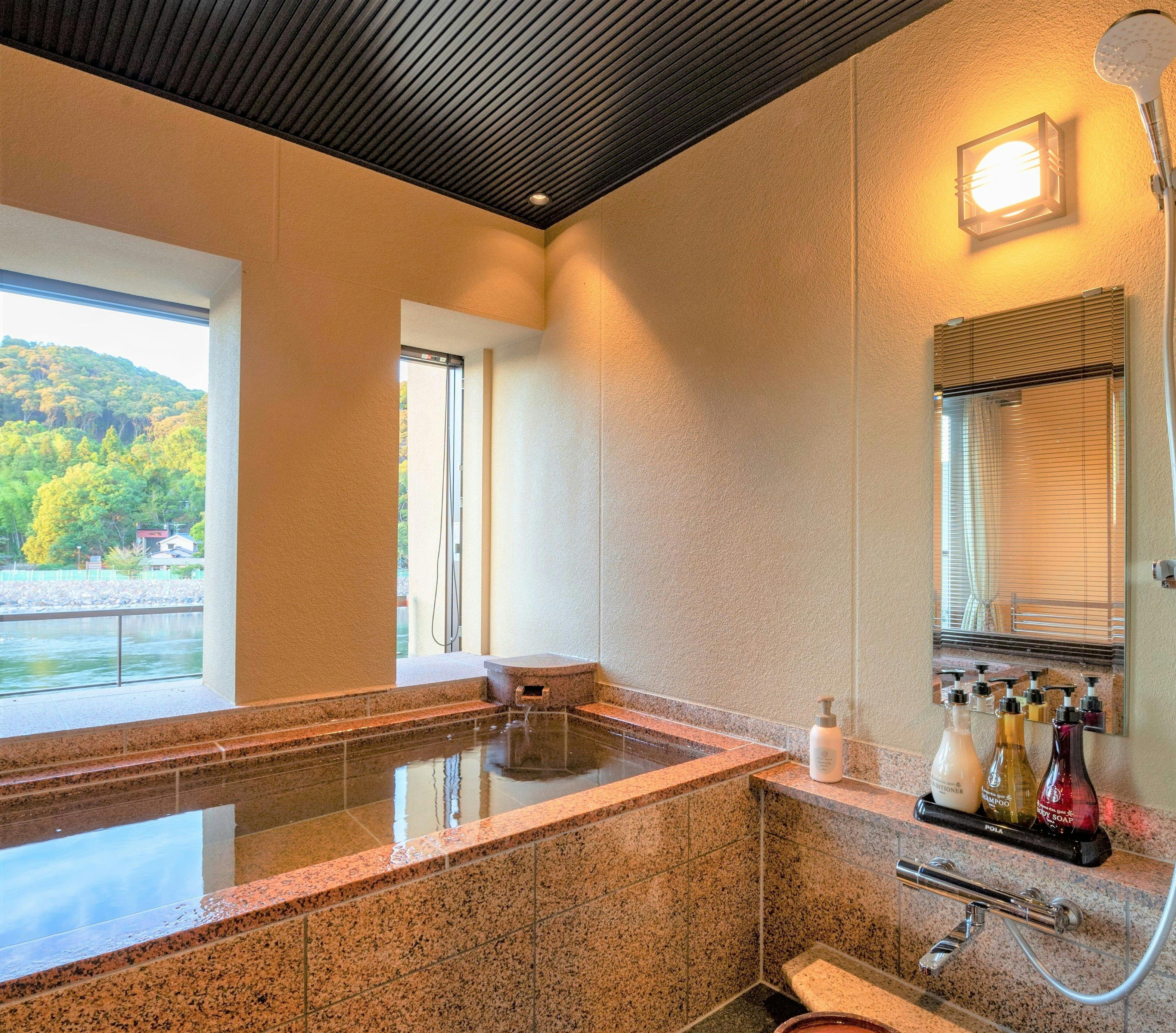 全面ガラス張りの窓から宇治川と京都の季節の風景を楽しめ、そしてバスルームからも宇治川周辺の風景を眺めることができます。
